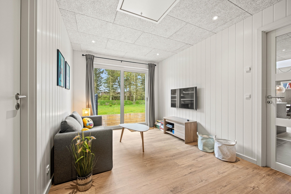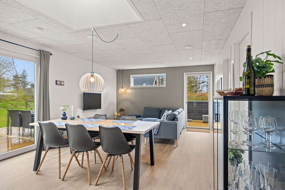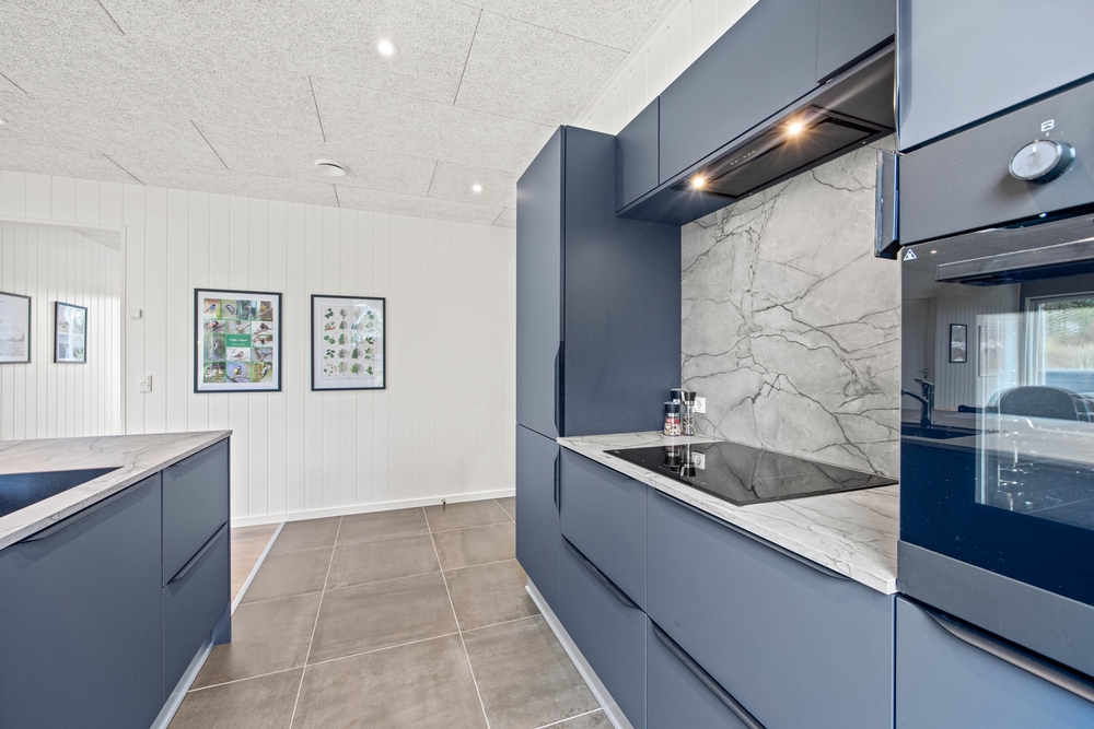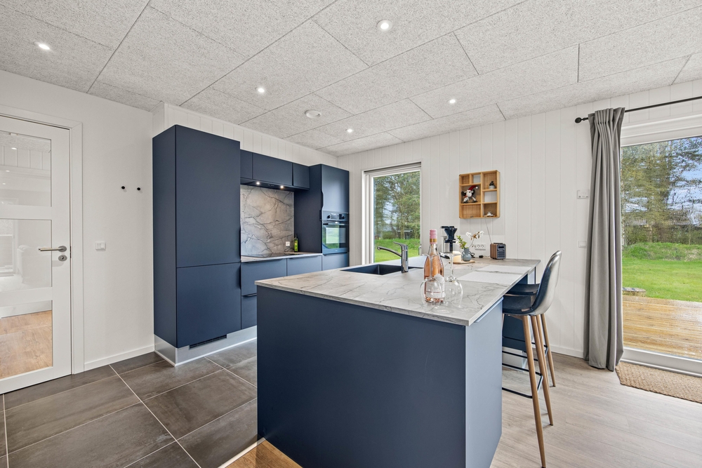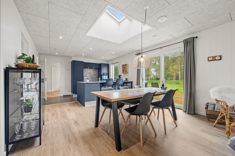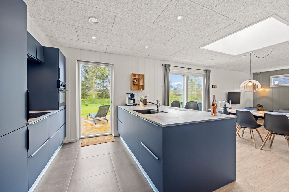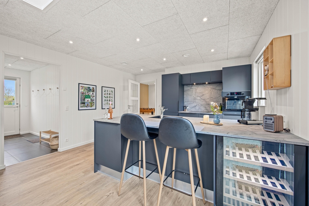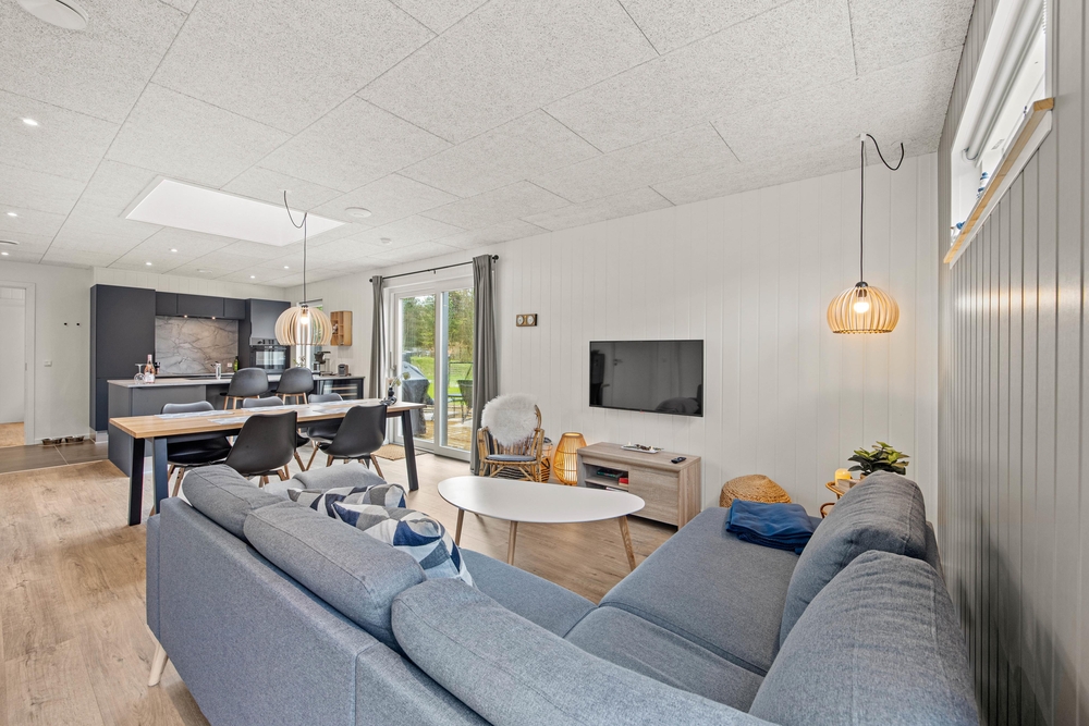 Det flotte køkken ligger centralt i sommerhuset og her kan I helt sikkert lave en masse lækkerier. Bagefter hjælper opvaskemaskinen jer med at tage opvasken, så I har mere tid til nærvær og hygge. Børnene kan være med i køkkenet eller fordrive tiden ved spisebordet med et puslespil eller et spil. Huset opvarmes med en energirigtig luft-til-vand varmepumpe, så der er gulvvarme i hele huset. Om aftenen kan I sætte jer sammen i stuen og streame jeres yndlingsfilm på tv?ets Chromecast.