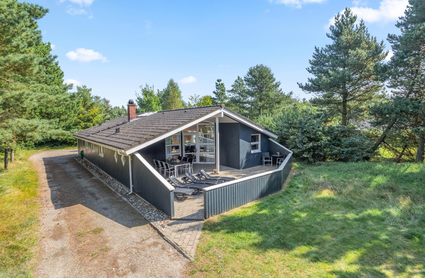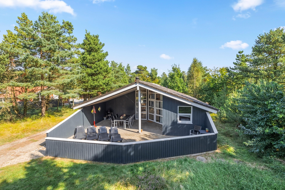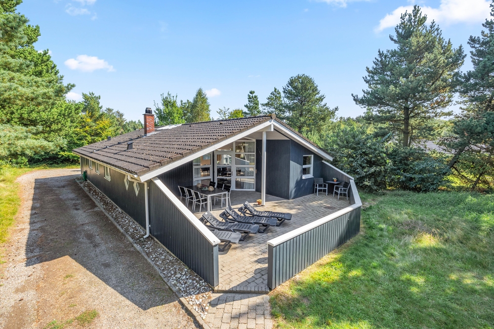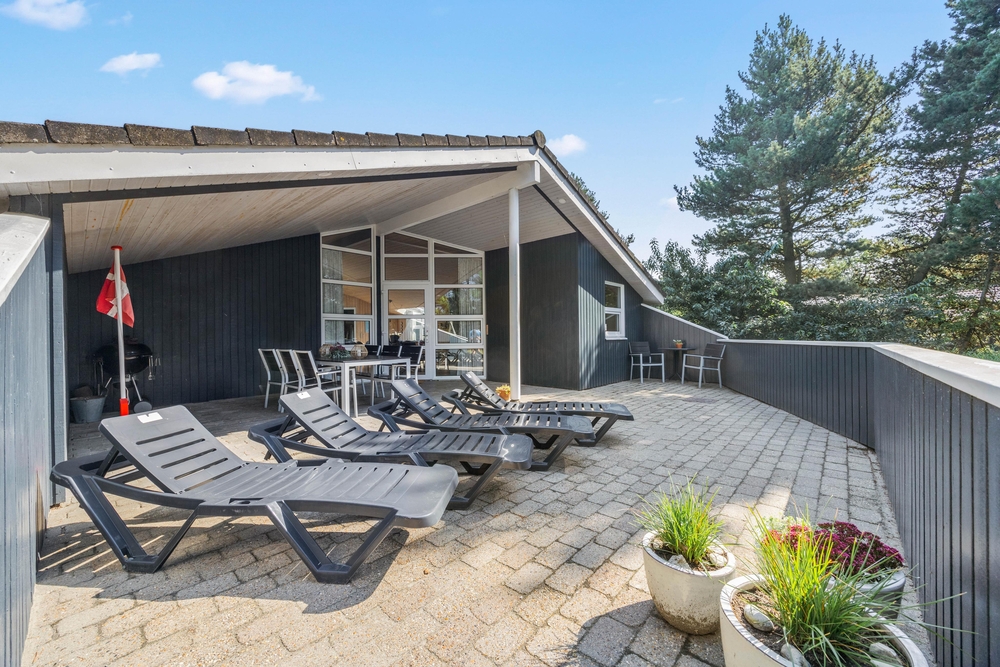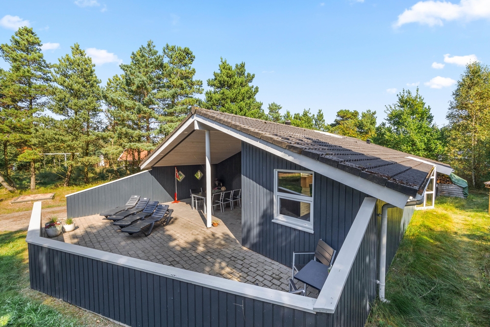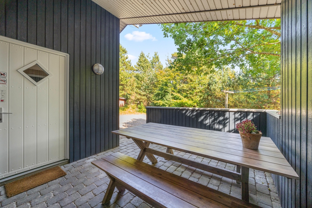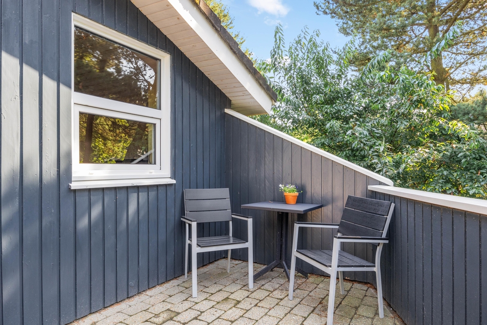 På den store flisebelagte terrasse er der endnu en hyggekrog, ligesom der på modsatte side af feriehuset er en lille terrasse, hvor morgenkaffen kan nydes til fuglesang.