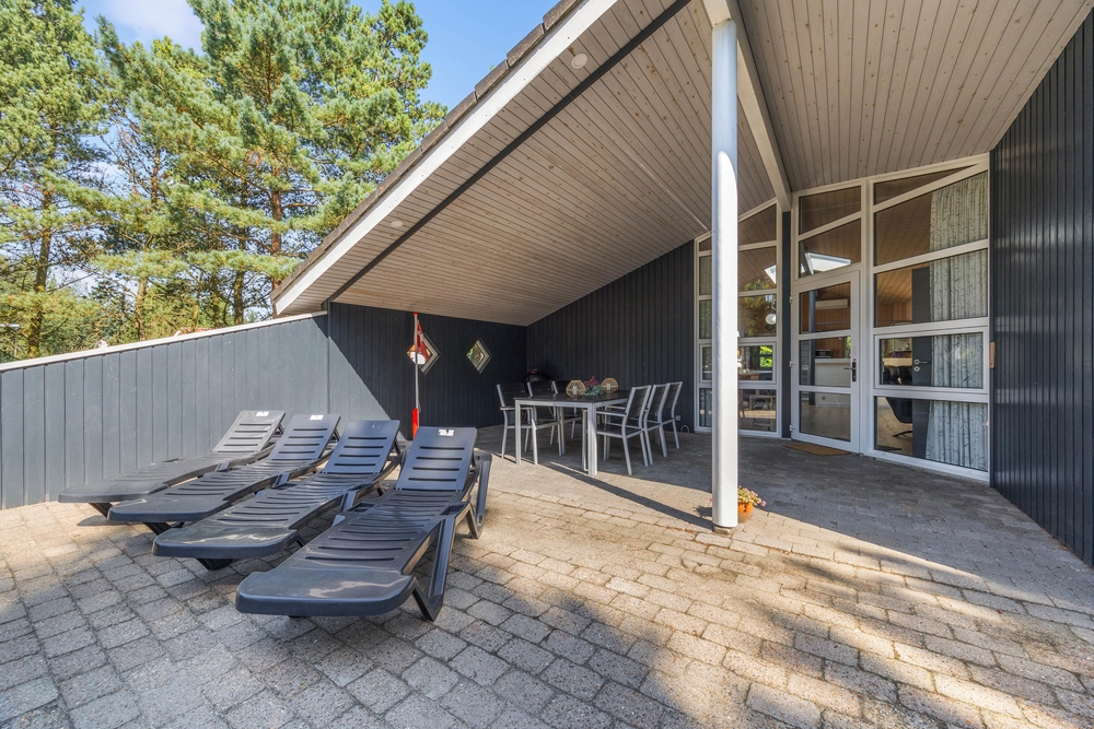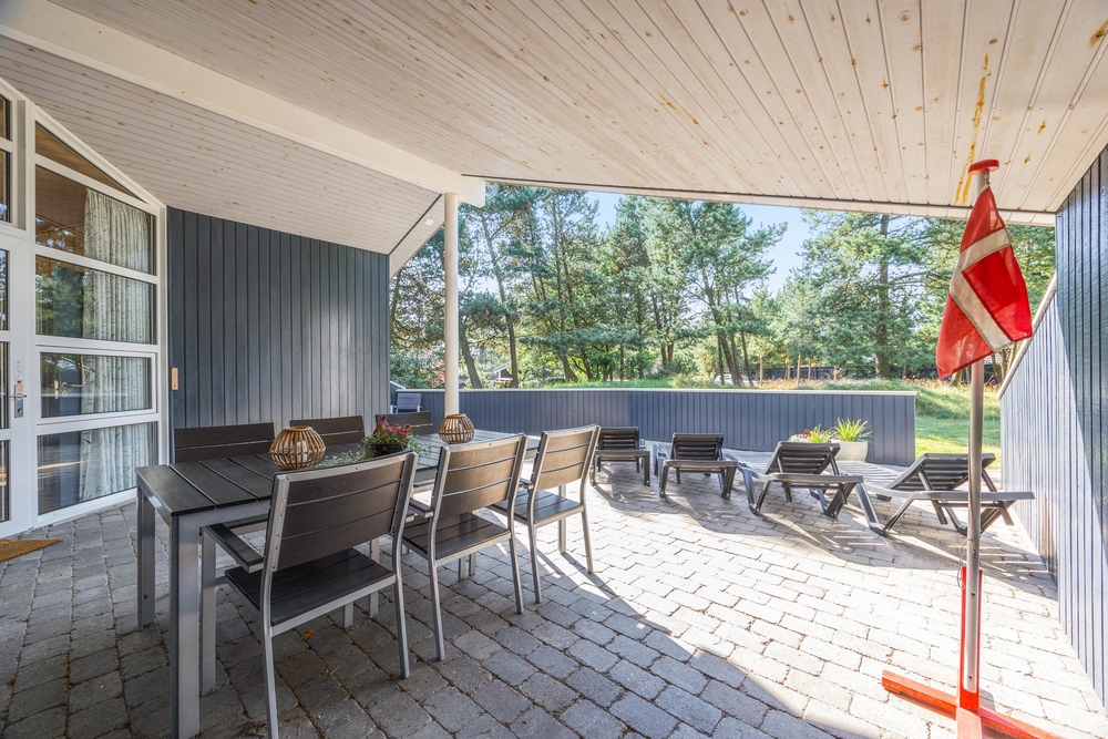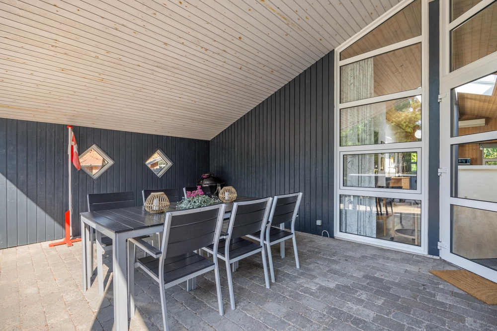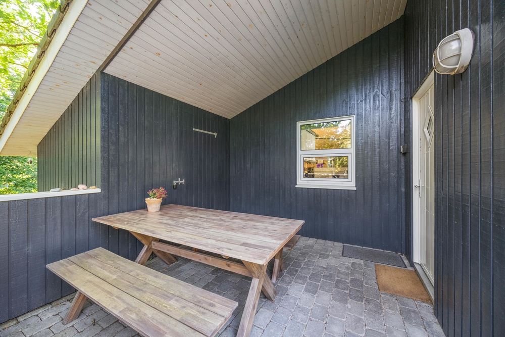 Fra stuen er der udgang til en dejlig overdækket terrasse, hvor I kan søge skygge for sol eller ly for en lille regnbyge. Nyd også her en lækker middag fra grillen, mens aftenen falder på og himlen farves rød af solnedgangen.