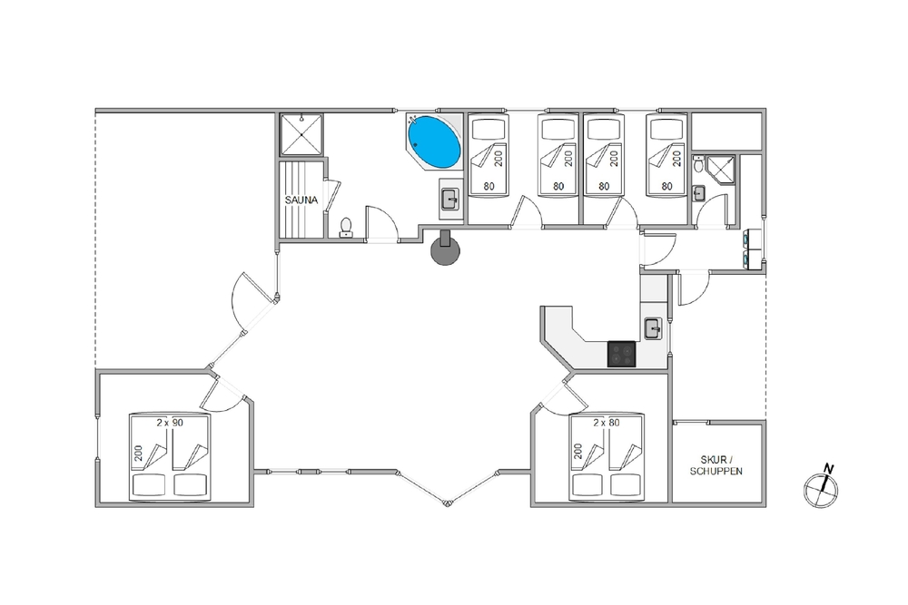 Køkkenet er lyst og indbydende og har god plads til, at I kan hjælpes af med lækre anretninger ? måske har I købt ind hos Blåvands gode slagter eller specialforretninger. Fra køkkenalrummet er der adgang til de 4 soveværelser med enten dobbeltsenge eller enkeltsenge. Her kan I linde vinduerne lidt og falde i søvn til trækronernes susen og den friske vesterhavsluft og vågne friske til næste dags oplevelser.