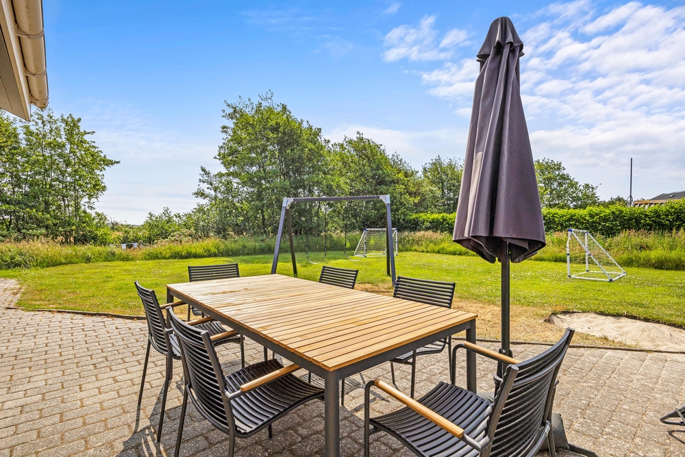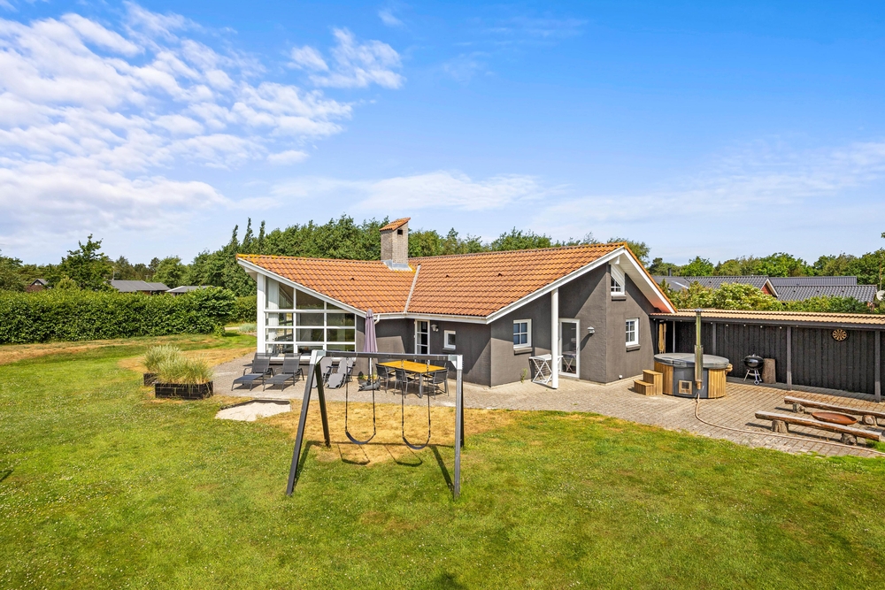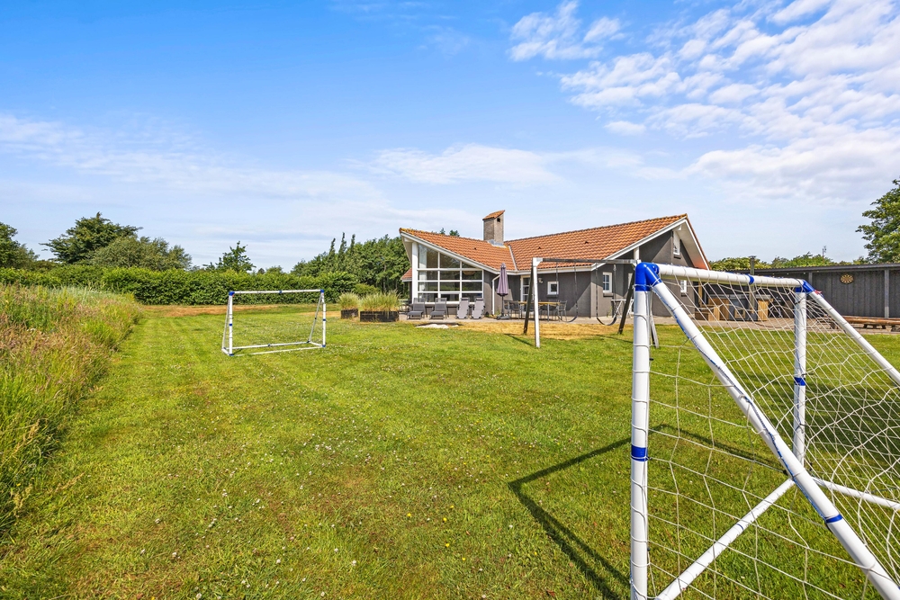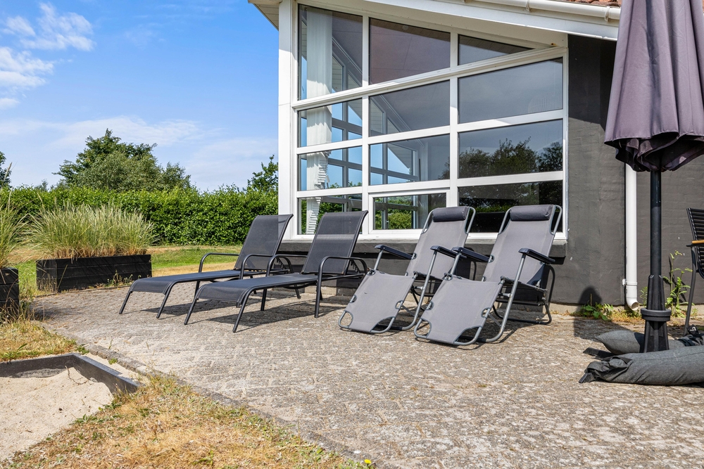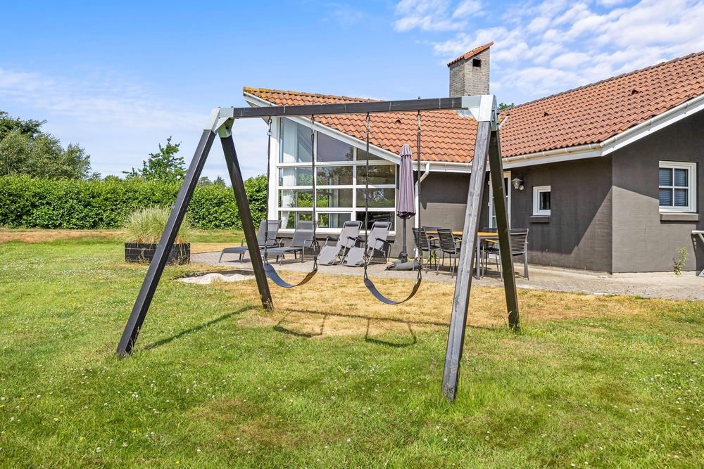 Sommerhuset byder desuden på et skønt udeområde, hvor både store og små kan tilbringe feriens solrige dage. På terrassen har I havemøbler og liggestole til rådighed, som I kan læne jer godt tilbage i på en god plads i solen. Imens kan børnene lege i haven, hvor der både er et gyngestativ, en sandkasse og fodboldmål.