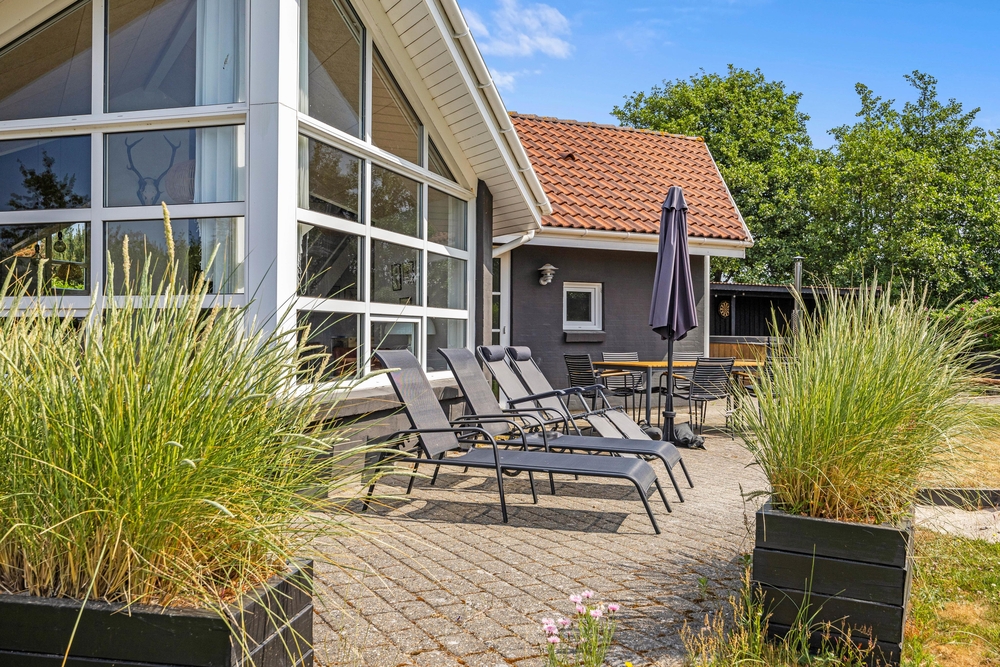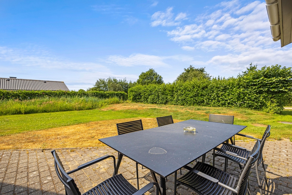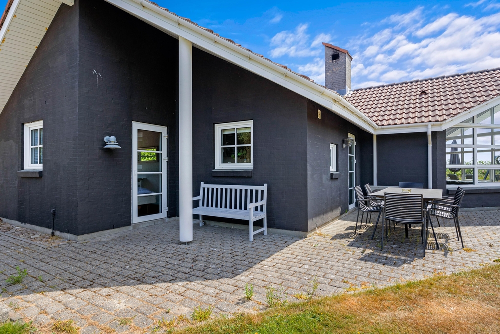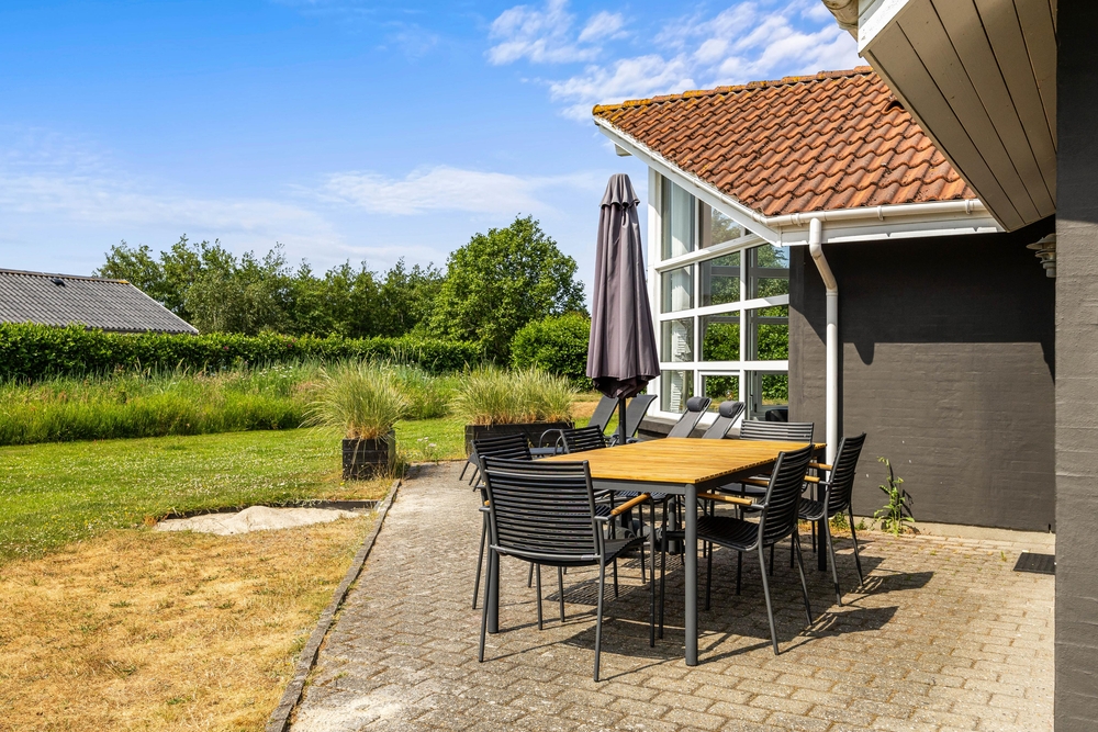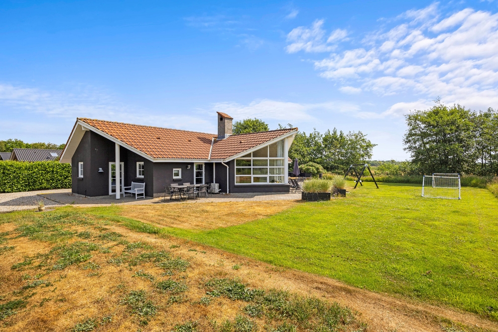 Sommerhuset byder desuden på et skønt udeområde, hvor både store og små kan tilbringe feriens solrige dage. På terrassen har I havemøbler og liggestole til rådighed, som I kan læne jer godt tilbage i på en god plads i solen. Imens kan børnene lege i haven, hvor der både er et gyngestativ, en sandkasse og fodboldmål.