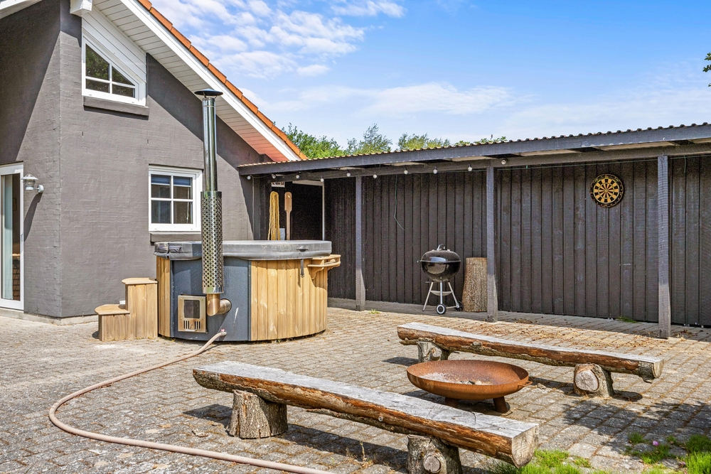 Også udendørs har I mulighed for virkelig at få slappet af, da der på sommerhusets terrasse står et vildmarksbad. Her kan I nyde masser af afslapning i det varme vand under åben himmel. I kan også sætte jer i vildmarksbadet om aftenen, hvor I kan nyde en afslappende stund under stjernehimmelen.