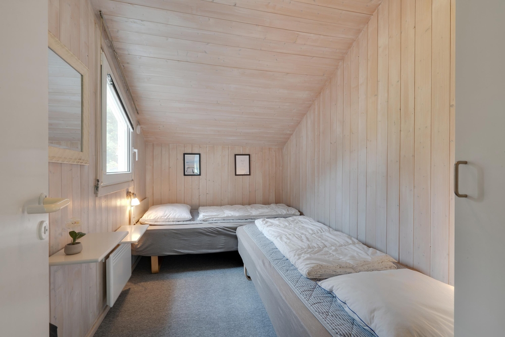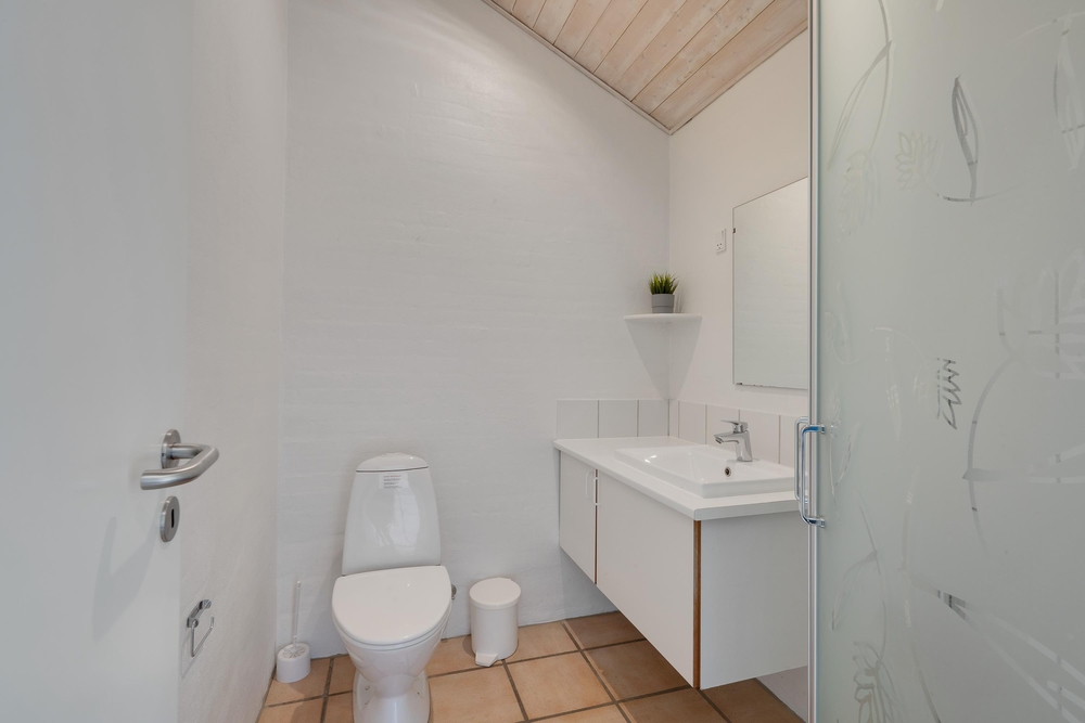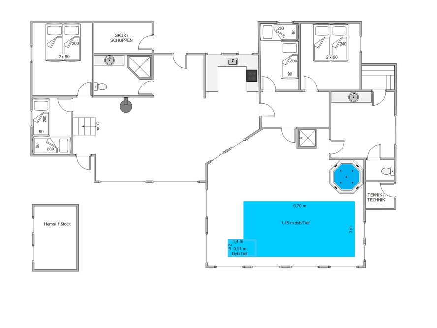Poolhuset rummer 4 soverum og en skøn hems, oveni er der også to toiletter, så der ikke bliver kø om morgenen. Fra køkkenet er der direkte adgang til stuen, så I er samlet i det samme rum, selvom nogle laver aftensmaden, andre sidder i sofaen og hygger, og de sidste spiller kort ved spisebordet.