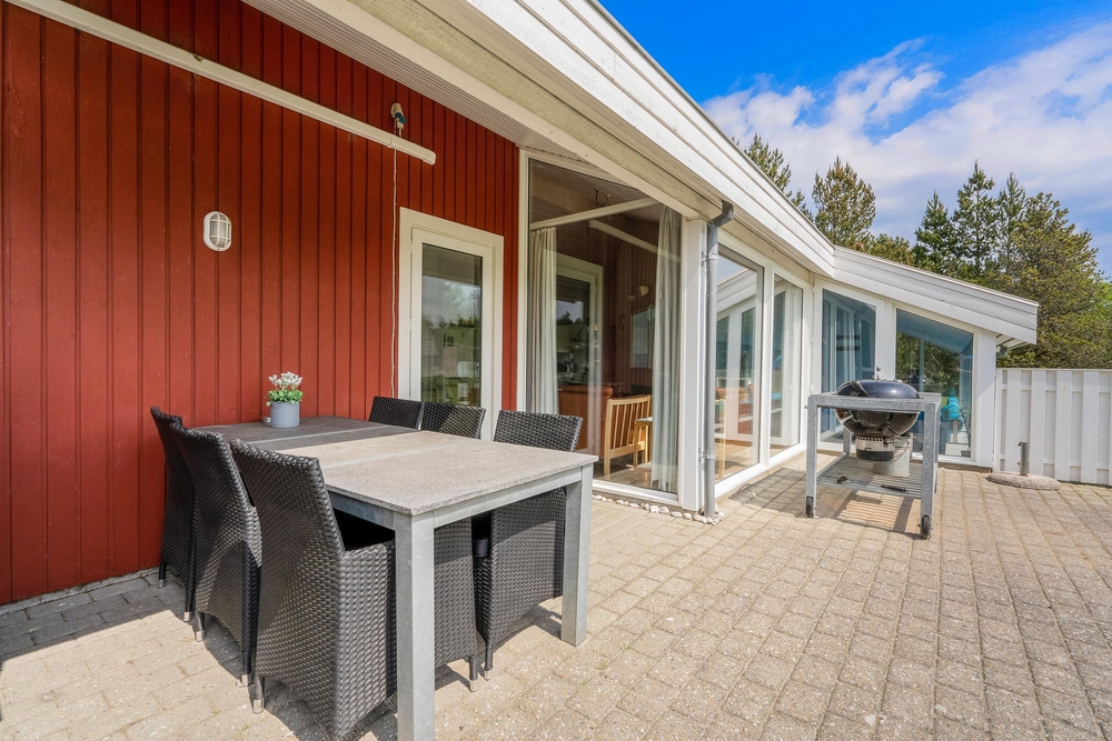 Den tilhørende terrasse er både delvis afskærmet og overdækket, så I kan sidde udenfor til langt ud på aftenen. Der står både grill, havemøbler, solvogne og parasol til rådighed for jer, så det er ingen sag at bruge en dag i solen med sådan en have.