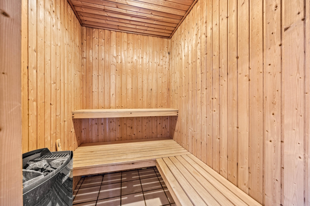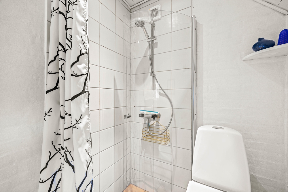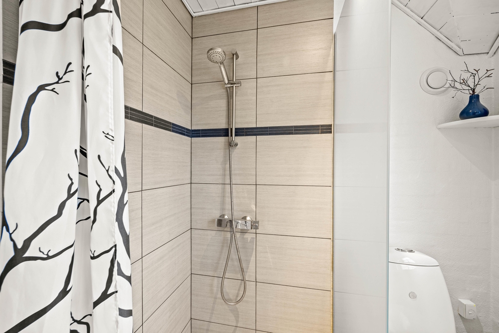 I stueetagen finder I de 2 badeværelser med gulvvarme samt 2 af soveværelserne med dobbeltsenge. Det tredje soveværelse med dobbeltseng og det hyggelige soveværelse med 3 enkeltsenge ligger på 1. sal. I feriehuset er der desuden både vaskemaskine og tørretumbler til rådighed.
