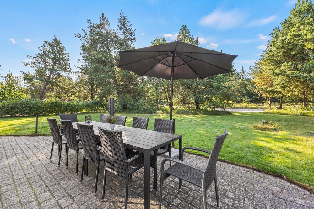 Sommerhuset ligger på en skøn plænegrund, som er delvist afskærmet af buske og træer. Den store terrasse indbyder til afslapning, og her står havemøbler, liggestole og grill klar til jer. Snup din yndlingsbog, nyd solen og en kølig drink, mens børnene leger i sandkassen eller gynger.