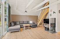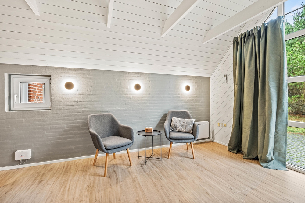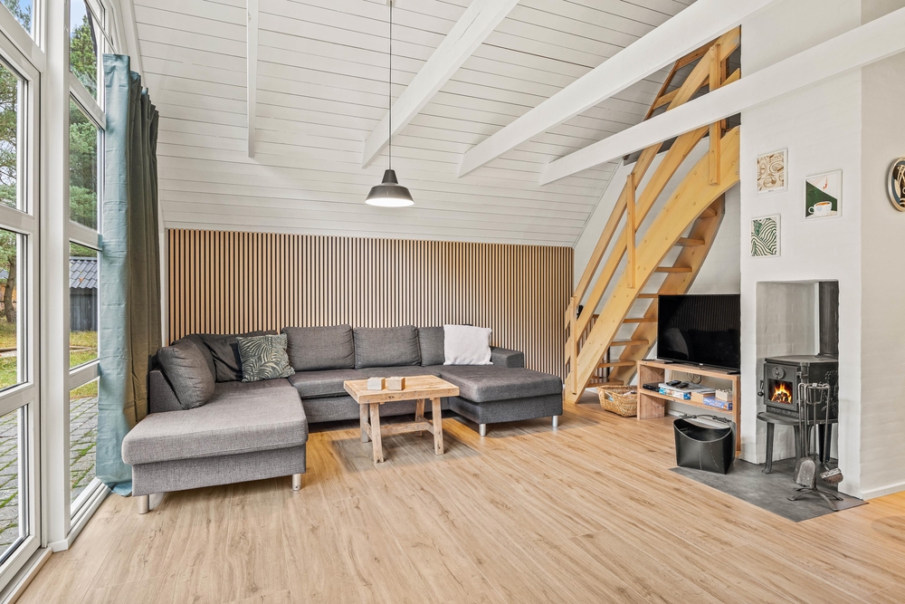 Stuen er indrettet med store møbler, der giver rigelig plads til hele familien. Her kan I nyde aftenerne sammen i komfort og varme ved den hyggelige brændeovn.