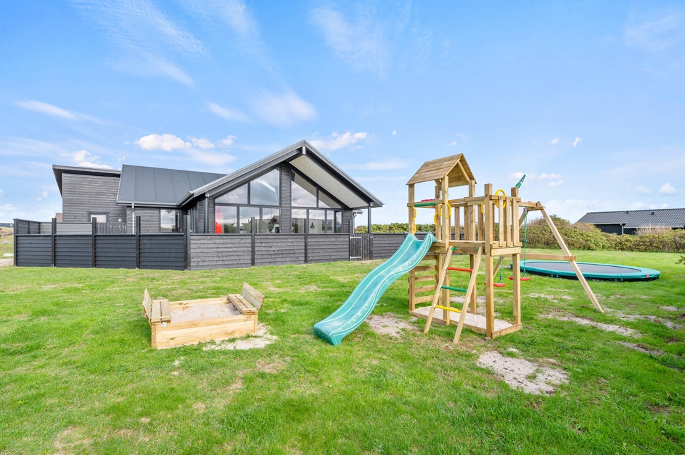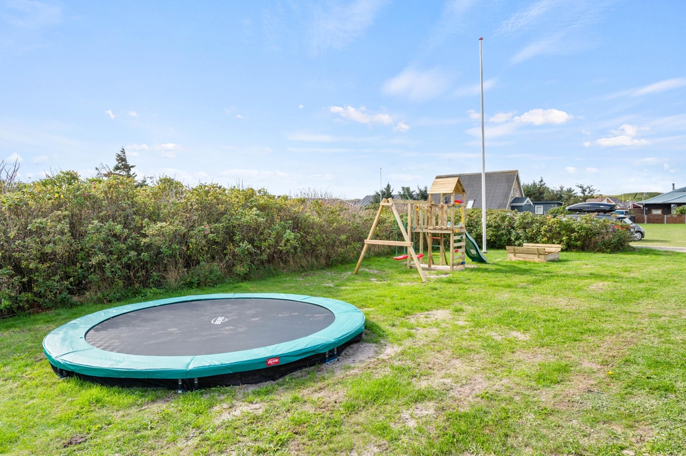 Huset ligger på en skøn plænegrund, som er meget velegnet til leg for børnene eller en rask fodboldkamp mellem de to opstillede fodboldmål. Der er også gynge og en sandkasse til de helt små. De voksne kan nyde børnenes leg fra den skønne terrasse, som er delvist overdækket mod syd.