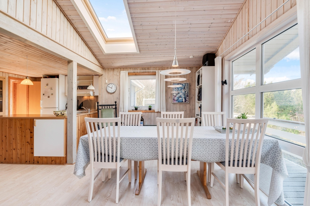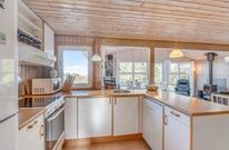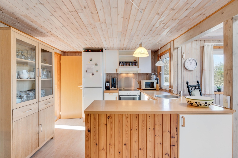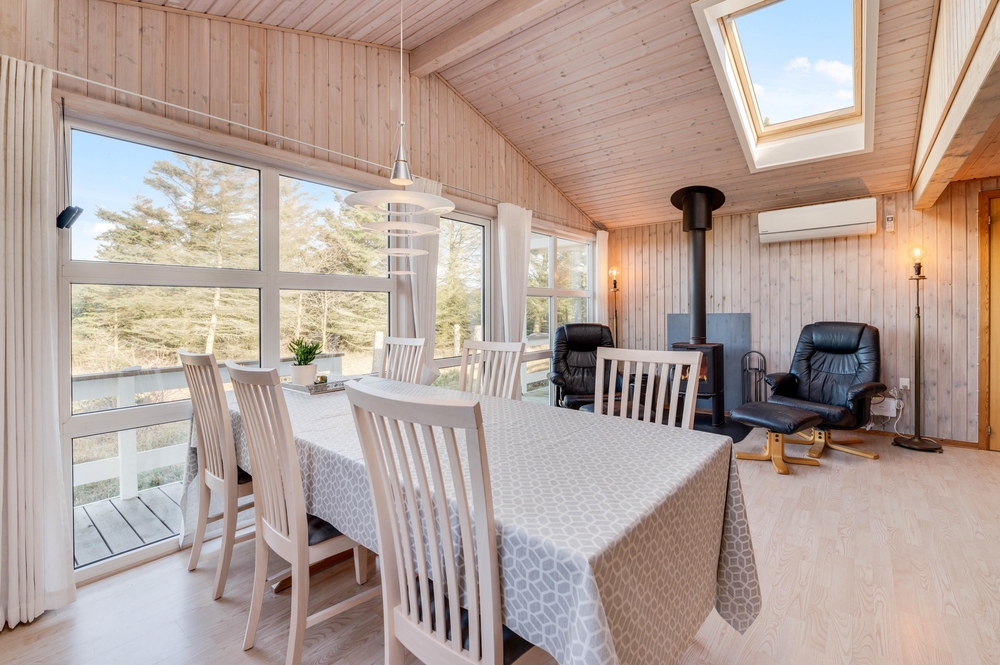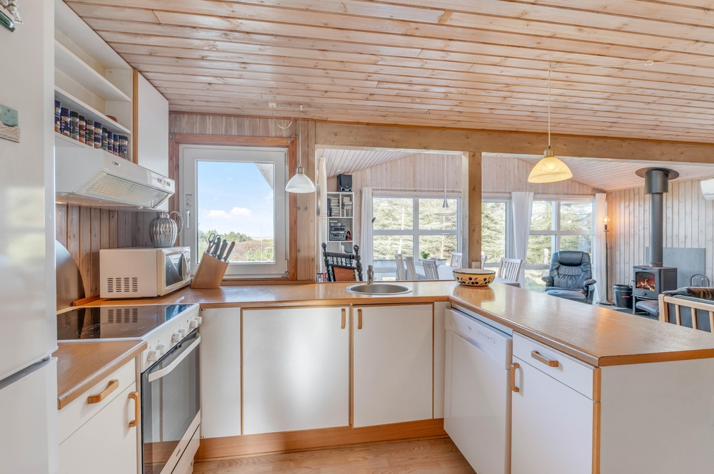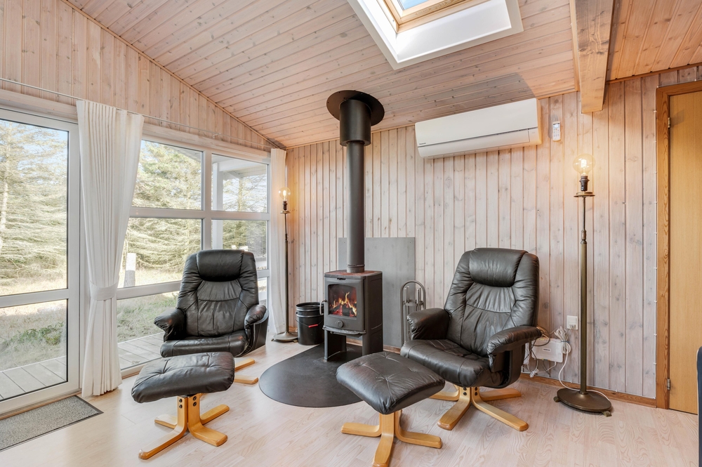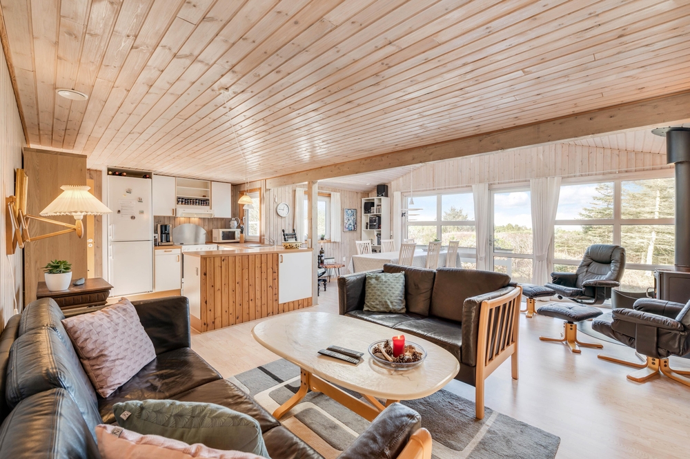 Hjerterummet i feriehuset er den store stue, som ligger i åben forbindelse med køkkenet og spisestuen. Her kan I lægge de næste ferieplaner, lave mad sammen eller blot hygge jer med en god bog. Brændeovnen i feriehuset sørger for den helt rigtige feriehusstemning og bidrager til både varme og hygge på de køligere dage.