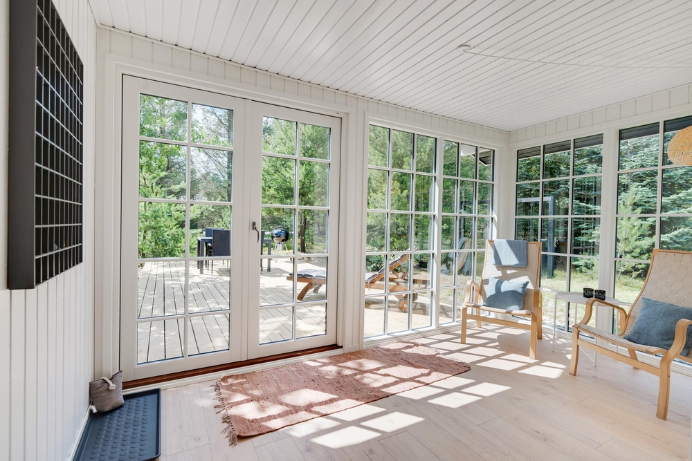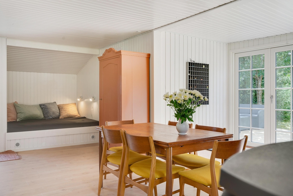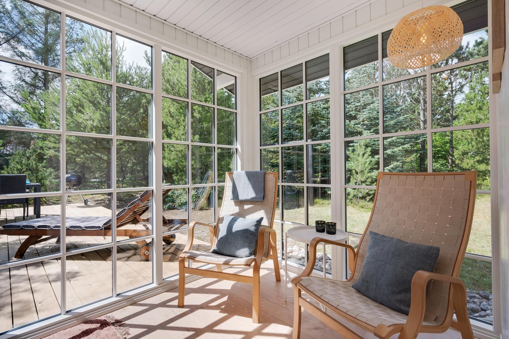 Har I brug for lidt ro eller en time for jer selv med en god bog, er husets udestue indbydende. Her står kurvefletstole samt bord til fri benyttelse. Med dette skønne sommerhus i Houstrup kommer hyggen i centrum.