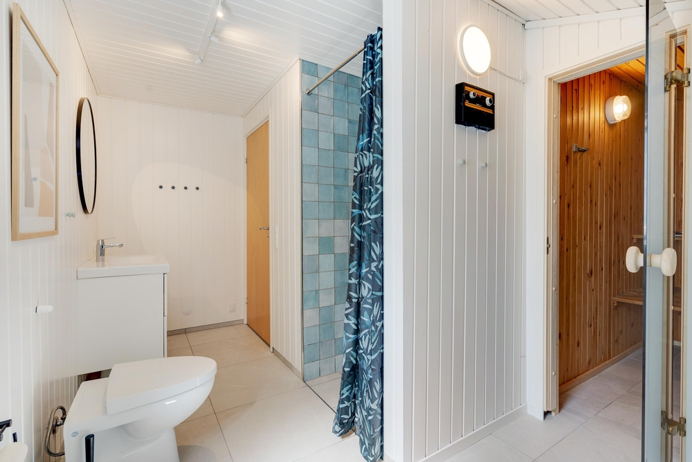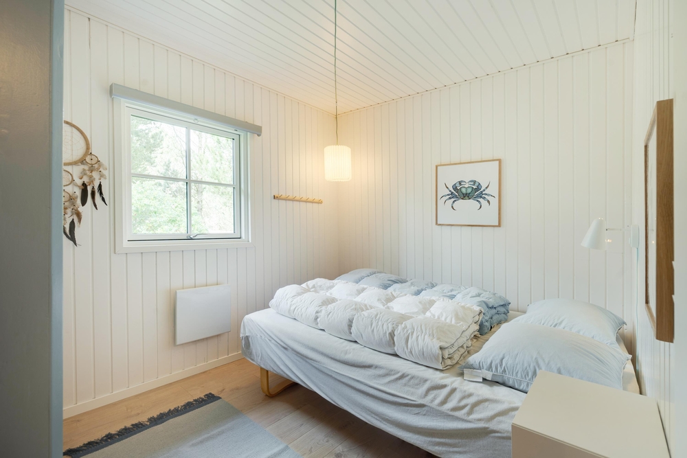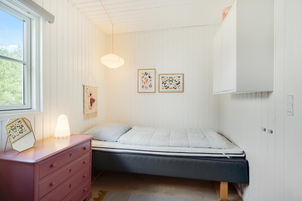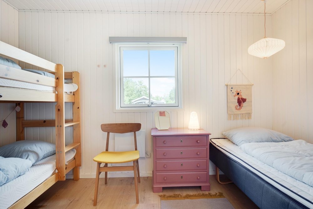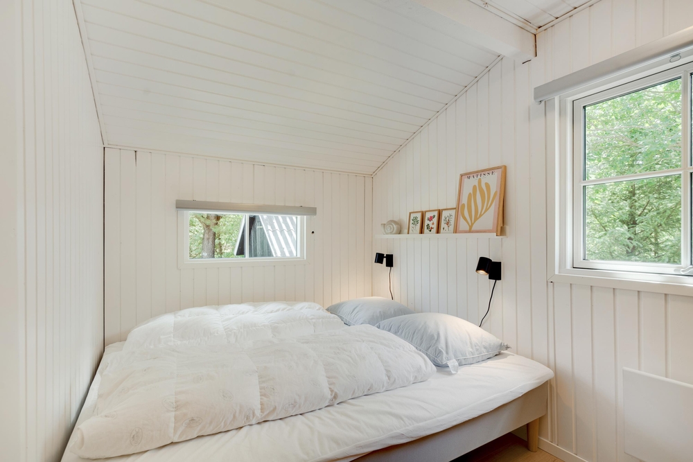 Der er tre soveværelse med gode skabsrum. I to af værelserne har I dobbeltsenge, det tredje værelse er indrettet med en enkeltseng samt en køjeseng. Dertil er der en alkove i alrummet, som egner sig til læsehygge eller en lille ?morfar? efter frokosten. I badeværelset står både vaskemaskine og tørretumbler til jeres rådighed og herfra er der også tilgang til husets sauna.