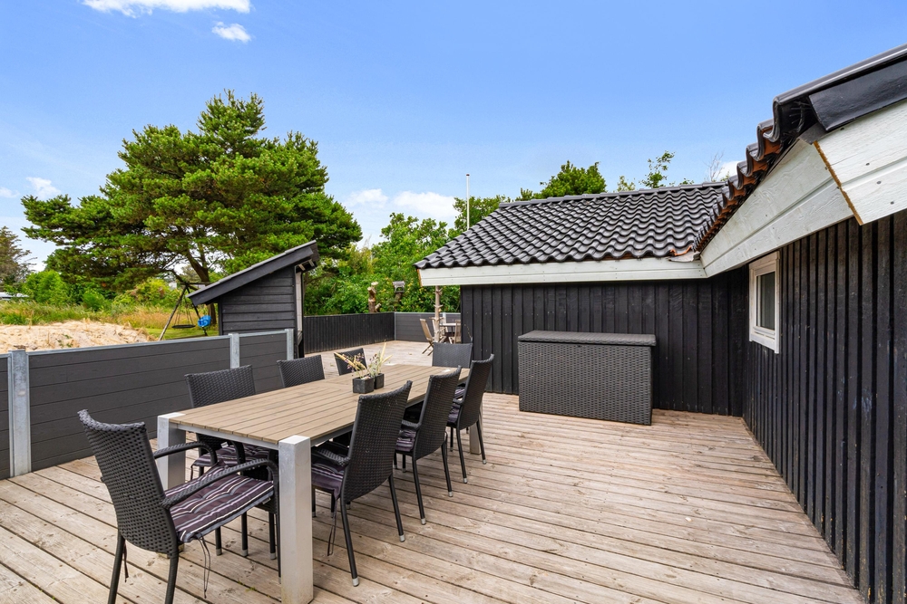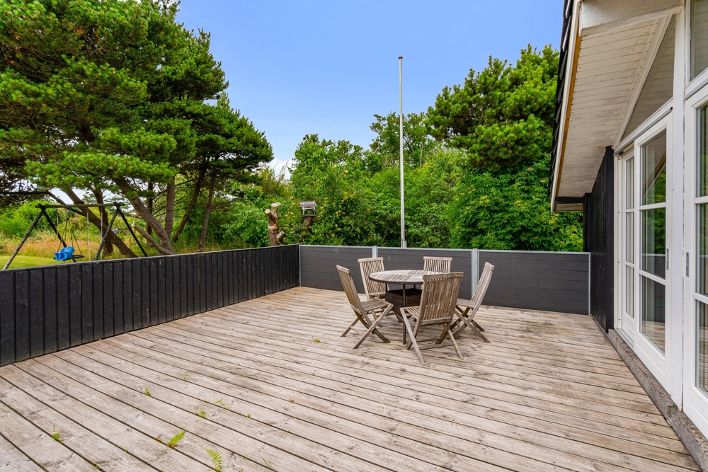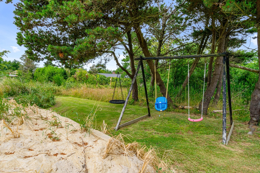Sommerhuset har flere terrasser og er beliggende på en mere end 2.000 kvadratmeter stor plænegrund, der er omkranset af træer og buskads. Der er derfor altid en læfyldt krog at finde, når vejret inviterer til afslapning på terrassen. De yngste feriegæster kan glæde sig over, at grunden også gemmer på et gyngestativ.