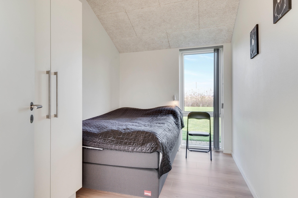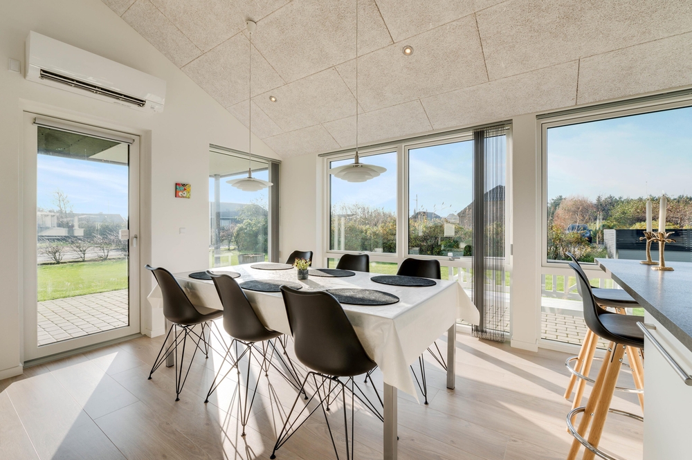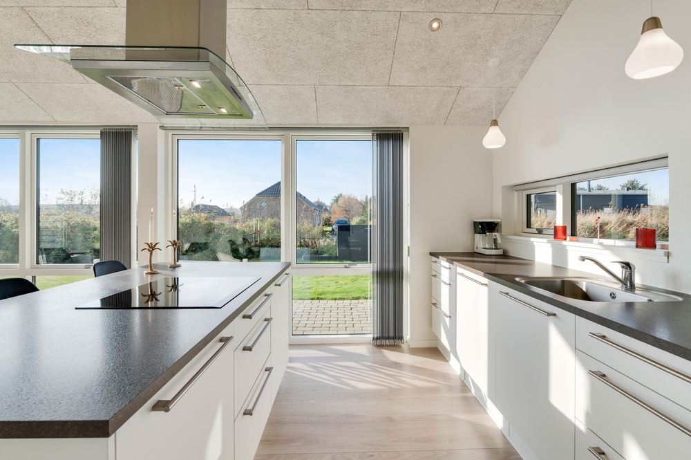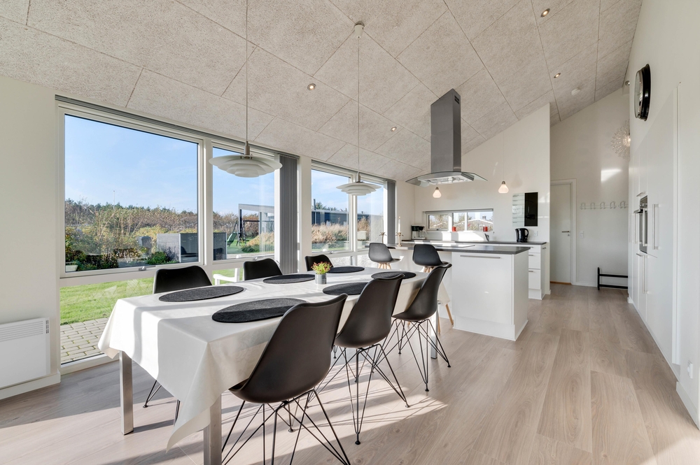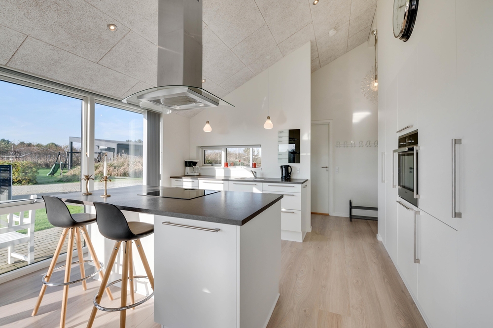 Hjerterummet i ferieboligen er den åbne og lyse stue med integreret køkken. De store vinduespartier tillader en masse lys at strømme ind i boligen og allerede fra morgenstunden af, kan I nyde solens stråler gennem vinduerne.