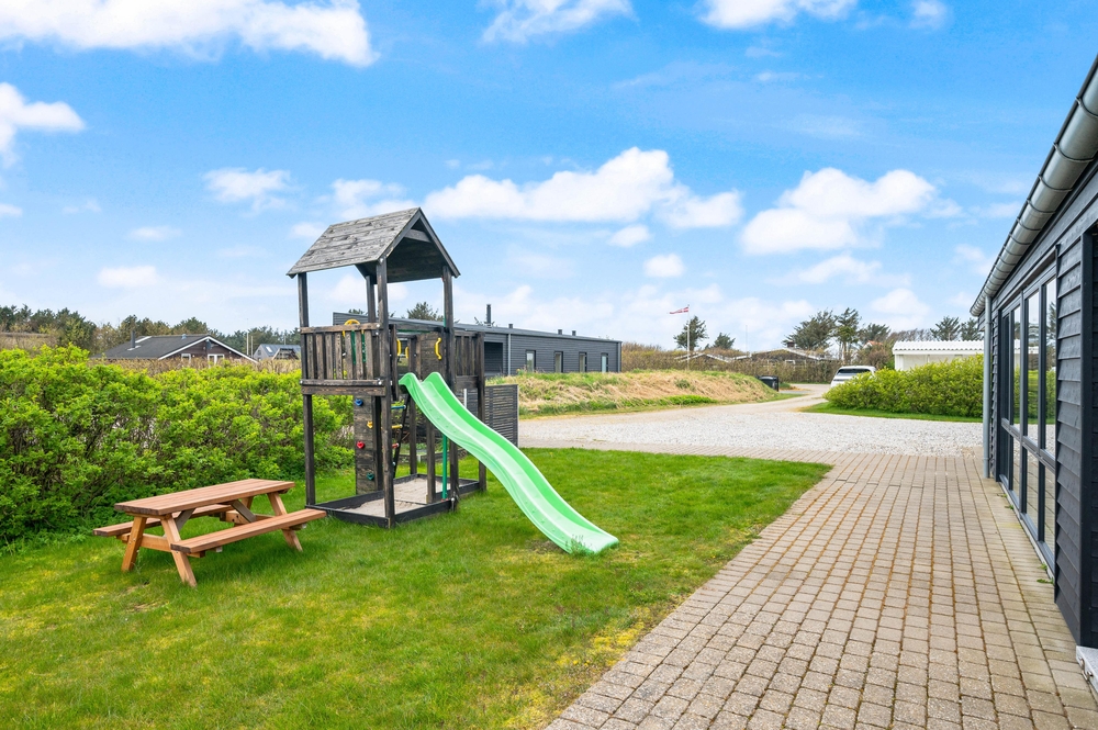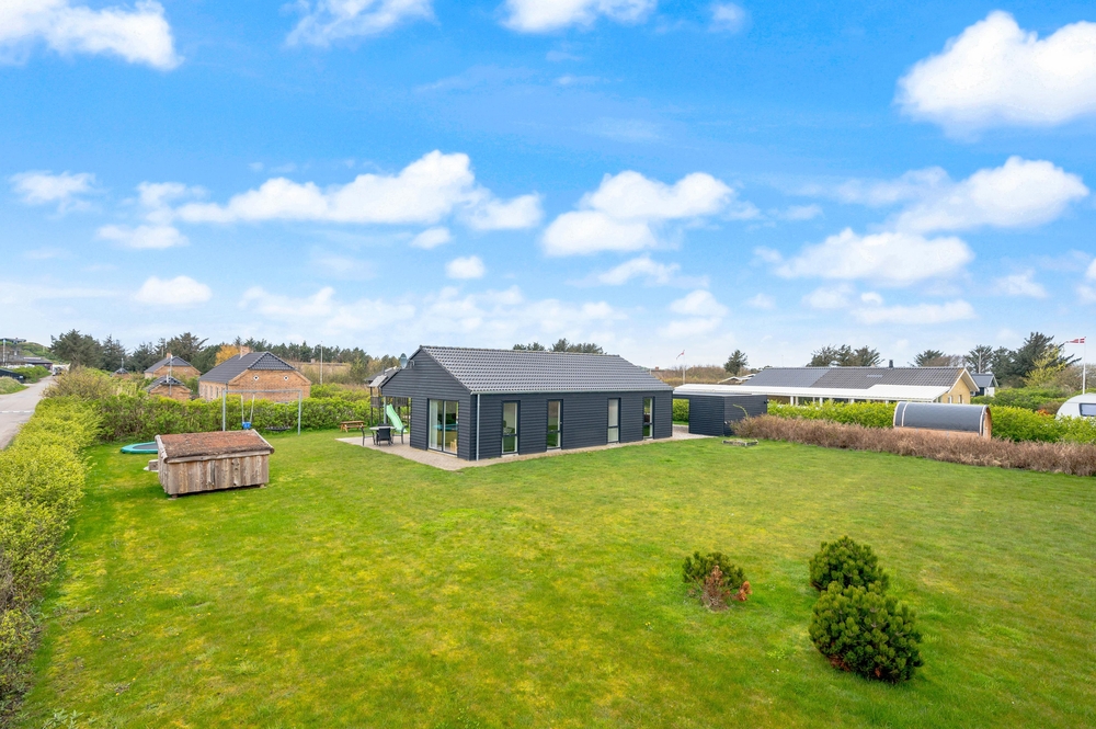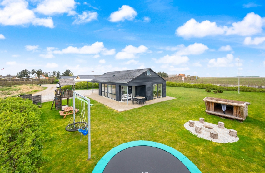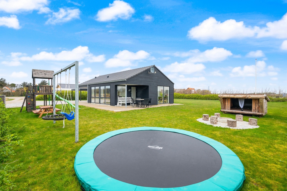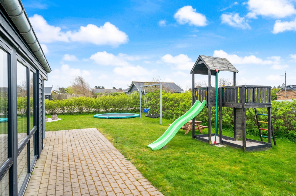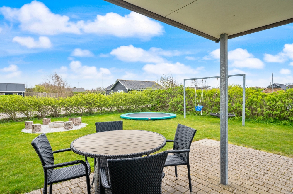 Feriehuset på Harbo Stages Vej 3 ligger på en 1436m2 stor plænegrund, hvor børnene har rigelig plads til at lege og tumle, ligesom de små kan bygge sandslotte i sandkassen eller lege i legetårnet. Derudover råder plænegrunden over både et legetårn og en nedgravet trampolin, hvor børnene også kan få flere gode timer til at gå. Den delvis overdækkede terrasse er godt udstyret med havemøbler og liggestole og tilbyder forskellige siddepladser, hvor man altid kan finde en plads i læ i solen. Den der har lyst, kan tilberede et dejligt måltid på grillen.