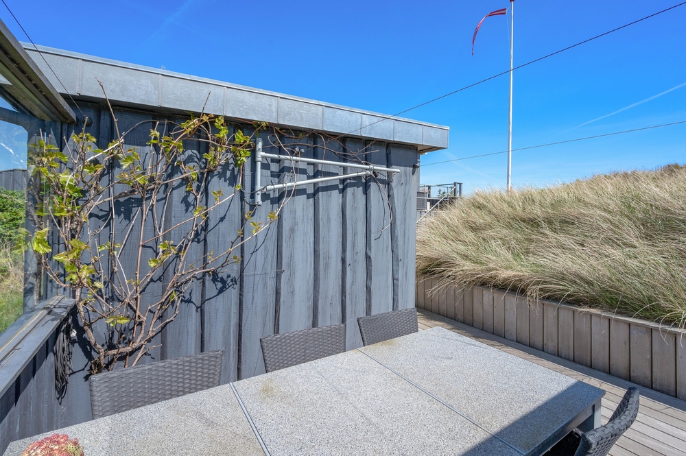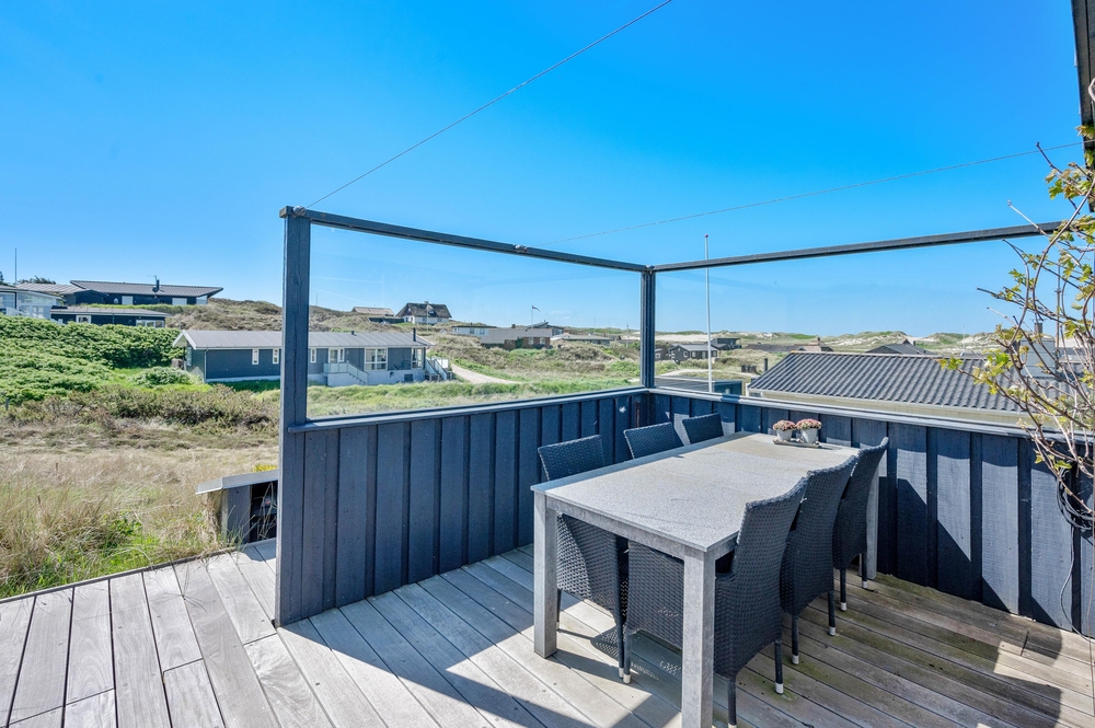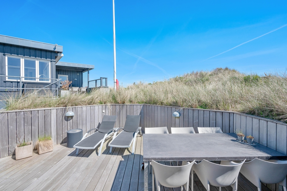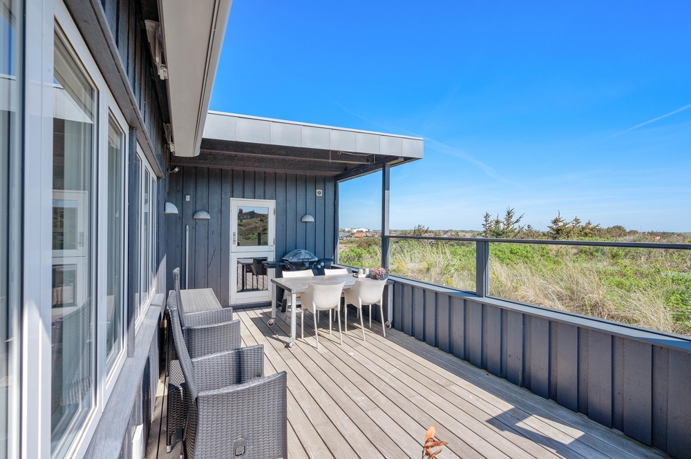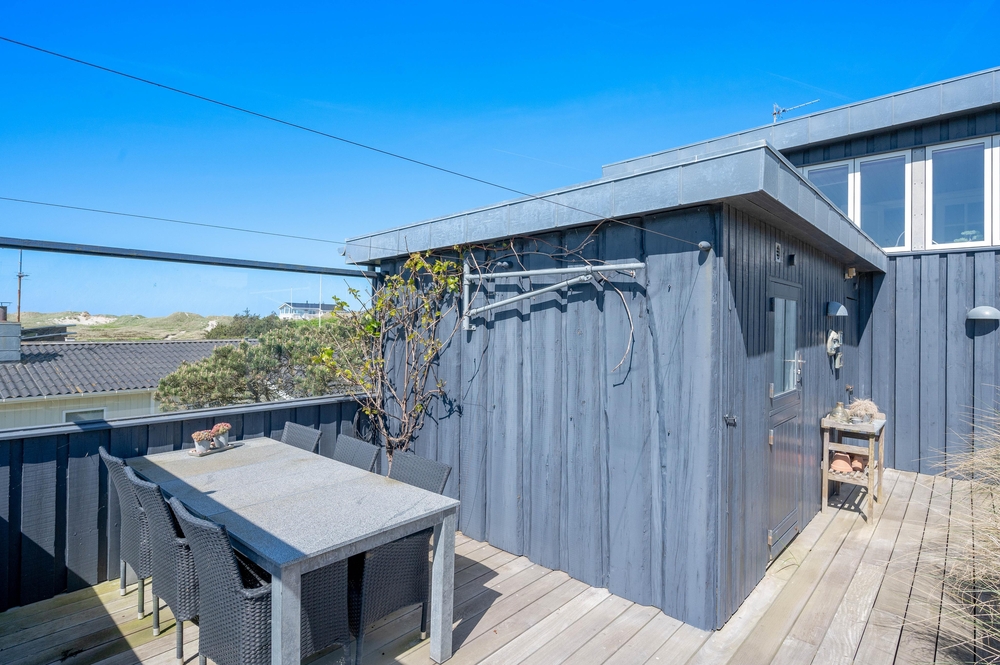 Feriehuset på Harbo Stages Vej 37 i Søndervig ligger på en klit- og naturgrund på ca. 1275 m2 og byder på mange forskellige terrasser, hvoraf nogle er overdækkede, åbne og afskærmede, så alle kan finde deres yndlingsplads. Da feriehuset ligger lidt højt, har man fra terrassen en fantastisk panoramaudsigt over ferieområdet i Søndervig. Der er en garage under feriehuset, hvor I kan parkere jeres bil under ferien.