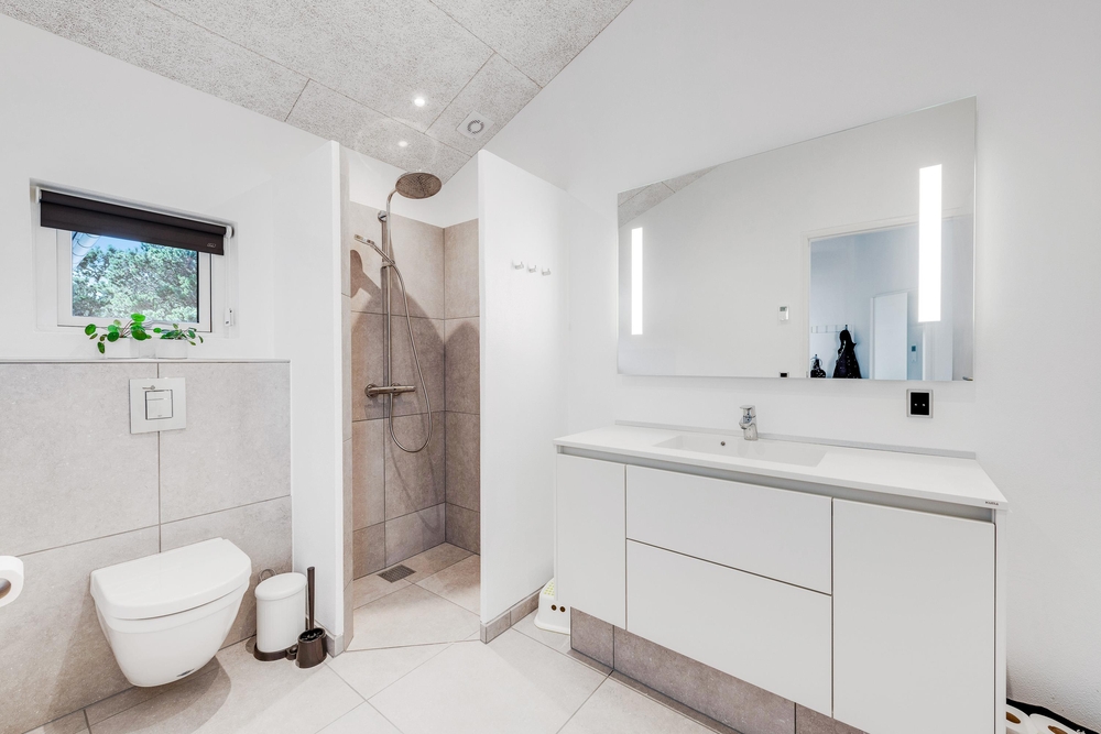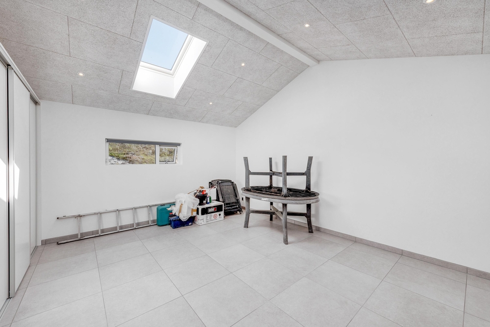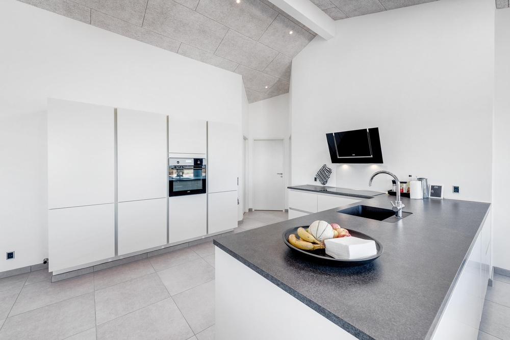 Det store opholdsrum forener køkken, spiseafdeling og stue, og med loft til kip og store ovenlysvinduer er der skabt masser af plads og åbenhed. Store vinduespartier giver jer en fantastisk panoramaudsigt fra sofaen såvel som spisebordet og inviterer både solens stråler og den flotte natur indenfor.