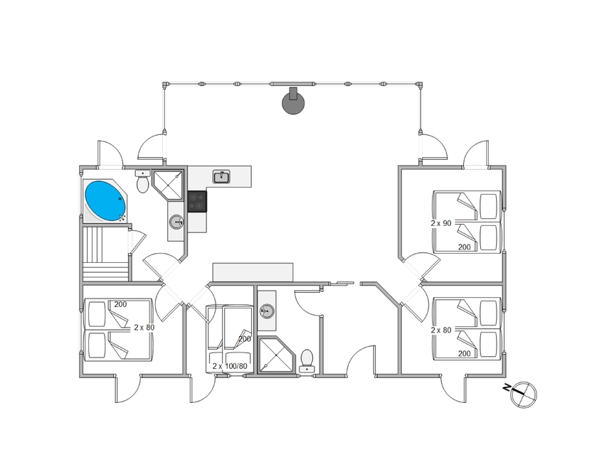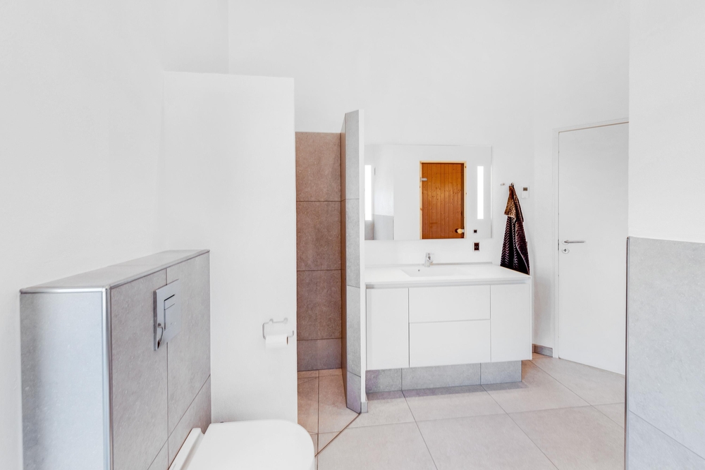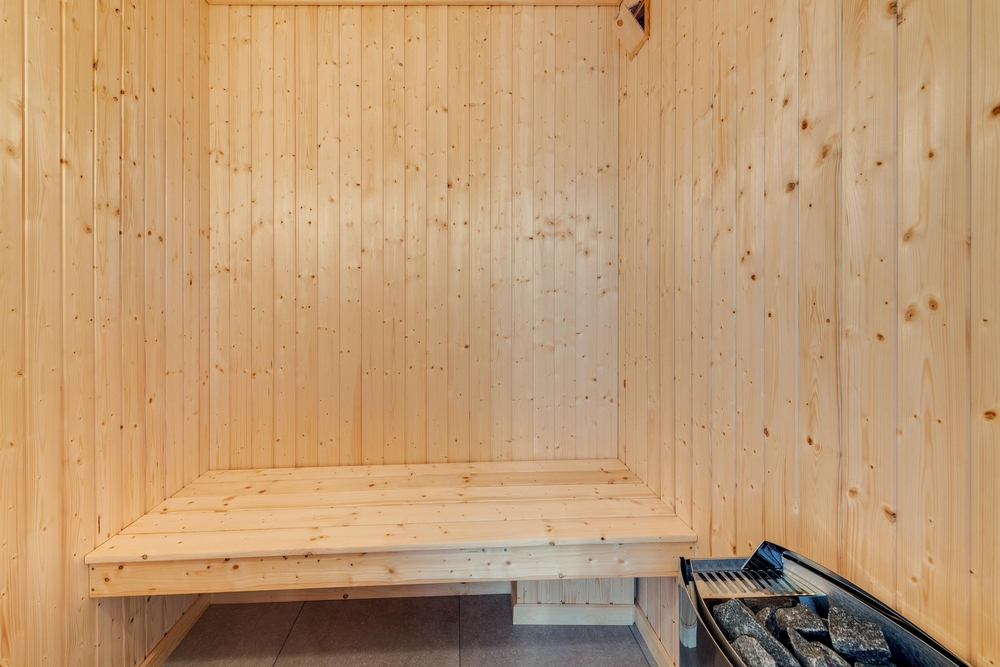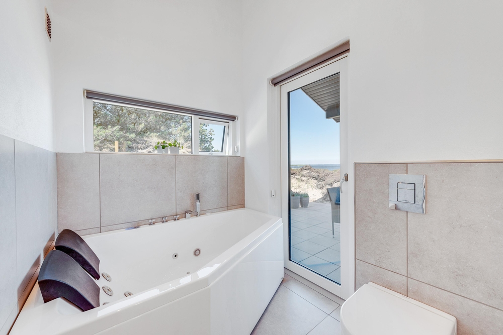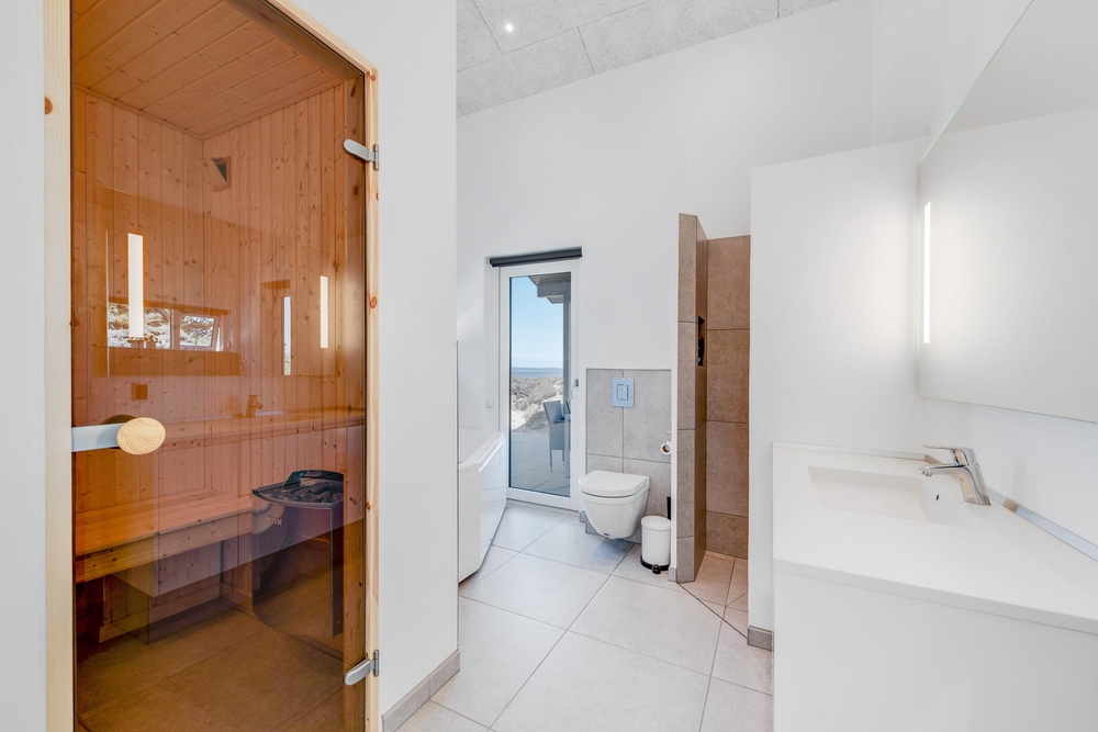På det største af husets 2 badeværelser finder I to af husets highlights; her er der mulighed for at nyde lidt ekstra wellness på ferien i saunaen eller det lækre spabad.
