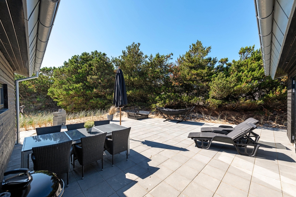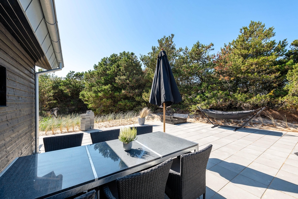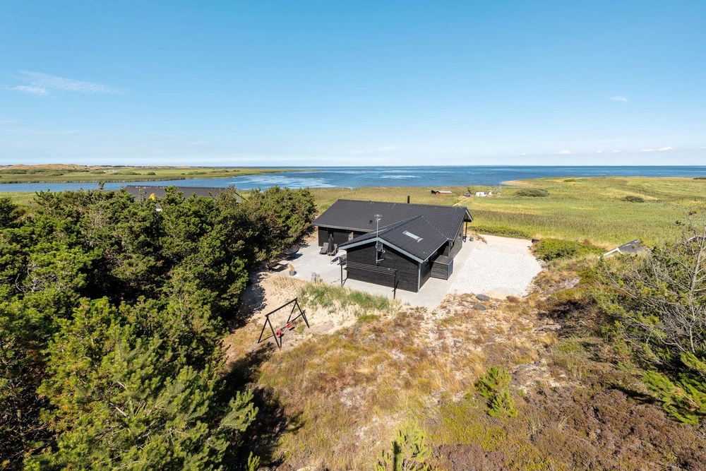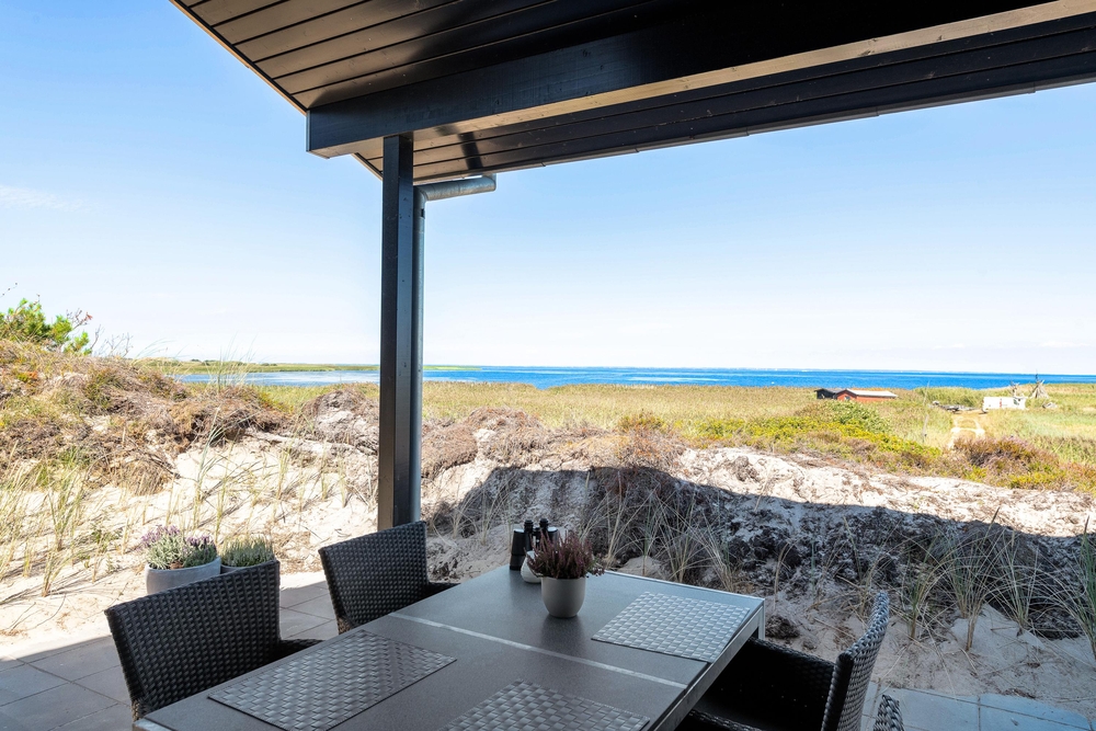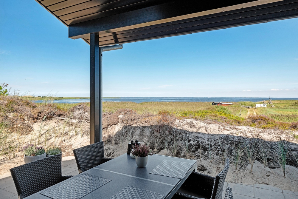 Feriehusets beliggenhed er helt unik, og I får en enestående panoramaudsigt til Ringkøbing Fjord fra stuen såvel som fra den store terrasse, der løber hele vejen rundt om huset. Her får I både en overdækket og åben del, som er godt afskærmet af grantræerne og gør de gode terrassedage helt ugenerede.