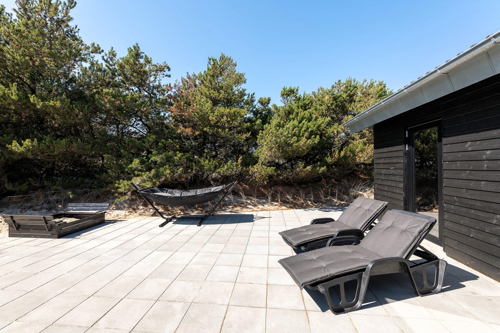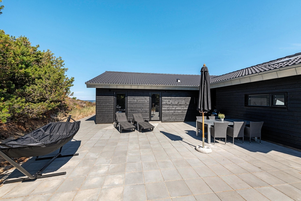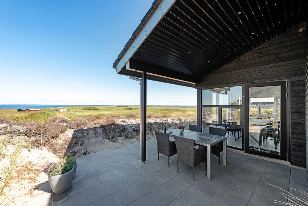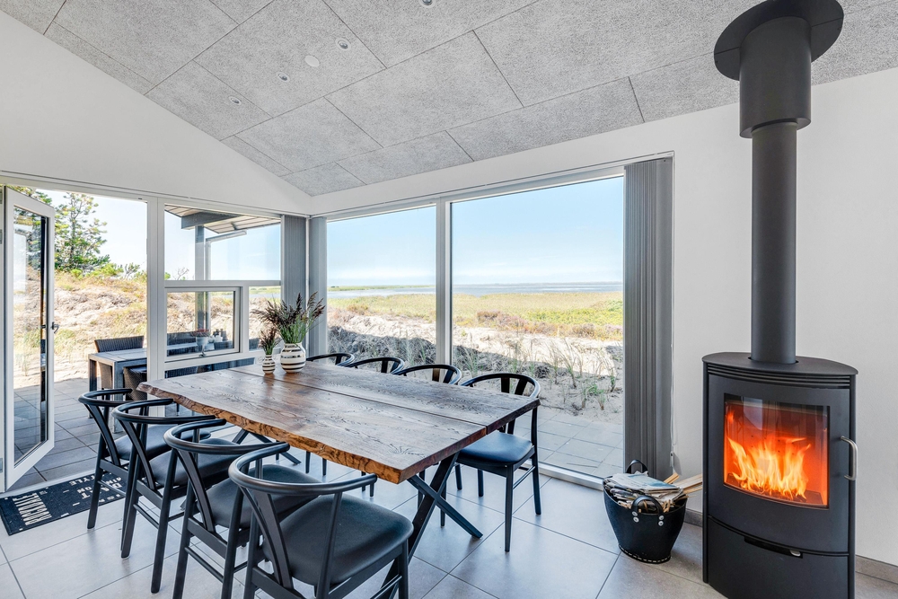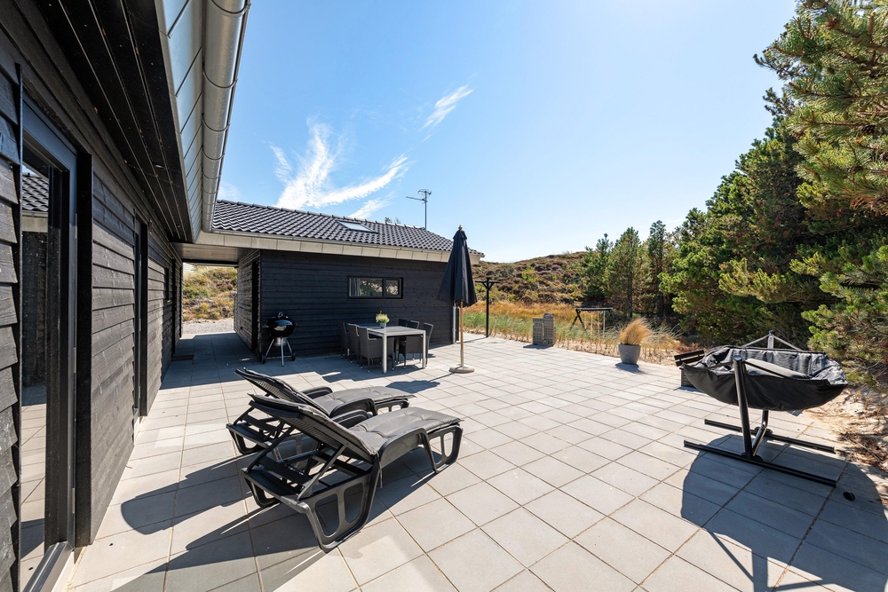 Feriehusets beliggenhed er helt unik, og I får en enestående panoramaudsigt til Ringkøbing Fjord fra stuen såvel som fra den store terrasse, der løber hele vejen rundt om huset. Her får I både en overdækket og åben del, som er godt afskærmet af grantræerne og gør de gode terrassedage helt ugenerede.