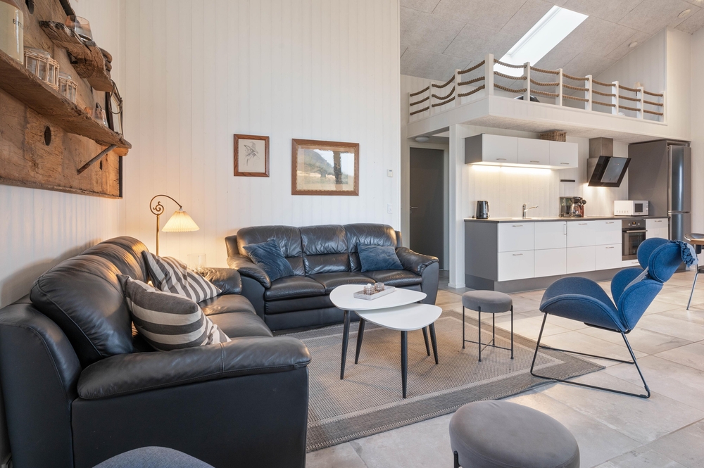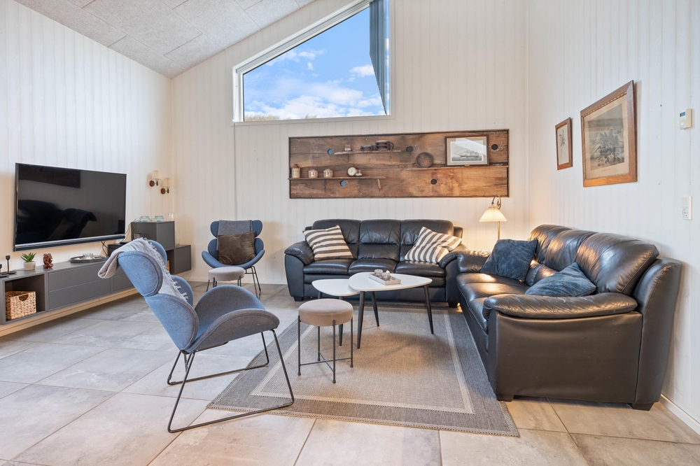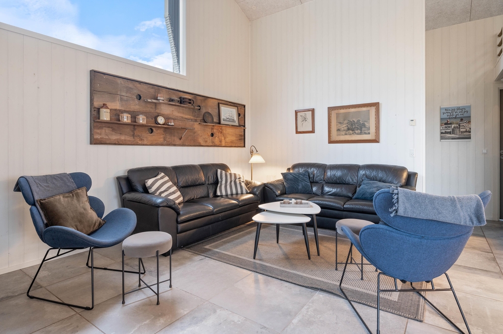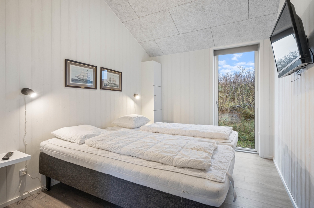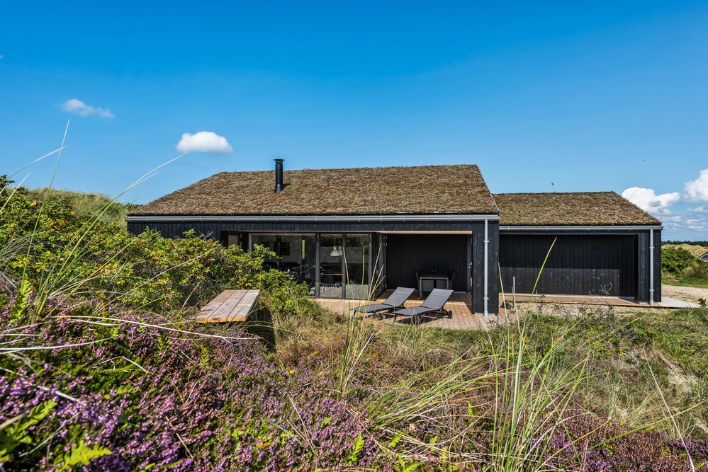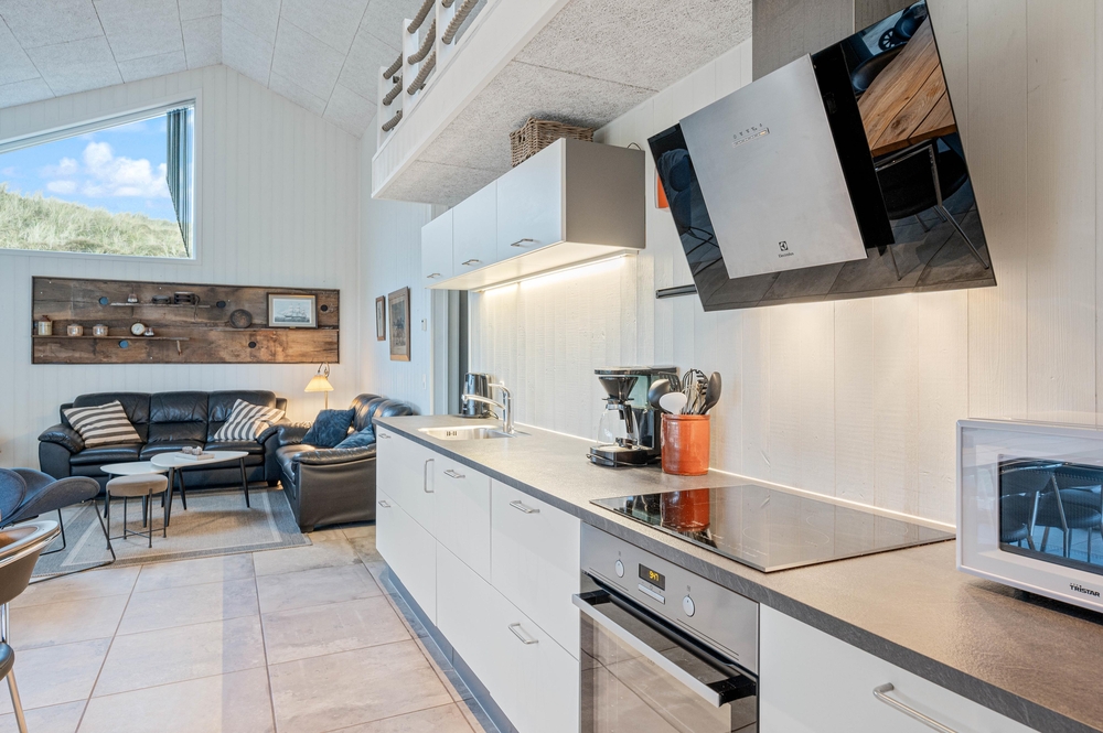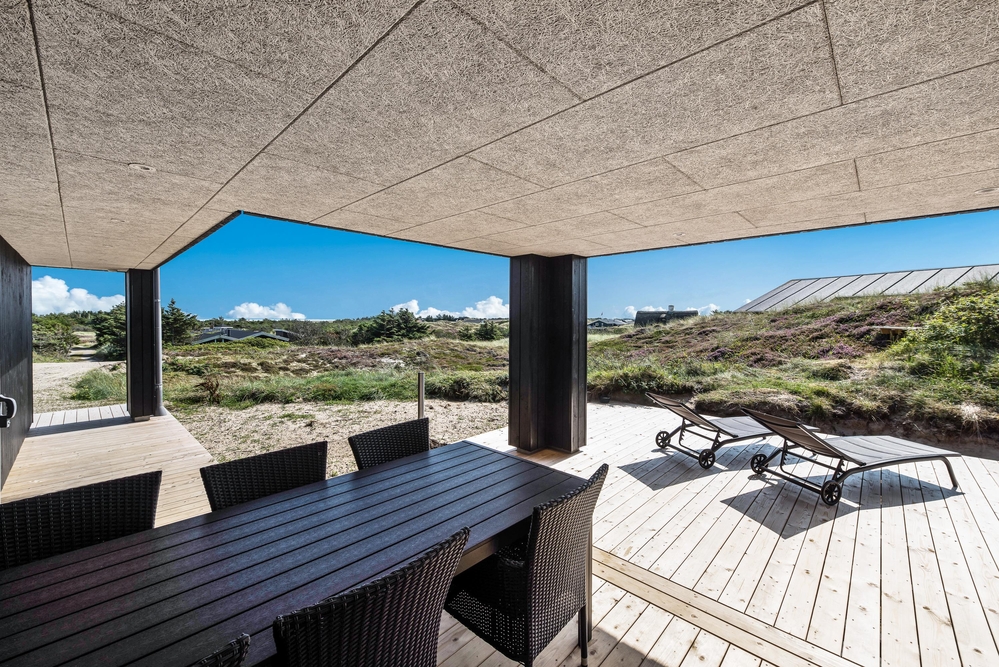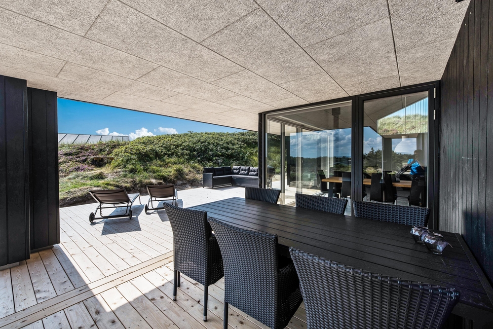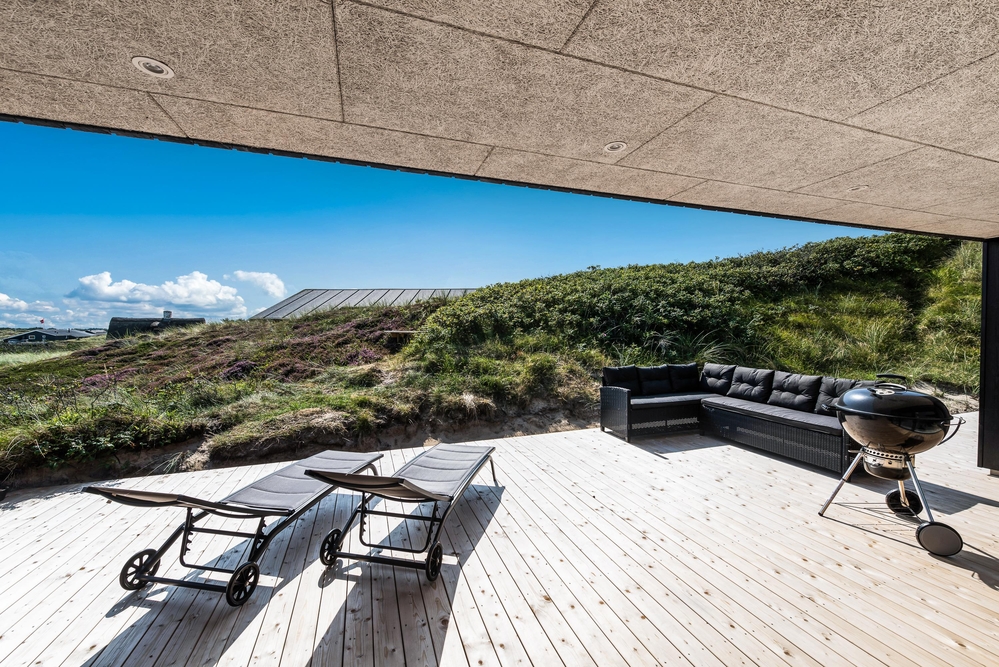 I dette flotte moderne sommerhus, er der rig mulighed for hygge og samvær med hele familien, og det oven i købet i fantastisk smukke rammer. Her er god plads til at være sammen både inde og ude. De fine overdækkede terrasser giver dig mulighed for at nyde naturen i næsten al slags vejr, så tænd op i grillen, sæt dig godt til rette og nyd så den smukke udsigt. Efter en lækker middag fra grillen, kan du tage et glas vin i hånden og gå op på klittoppen bag huset og nyde en smuk solnedgang mod vest, og står du tidligt op får du samme smukke oplevelse når solen næste dag stiger op mod øst over Ringkøbing Fjord.