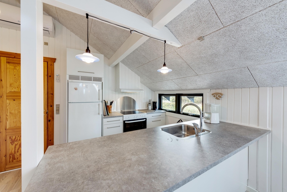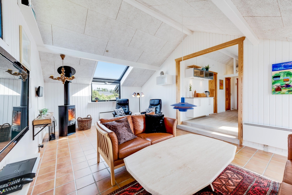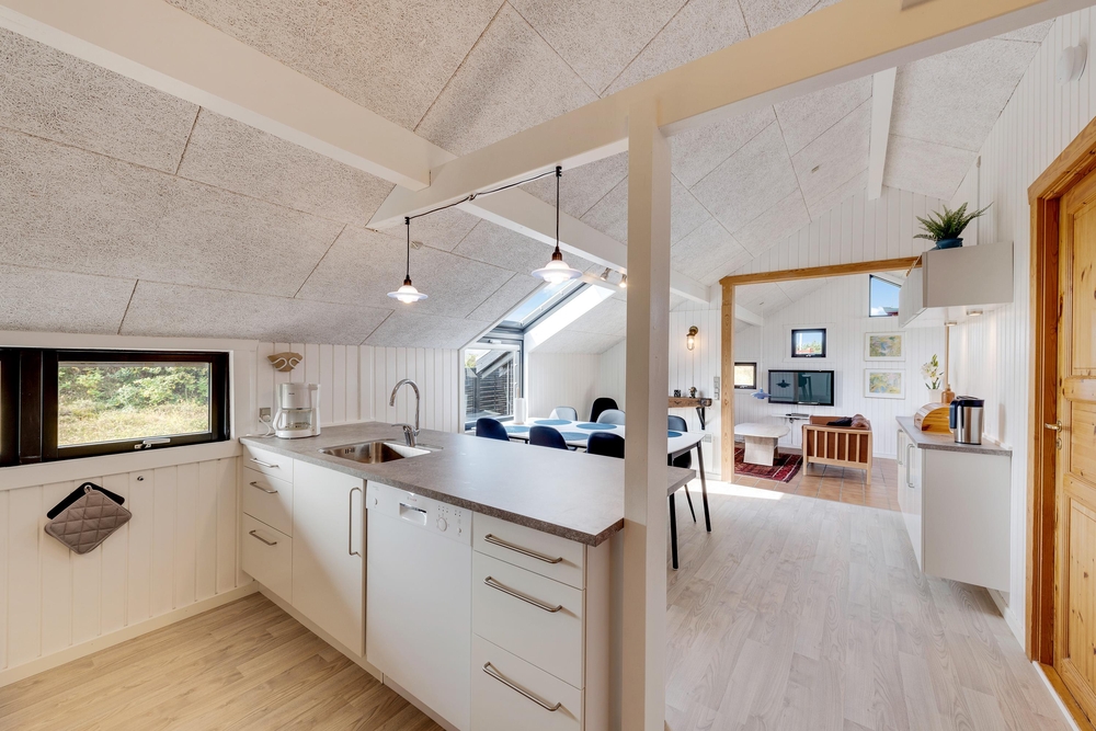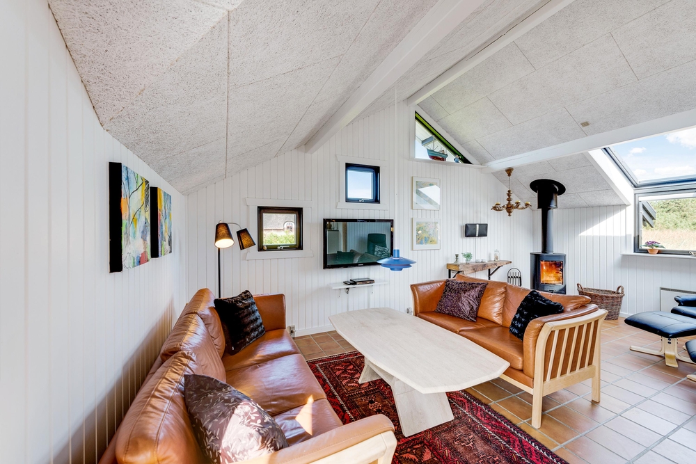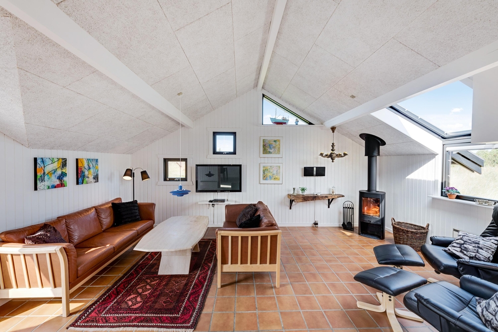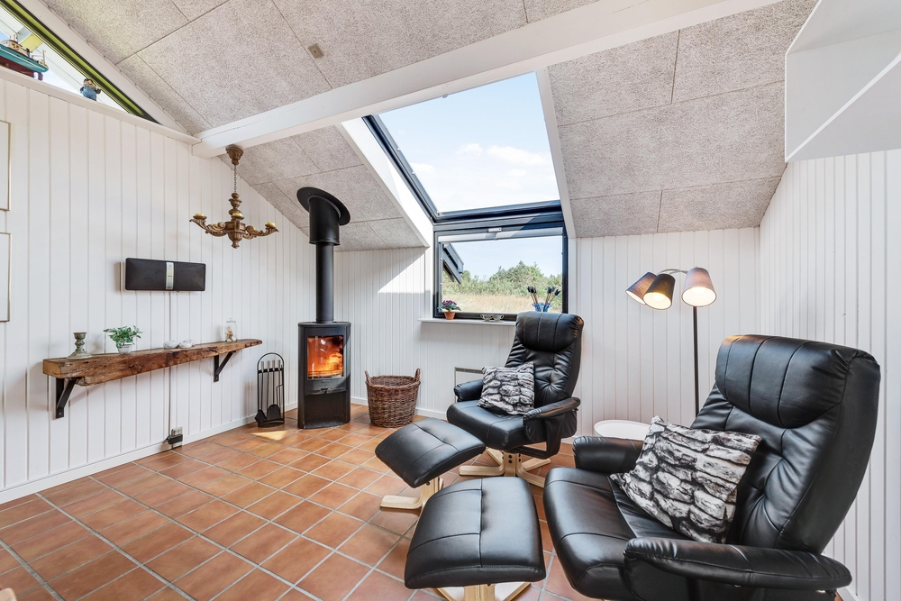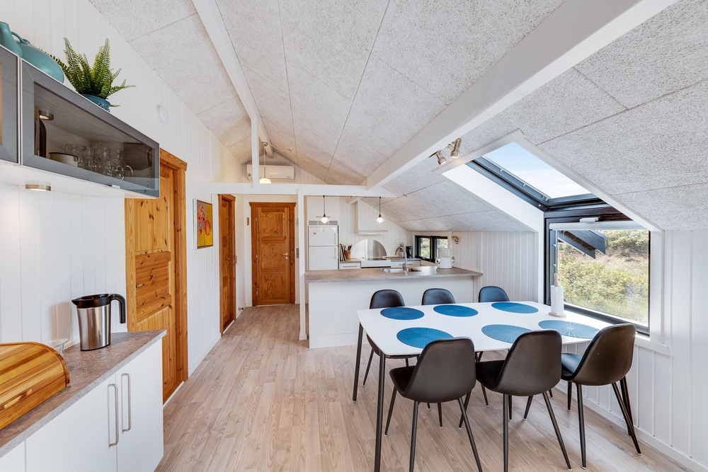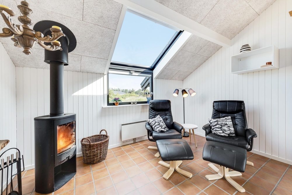 Smart indrettet med store vindueselementer, lyse vægge og lofter, moderne elementer og de klassiske møbler vil I med det samme føle jer rigtigt godt tilpas i dette feriehus. I køkkenet, som er åbent mod stue-alrummet, kan I nemt trylle lækre måltider og om efteråret, når vestvinden suser om huset og rusker i marehalmen, sørger husets brændeovn for ekstra varme og hyggestemning.