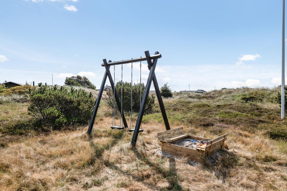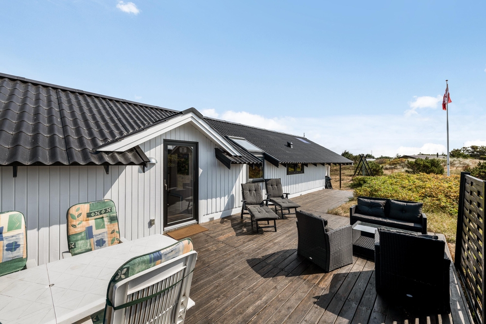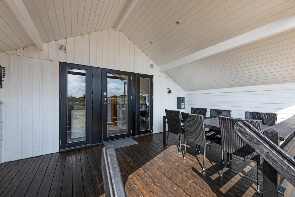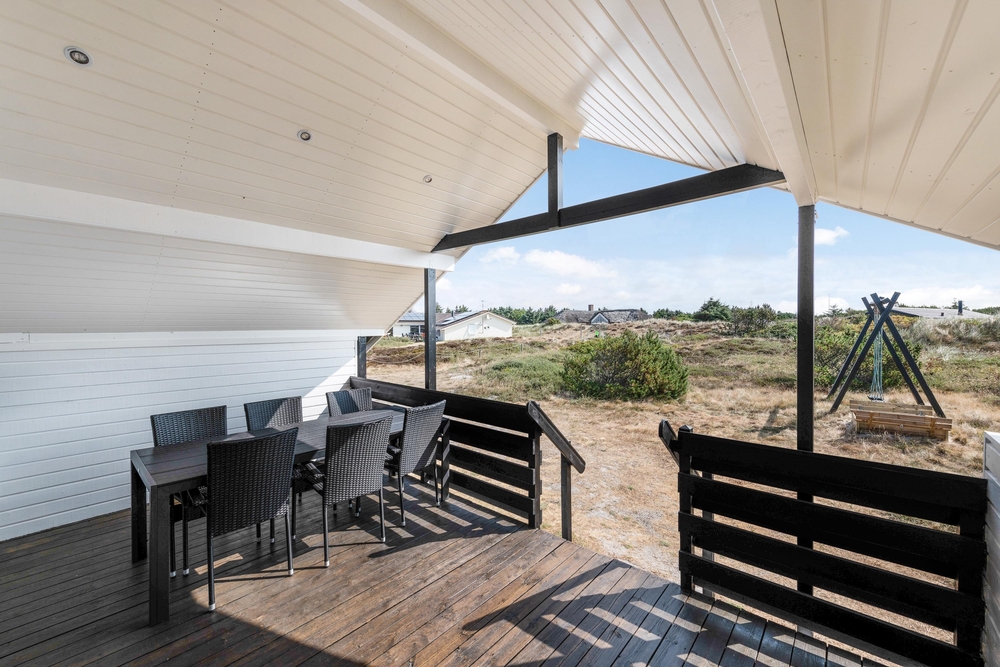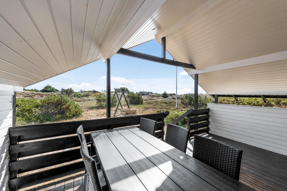 Fra stuen har I direkte udgang til den dejlige afskærmede og overdækkede terrasse, hvor I også på regnvejrsdage kan nyde den friske havluft. Naturligvis har I også en åben terrasse, hvor I kan slappe af på de gode havemøbler og nyde solen, imens de små hygger sig på husets gynger eller bygger slotte i sandkassen.