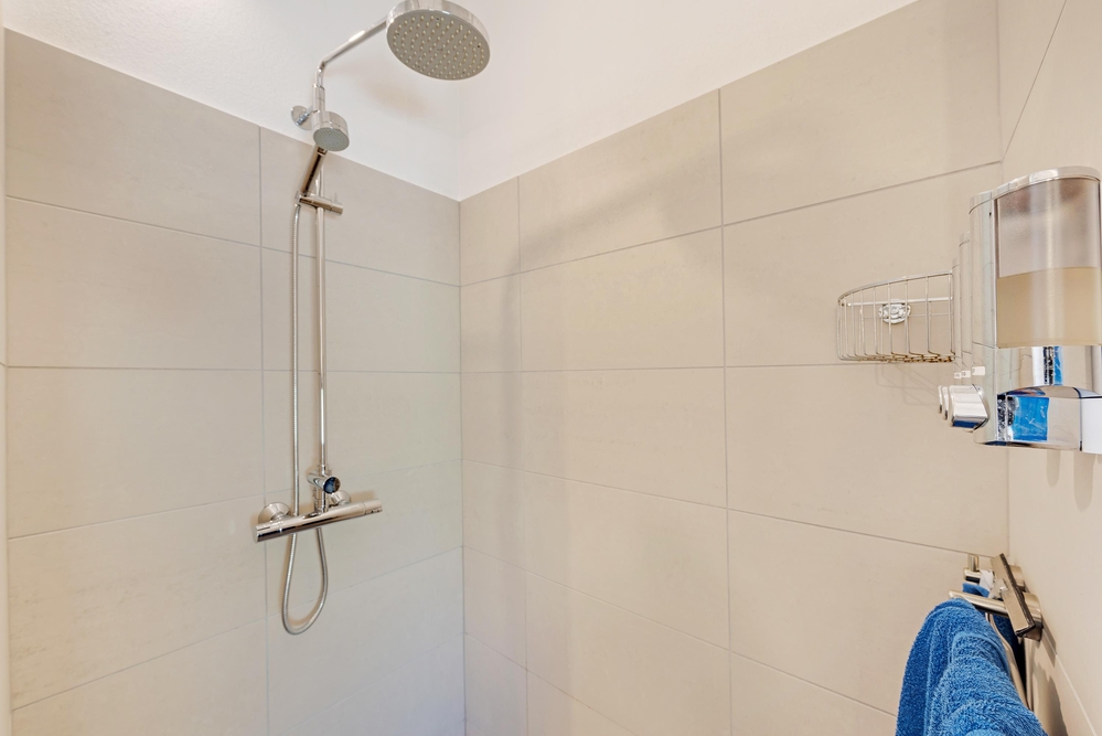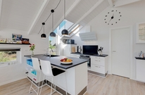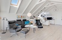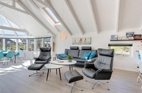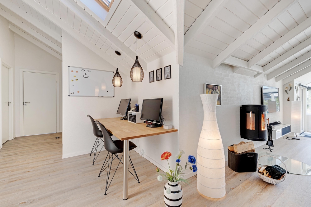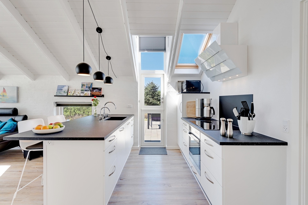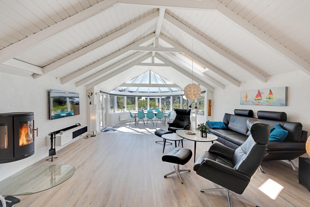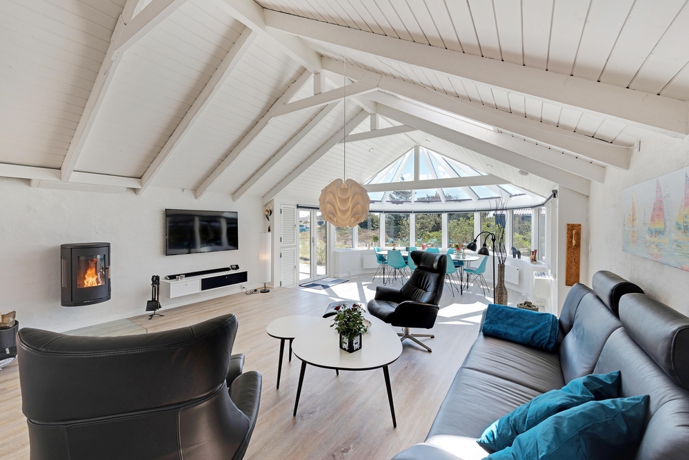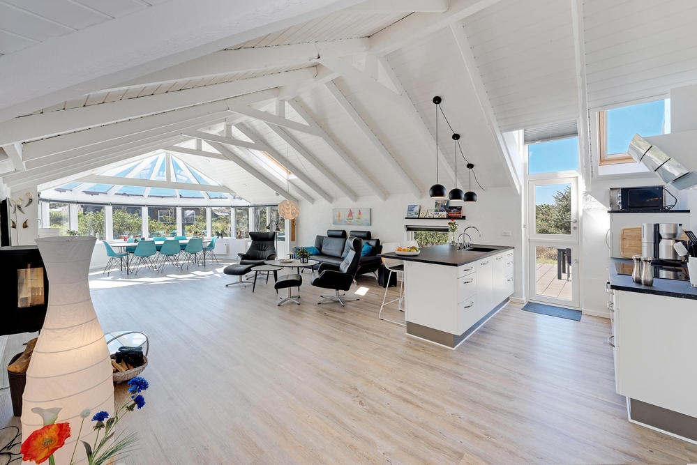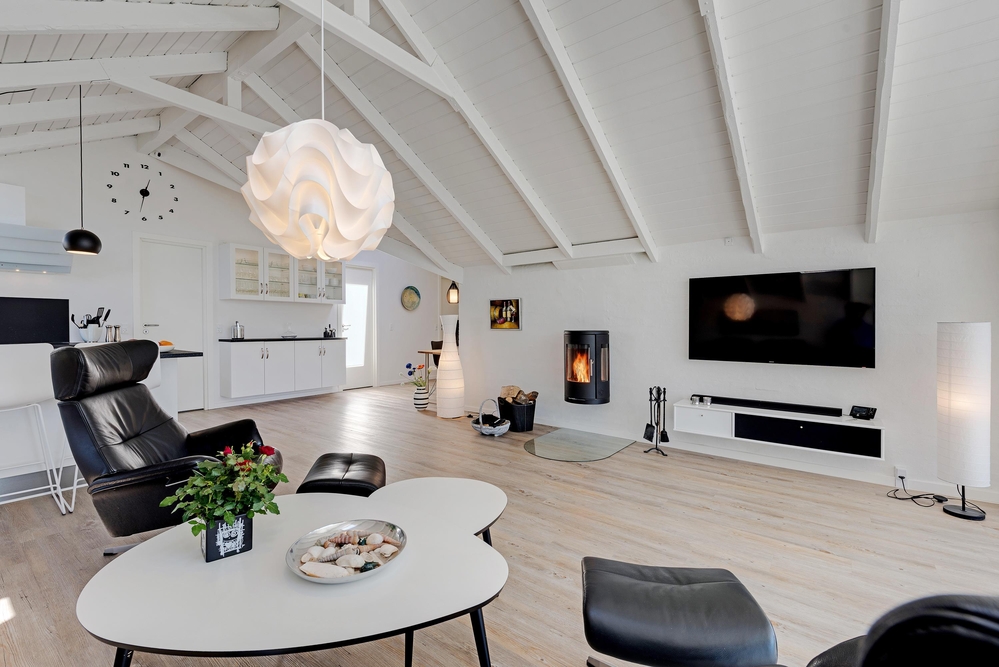 Sommerhusets hjerte er det åbne opholdsrum, hvor stue og køkken er slået sammen med brændeovnen som centrum. Her er der lagt op til masser af hyggelige stunder med familien over aftensmaden og de sene aftener på sofaen. Køkkenet er udstyret med mange moderne faciliteter som pizzaovn, en Quooker og Nespresso-kaffemaskine.