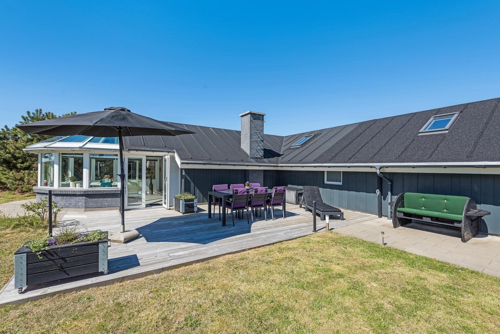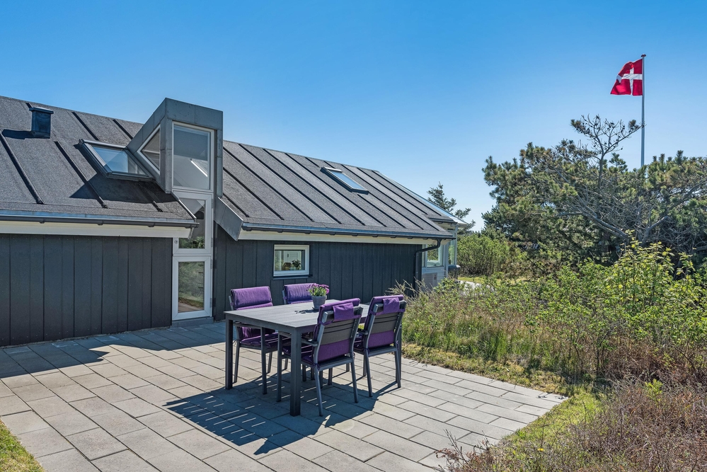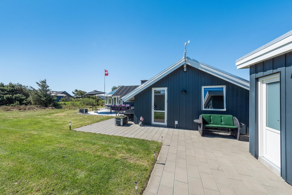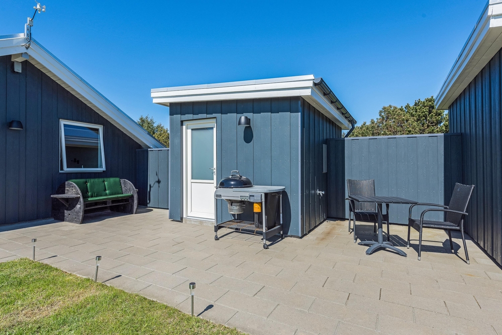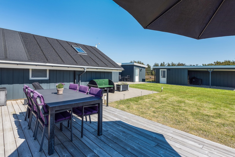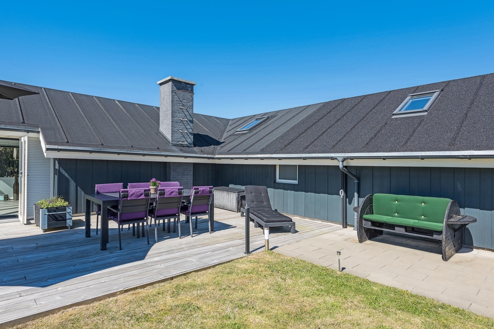 Rundt om sommerhuset finder I flere skønne terrasser og kroge, hvor I kan sidde i solen og nyde den friske havluft. På den store plæne kan børnene lege og spille bold, mens I tænder op i grillen og forbereder aftenens feriemåltid.