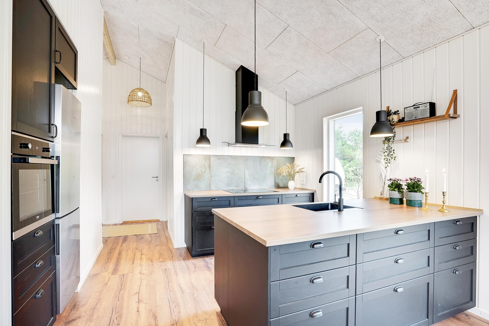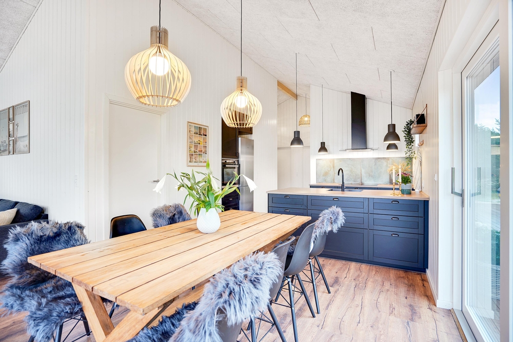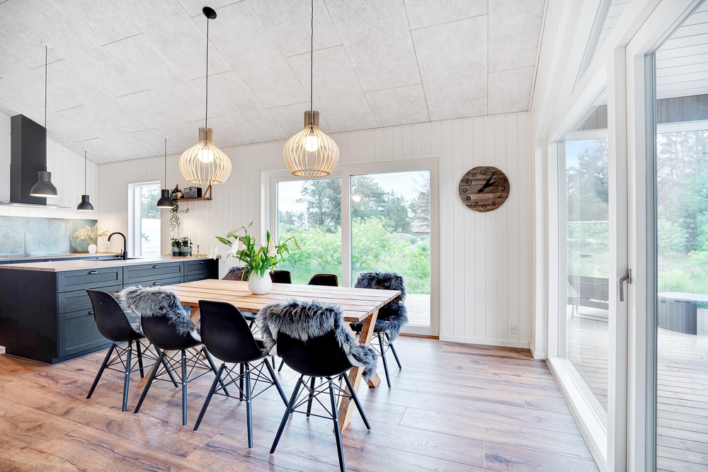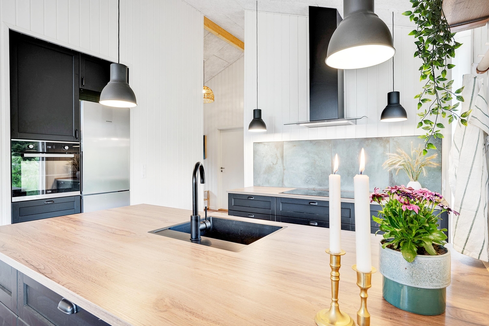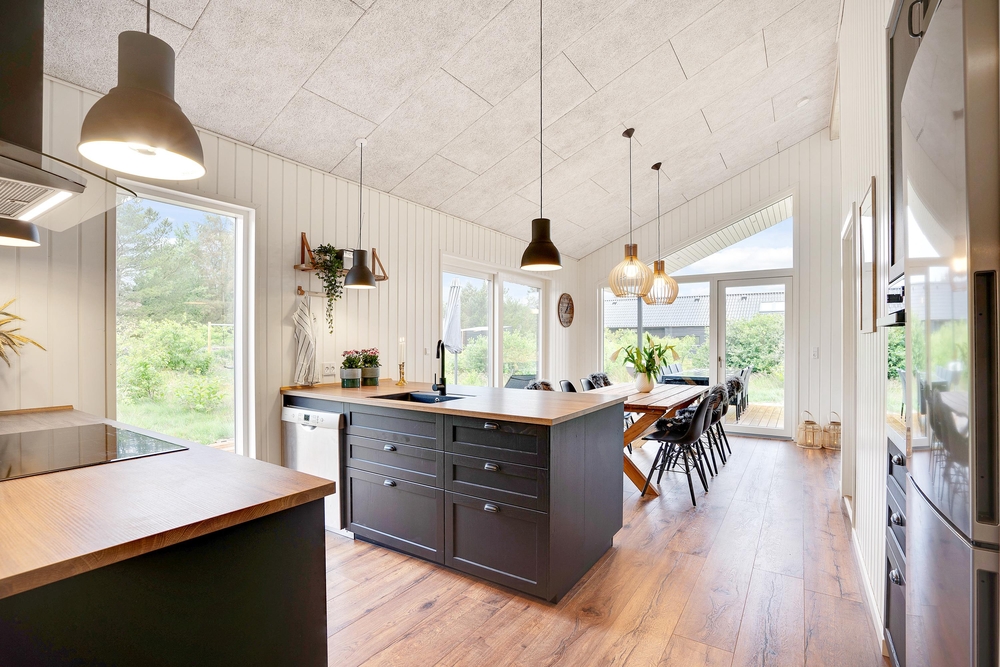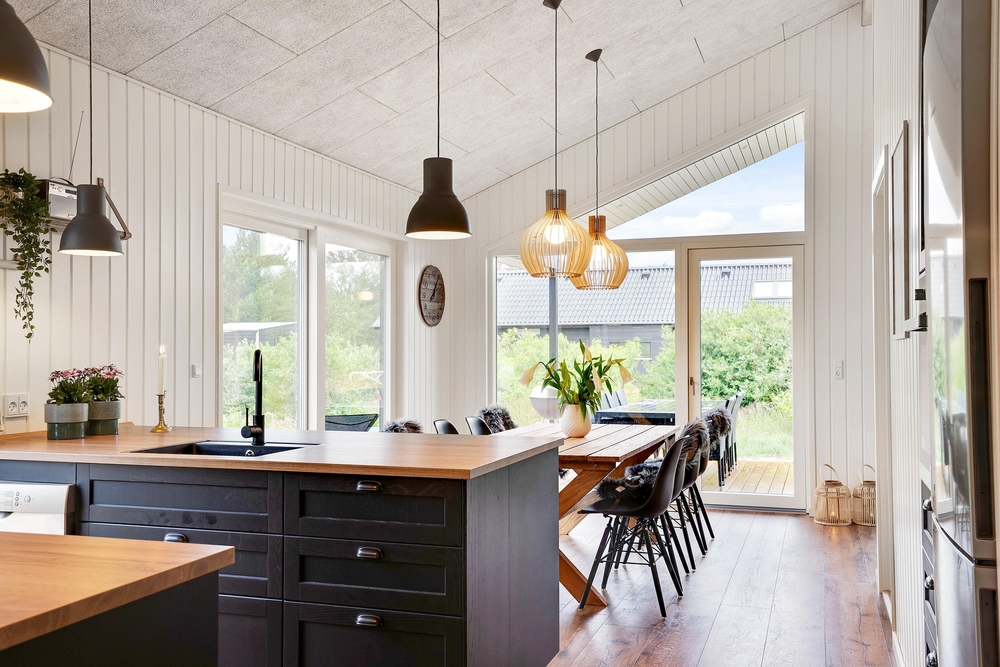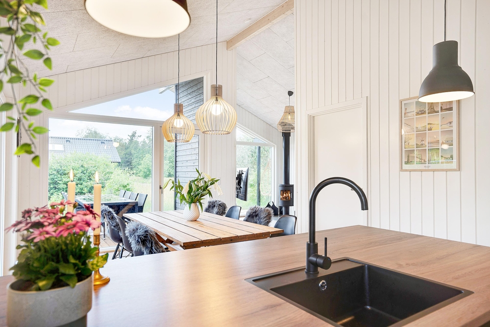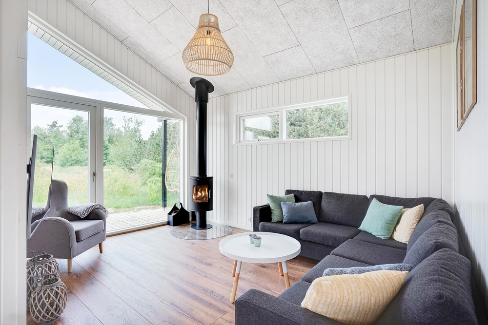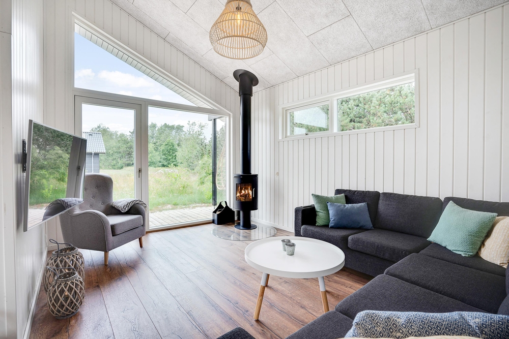I det moderne køkken gør induktionskomfuret og opvaskemaskinen sit til, at køkkentjansen er både nem og sjov. Med brændeovn i fællesområdet er hyggestemningen garanteret hele året rundt! Om I er samlet omkring et sjovt selskabsspil ved spisebordet, leger på gulvet med de små eller hygger i den bekvemme sofa foran fjernsynet.