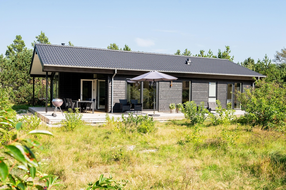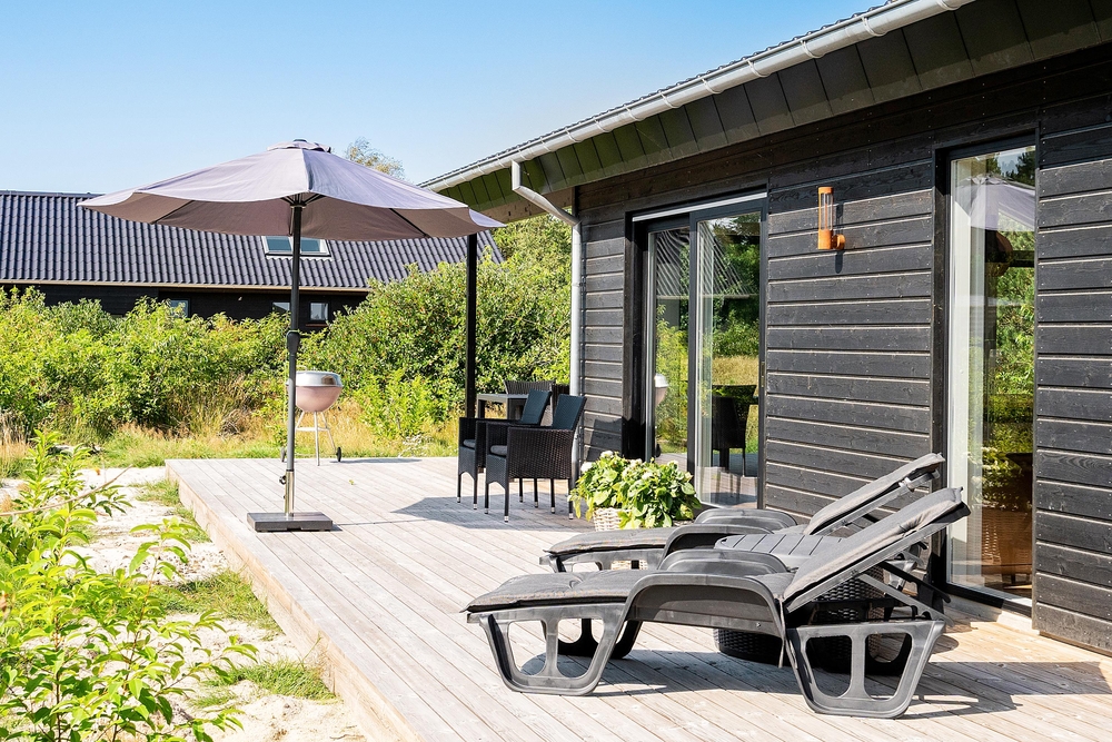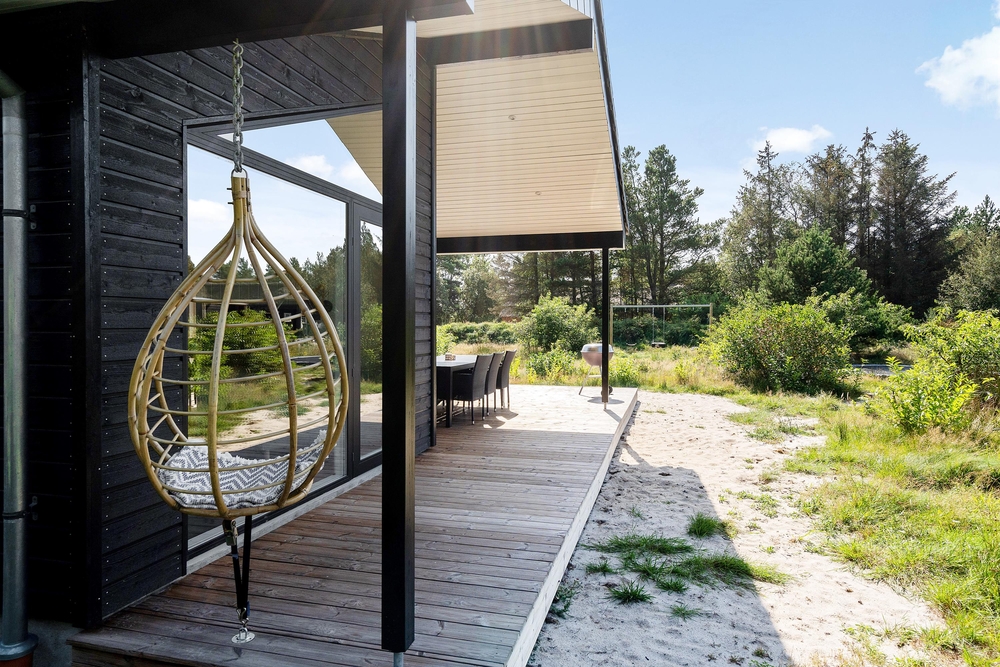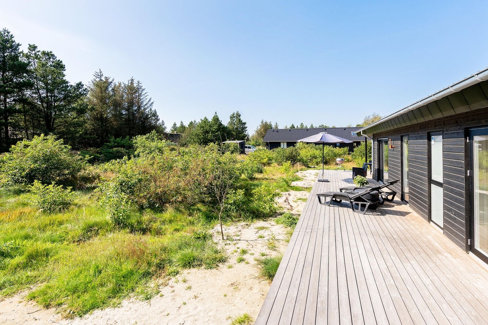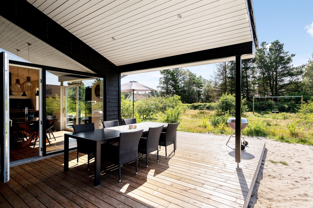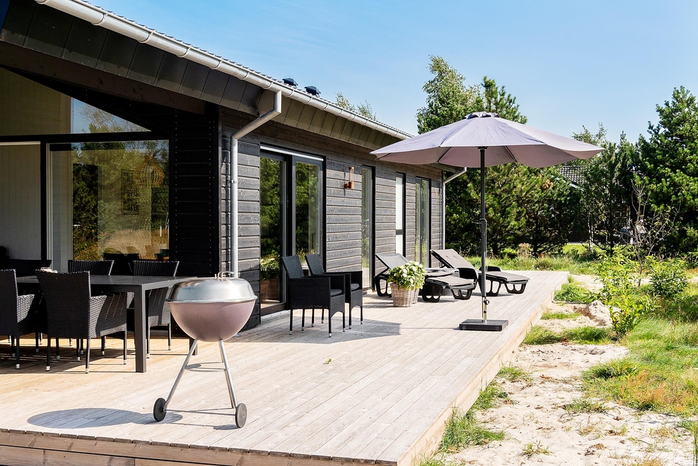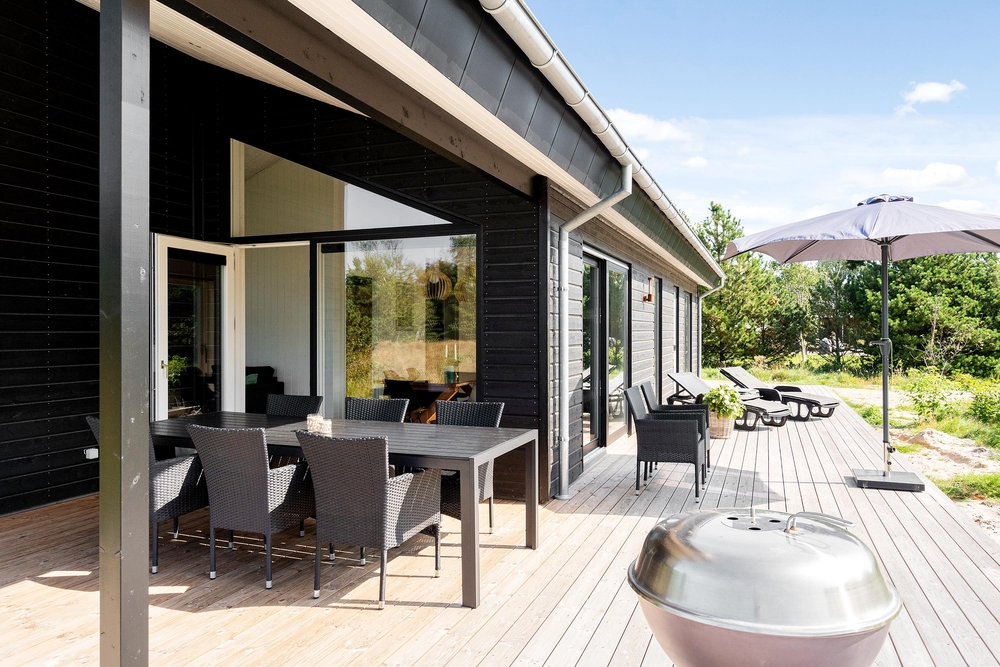 De store vinduespartier giver masser af lysindfald og altid en dejlig udsigt over naturgrunden. Fra husets stue er der udgang til en skøn til dels overdækket terrasse. Det er dejligt nemt at åbne op og forbinde ude med inde og få lukket den skønne friske luft ind, ? en dejlig blanding af hav, lynghede og nåletræer. På terrassen kan der hygges hele dagen på solvognen og om aftenen er der mulighed for at tænde op i grillen og i læ af udhænget sidde sammen og hygge indtil stjernerne titter frem på himlen.