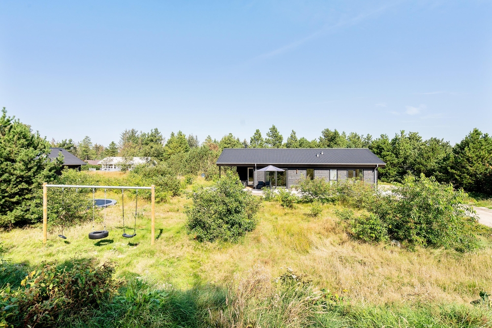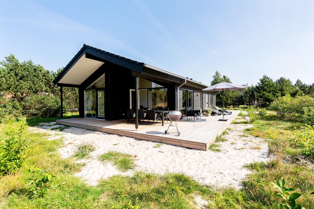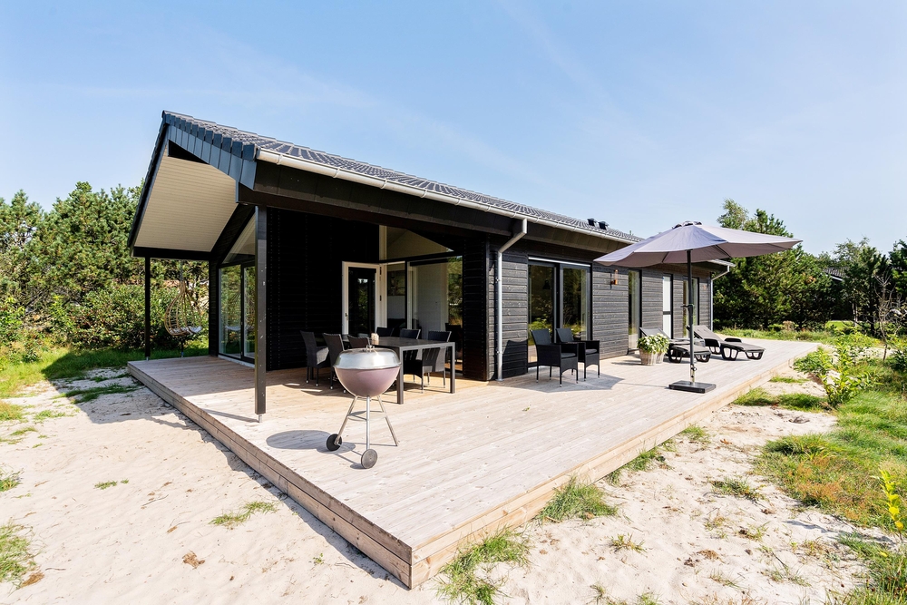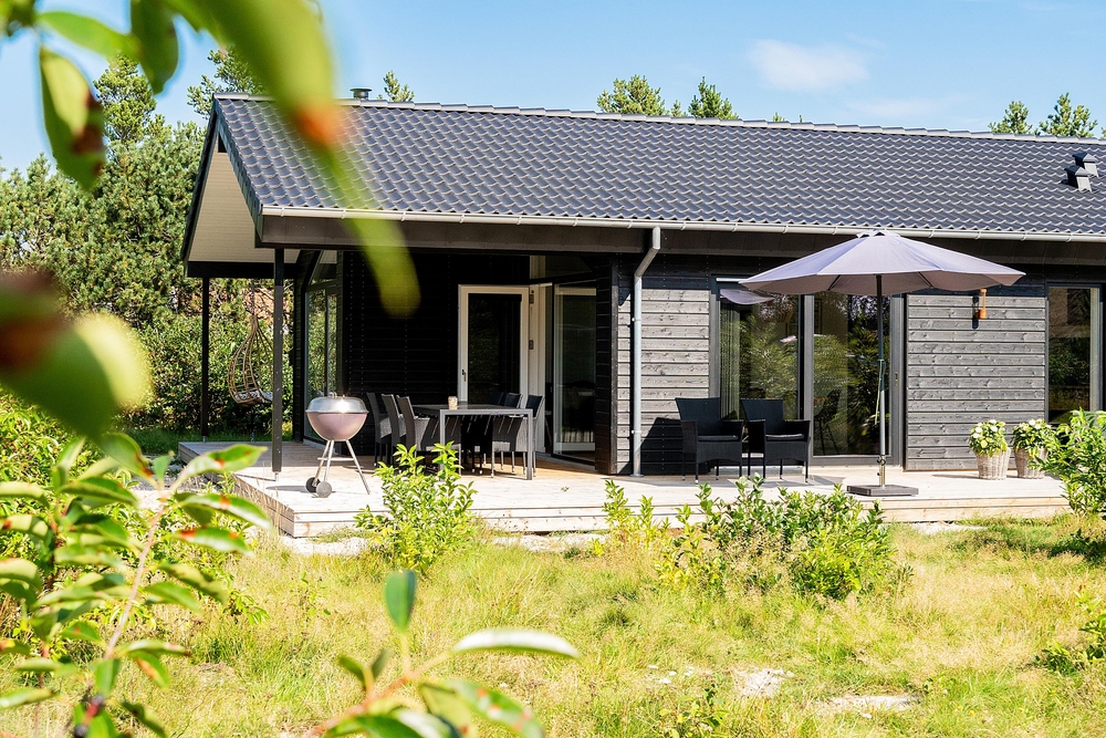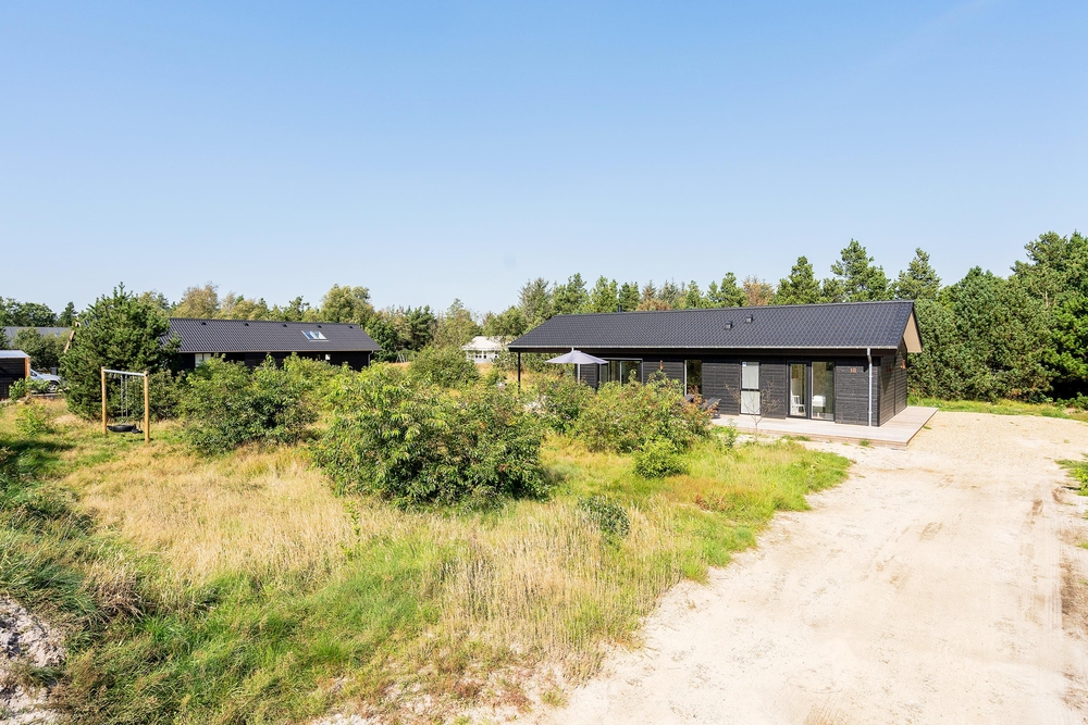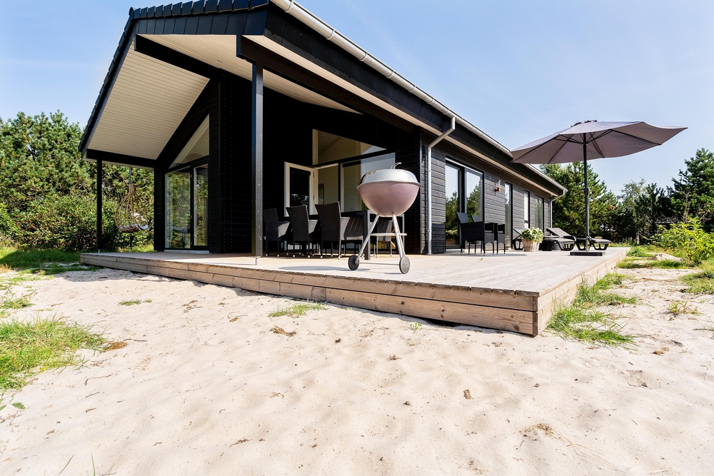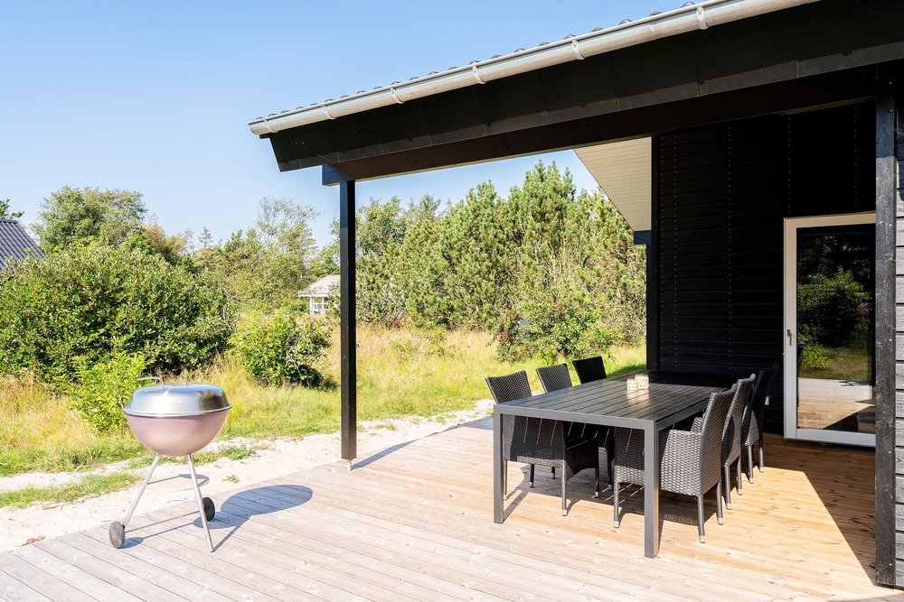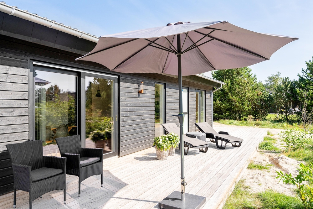 De store vinduespartier giver masser af lysindfald og altid en dejlig udsigt over naturgrunden. Fra husets stue er der udgang til en skøn til dels overdækket terrasse. Det er dejligt nemt at åbne op og forbinde ude med inde og få lukket den skønne friske luft ind, ? en dejlig blanding af hav, lynghede og nåletræer. På terrassen kan der hygges hele dagen på solvognen og om aftenen er der mulighed for at tænde op i grillen og i læ af udhænget sidde sammen og hygge indtil stjernerne titter frem på himlen.
