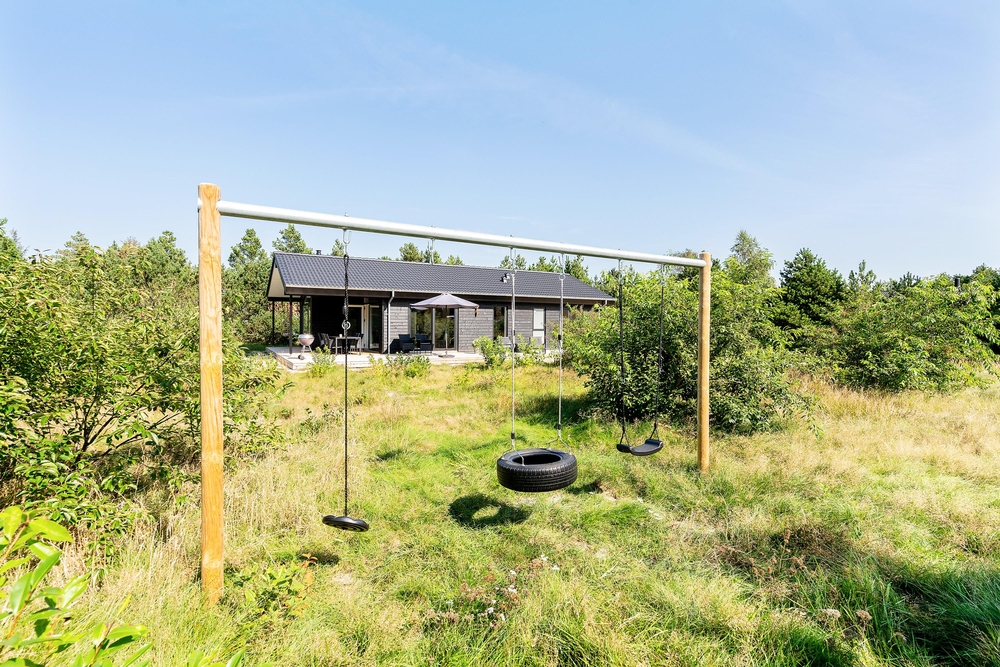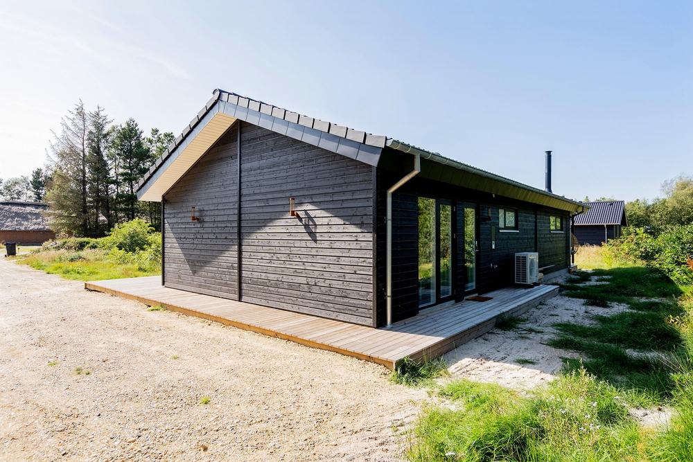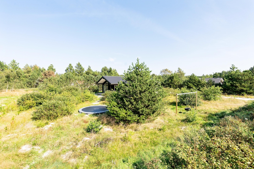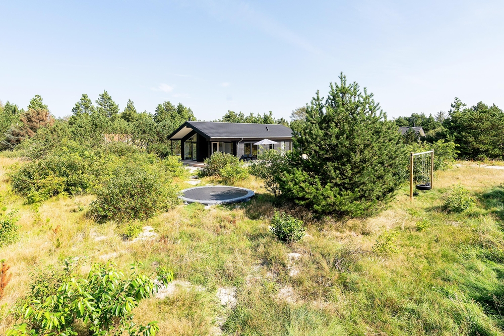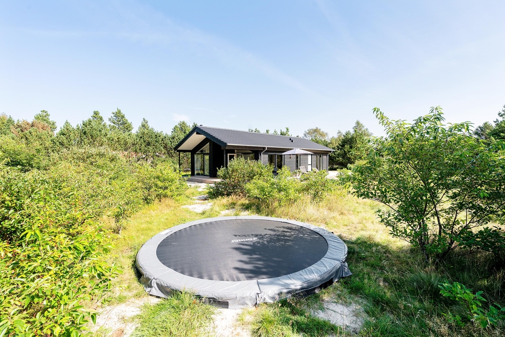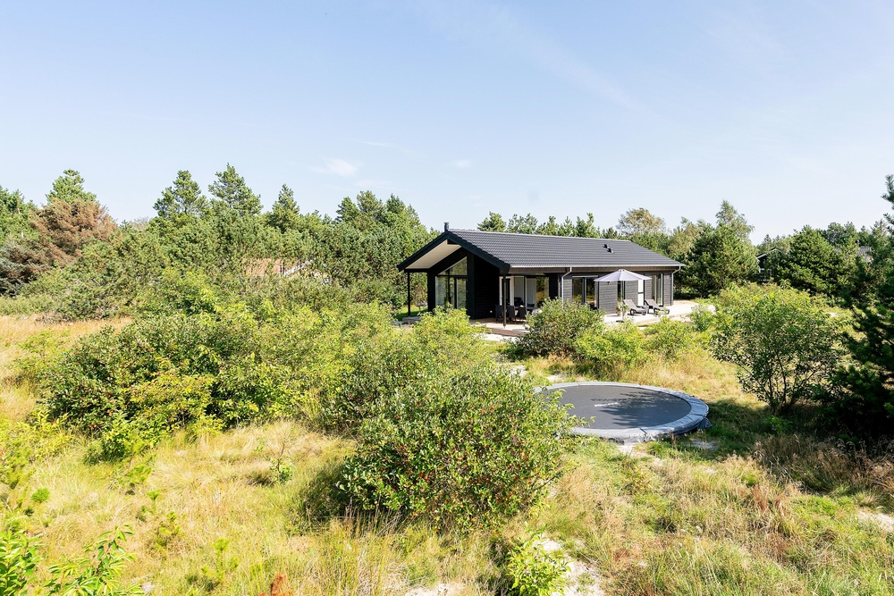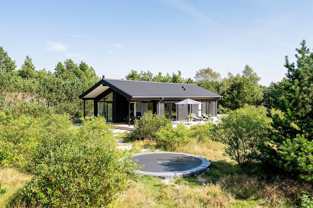 De store vinduespartier giver masser af lysindfald og altid en dejlig udsigt over naturgrunden. Fra husets stue er der udgang til en skøn til dels overdækket terrasse. Det er dejligt nemt at åbne op og forbinde ude med inde og få lukket den skønne friske luft ind, ? en dejlig blanding af hav, lynghede og nåletræer. På terrassen kan der hygges hele dagen på solvognen og om aftenen er der mulighed for at tænde op i grillen og i læ af udhænget sidde sammen og hygge indtil stjernerne titter frem på himlen.