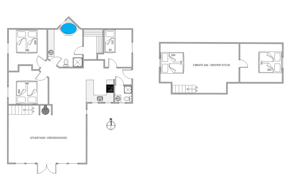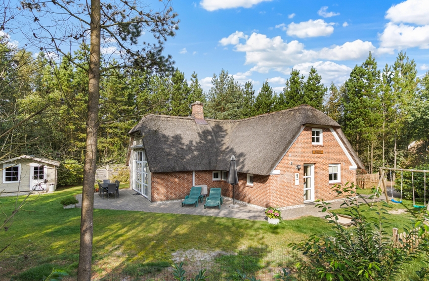 Indenfor indbyder det solide murstenshus med stråtag til afslapning og socialt samvær med de nærmeste. Et ideelt feriehus til den store børnefamilie skal på tur, eller hvis I er flere par, der skal på tur! Her er fem soveværelser, hvoraf to er at finde på førstesalen.