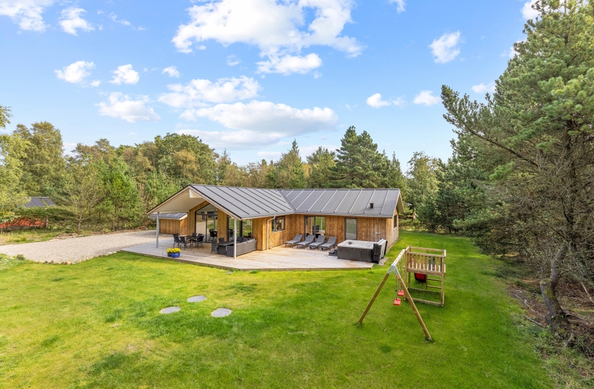 Dette lyse og smukke feriehus på Hedevej 18 er bygget i 2024 og omgivet af store træer. Her kan en stor familie eller en flok venner nyde en skøn Vesterhavsferie. Hunden er også velkommen. Glæd jer til en tid sammen med fred og ro, natur og et skønt udendørs spabad, som helt sikkert vil medvirke til en rigtig afslappende ferie. Stue, køkken og spiseplads er indrettet i åbent plan, og der mangler ikke moderne faciliteter her. I får 2 badeværelser, vaskemaskine, tørretumbler, en energibesparende varmepumpe og en ladestander til el-bil til rådighed.