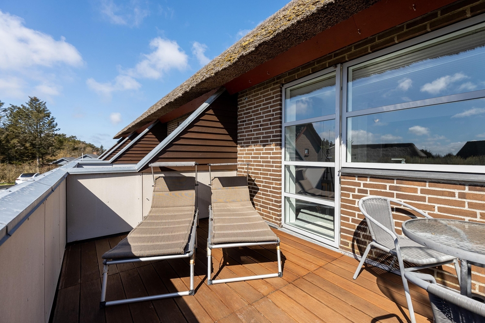 I har også en altan, som I har adgang til fra det ene af ferielejlighedens soveværelser på førstesalen. Her har I også havemøbler til rådighed, og det er det oplagte sted at sidde med dagens første kop kaffe, mens resten af ferieflokken så småt begynder at stå op.