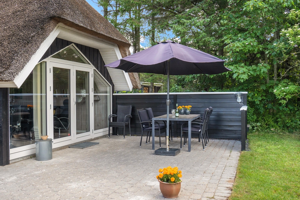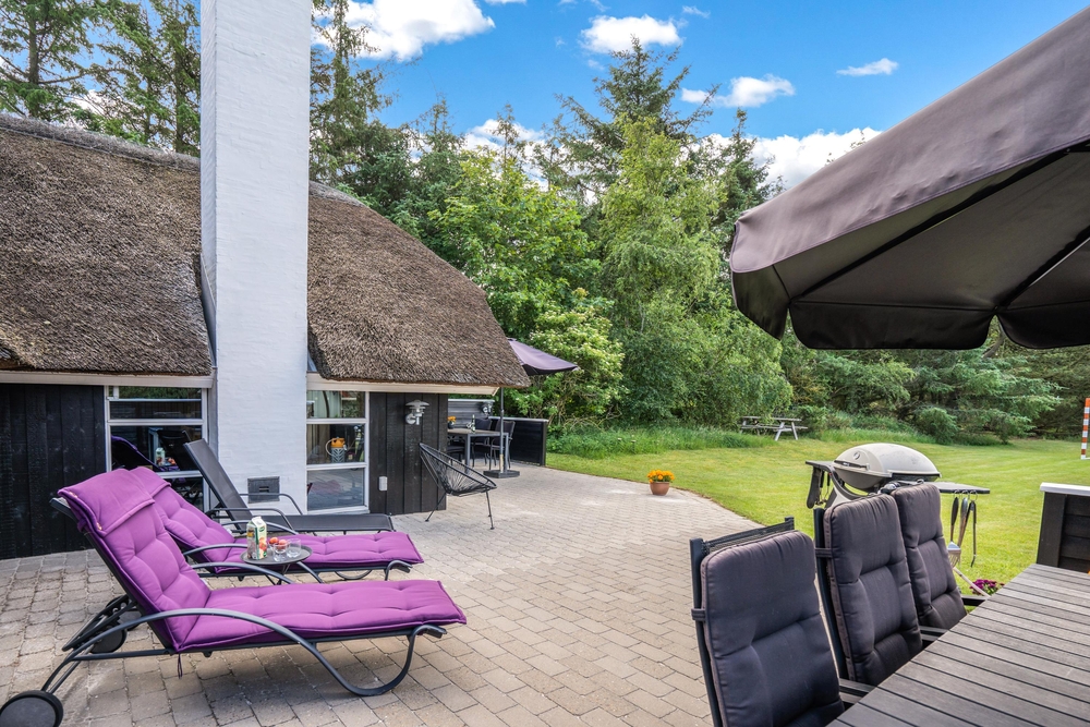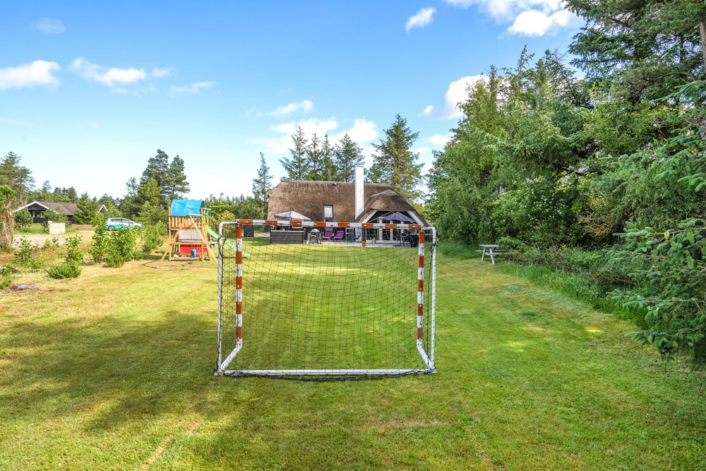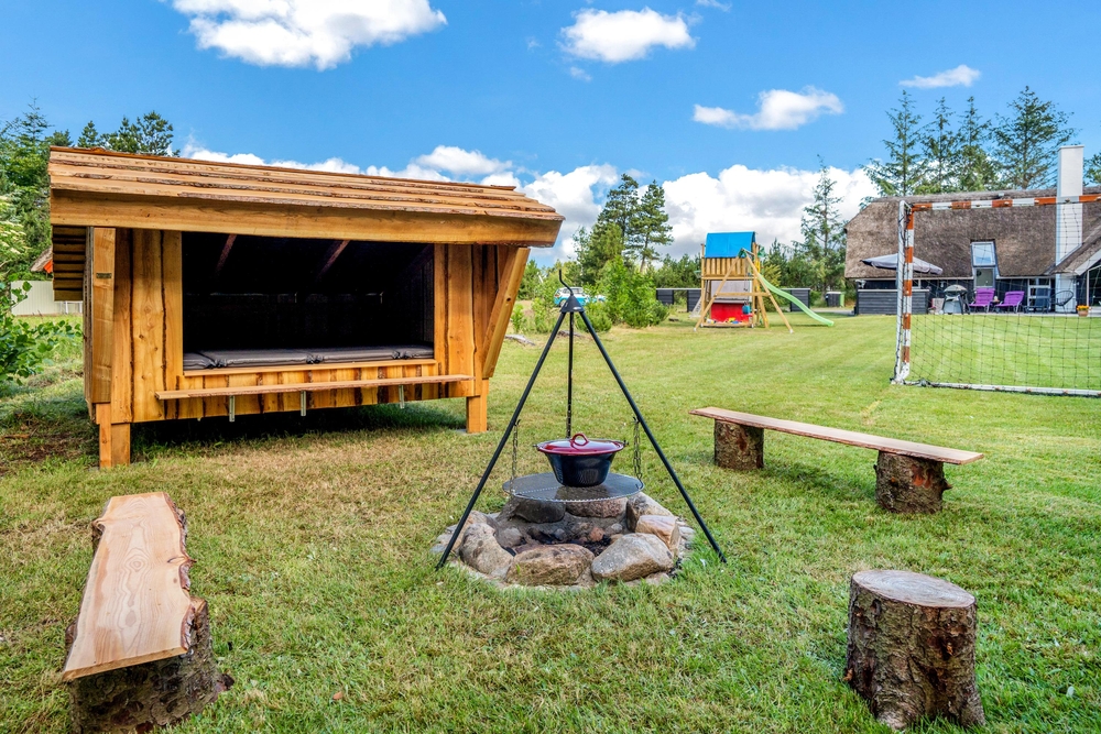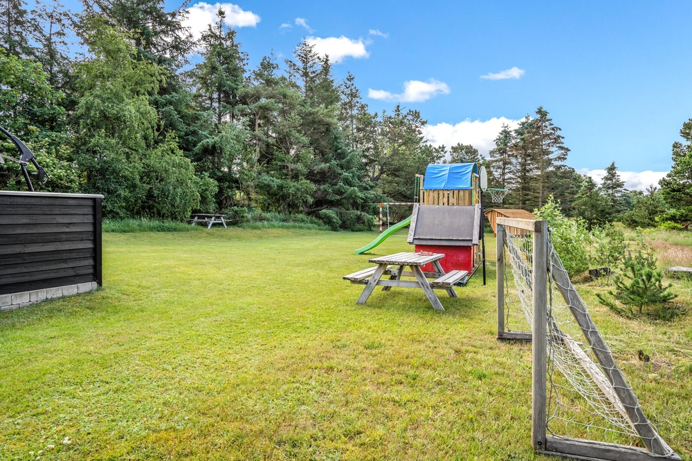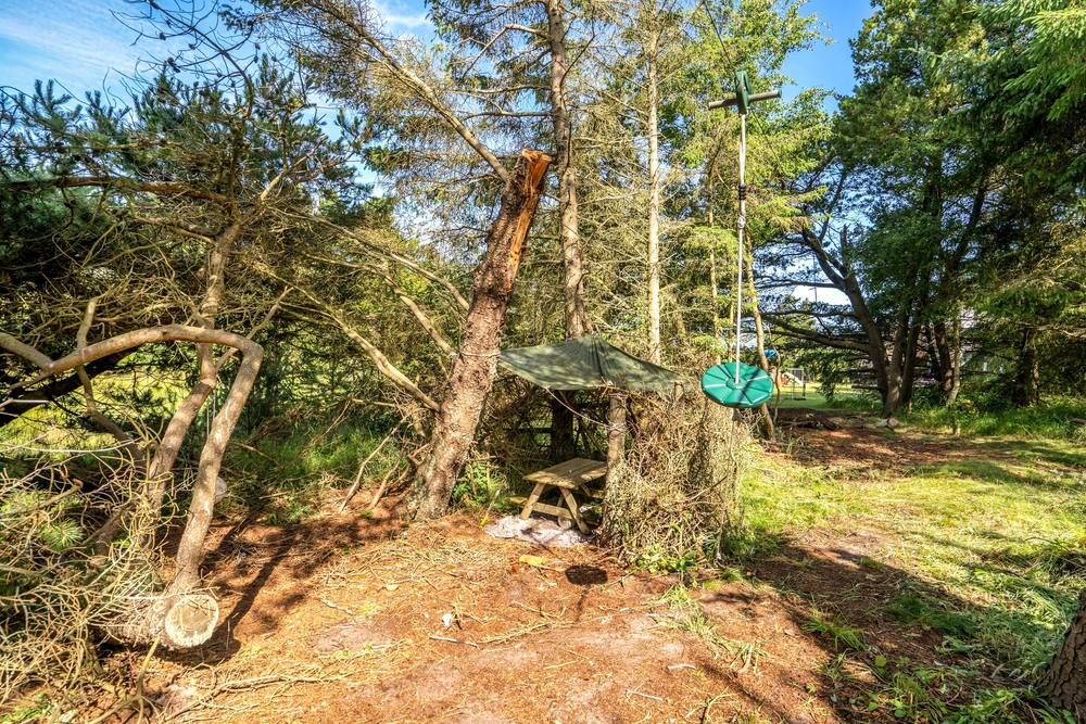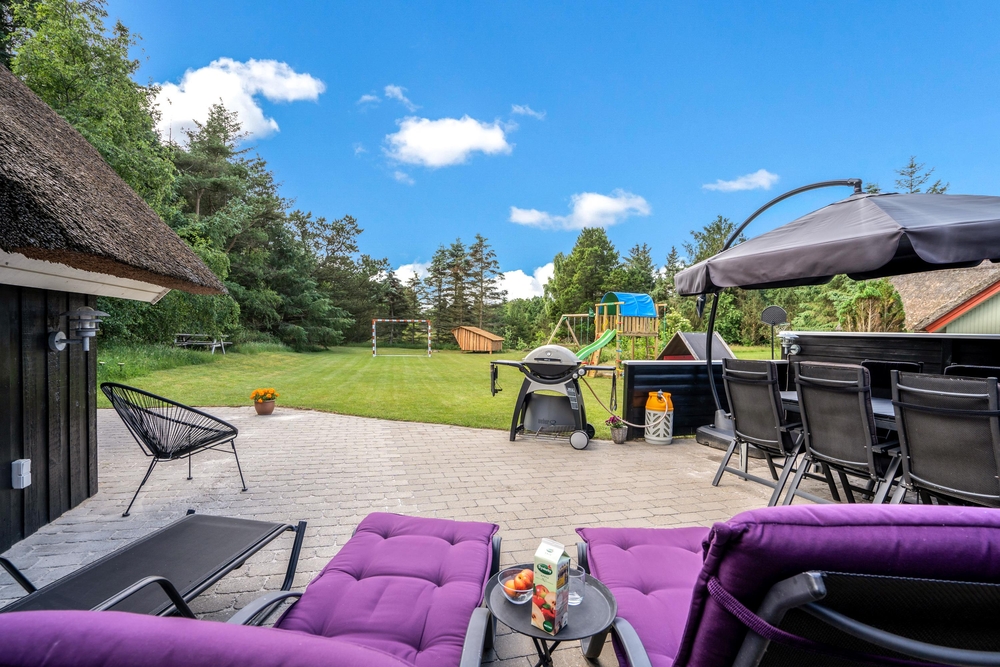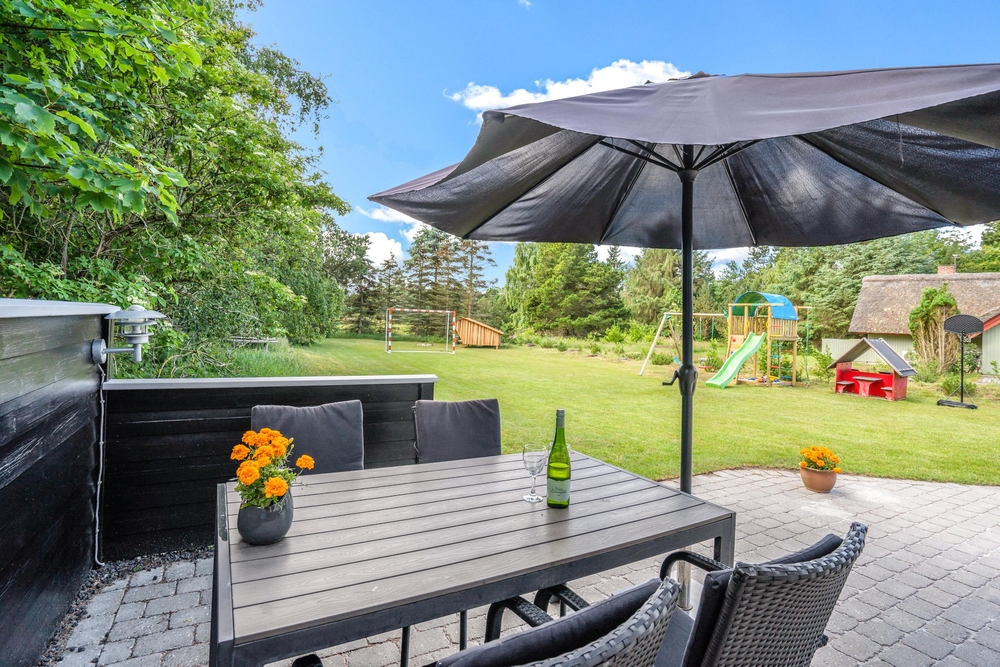 Sommerhusets udeområde er helt perfekt for hele familien. Her har I masser af plads at boltre jer på, og her er noget for alle aldre. På den afskærmede terrasse kan forældrene altid finde sig et solspot, hvor de kan lægge sig til rette med en god bog i de liggestole og havemøbler, der står til jeres rådighed.