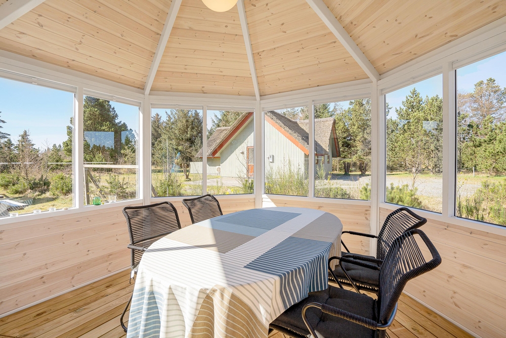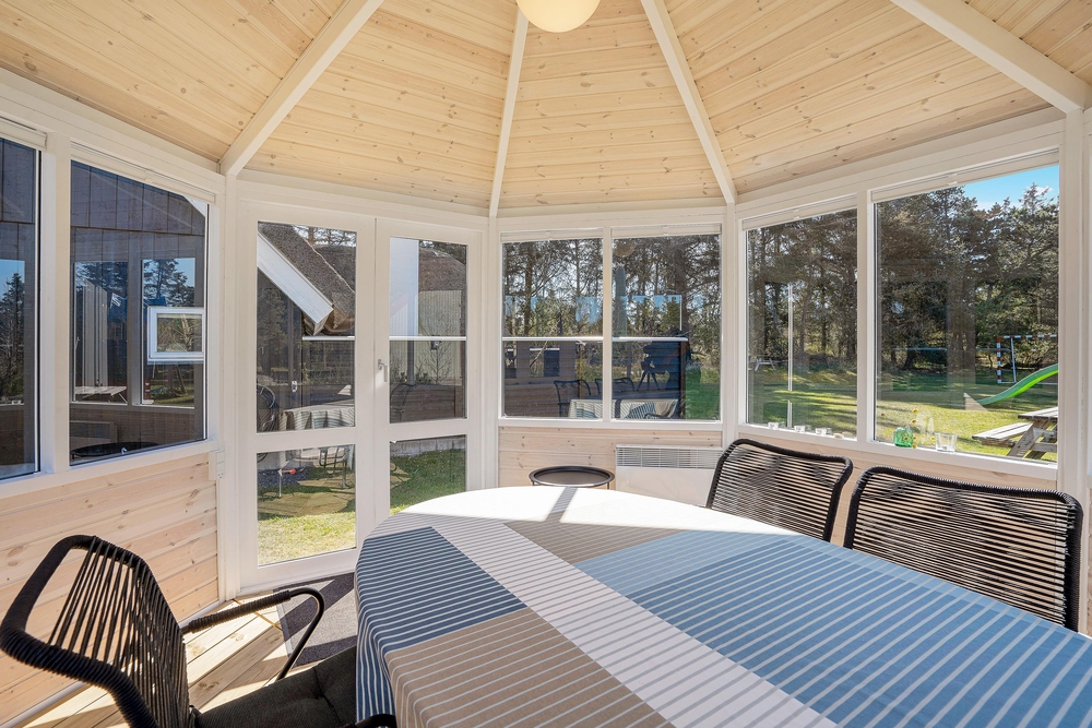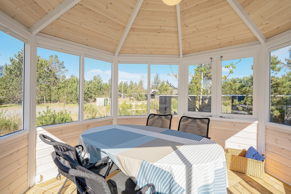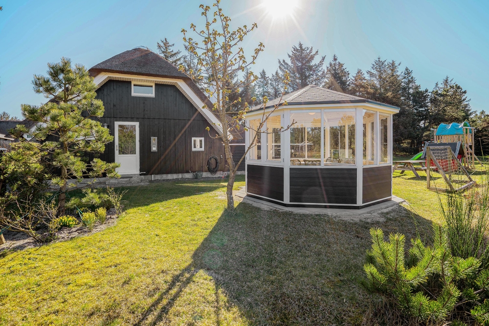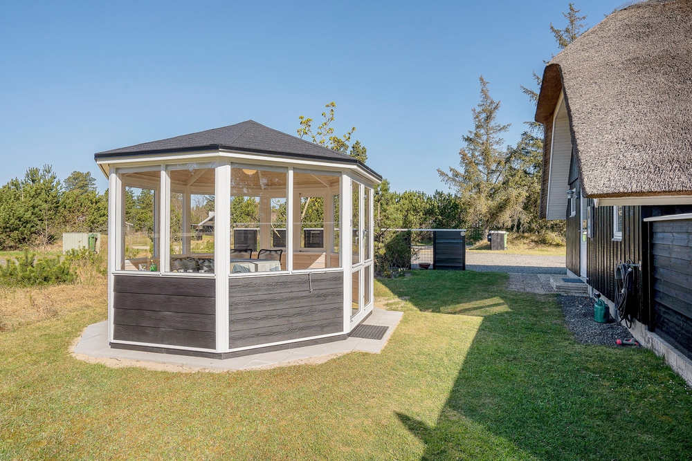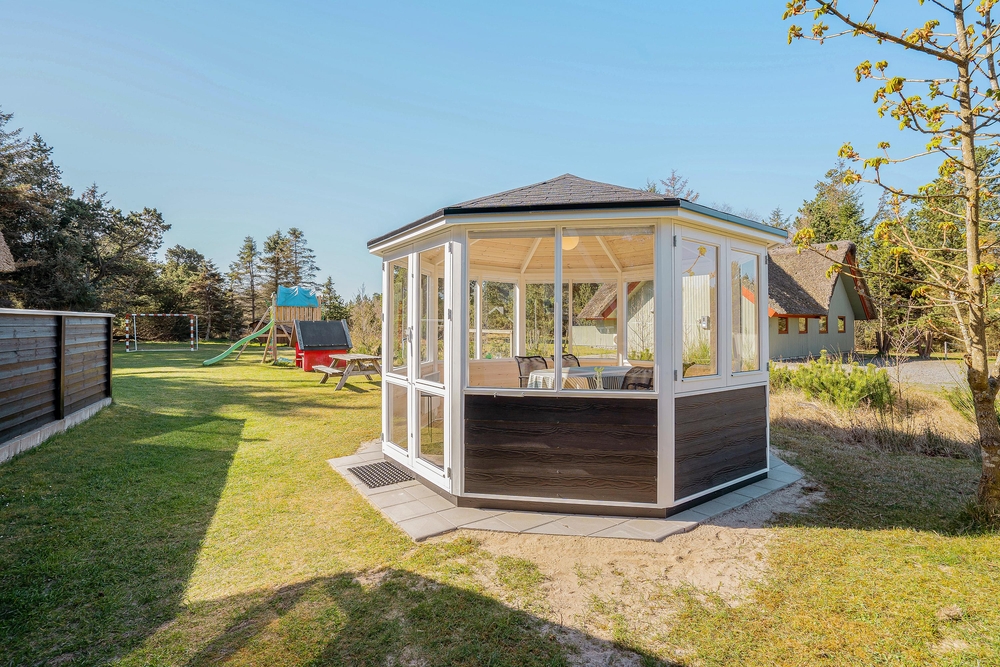 Efter duggen er faldet eller på de køligere dage, kan I søge tilflugt i den smukke pavillon der er bygget på vestsiden af huset. Her er der havemøbler til rådighed, så I kan sidde og nyde udsigten til haven og de mange legefaciliteter til børnene.