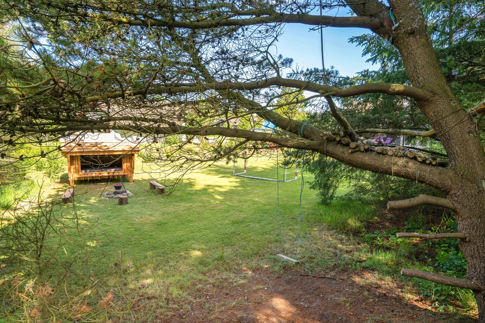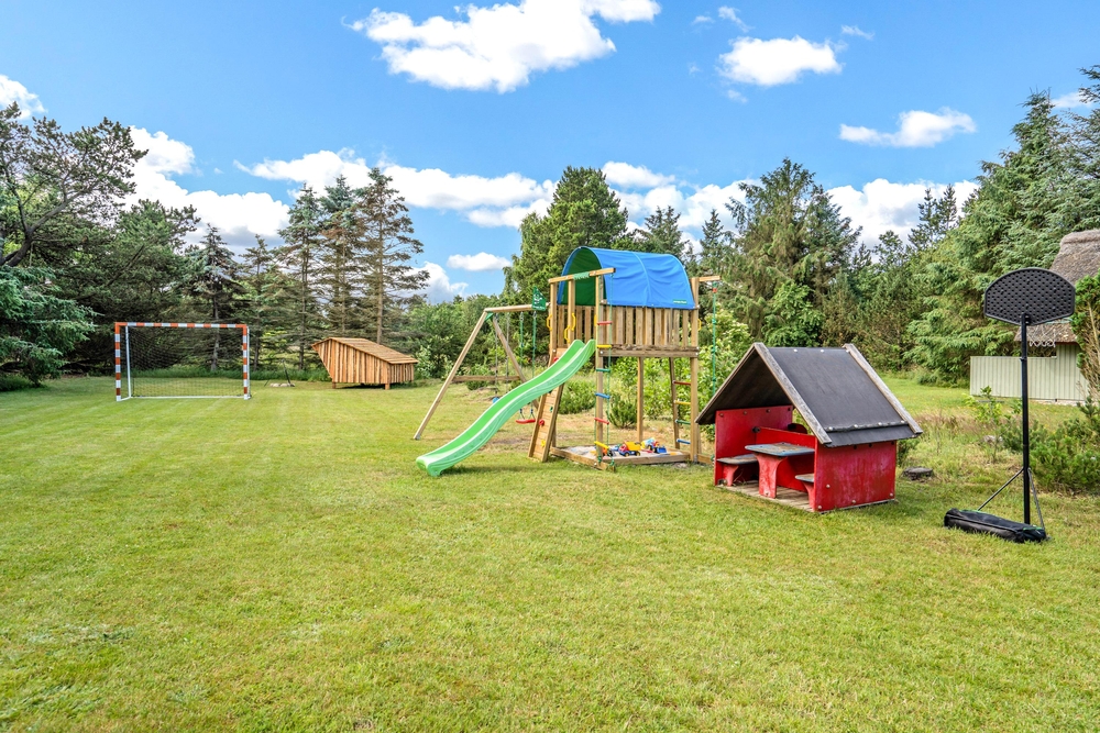 Fra terrassen kan I nyde udsigten til naturen og nyde synet og lyden af jeres børn, der leger og hygger sig i haven, hvor der både er sandkasse, gynge, legetårn og legehus. I haven kan I også spille en fodboldkamp eller 2.