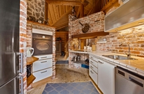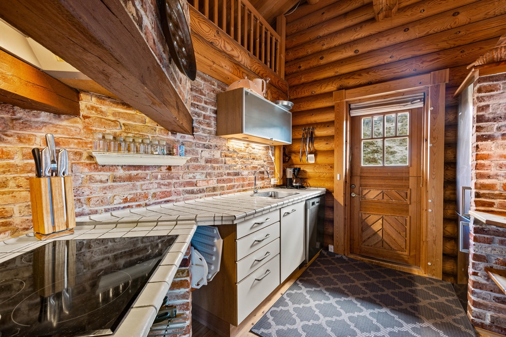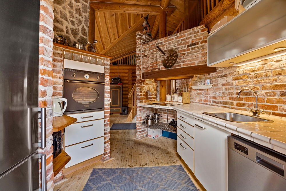 Sommerhuset har, både ude og inde, den gennemførte stil og træet kommer virkelig til sin ret. De mørke træstammer skaber en hyggelig atmosfære, hvor I får lyst til at putte jer i sofaen med en god bog. Stue og køkken er forbundet, og her får I helt sikkert nogle skønne stunder. I midten af rummet er den murede brændeovn, hvorfra varmen og hyggen breder sig. Tilbered en skøn simreret og glem ikke den gode rødvin. Udover brændeovnen er her også en energibesparende varmepumpe, som sørger for et behageligt indeklima.