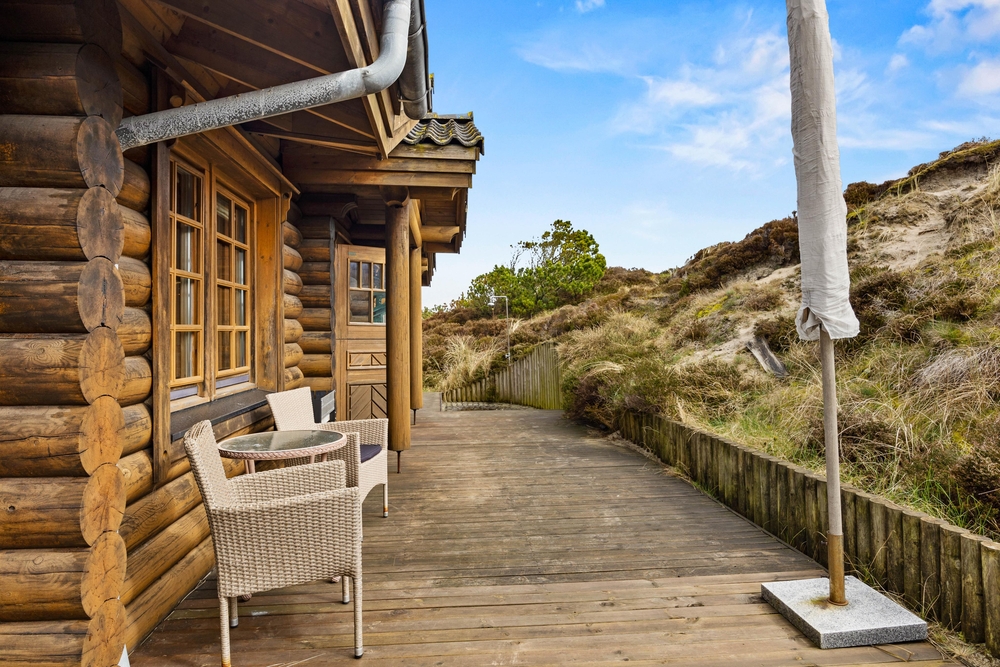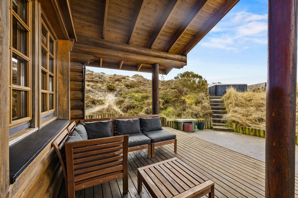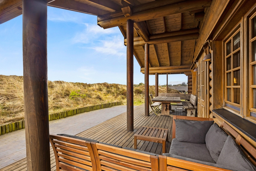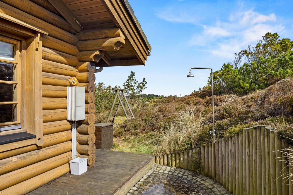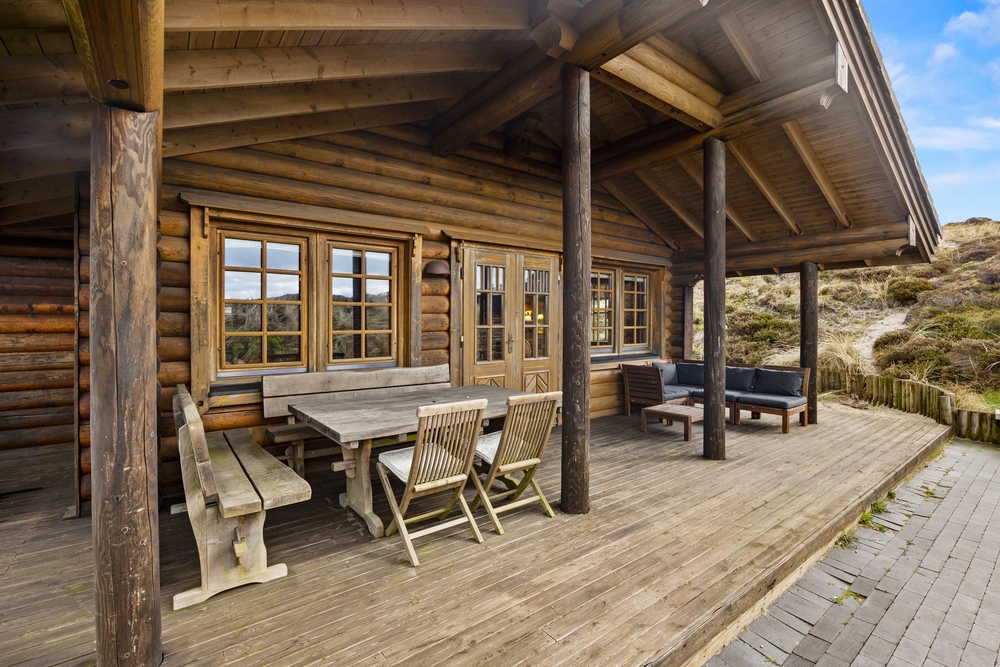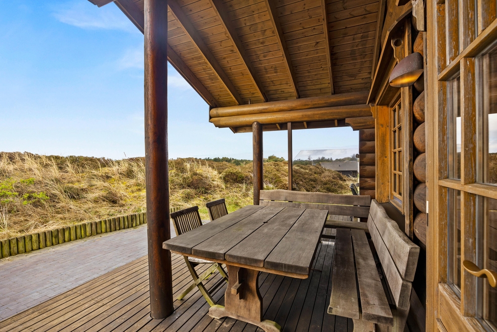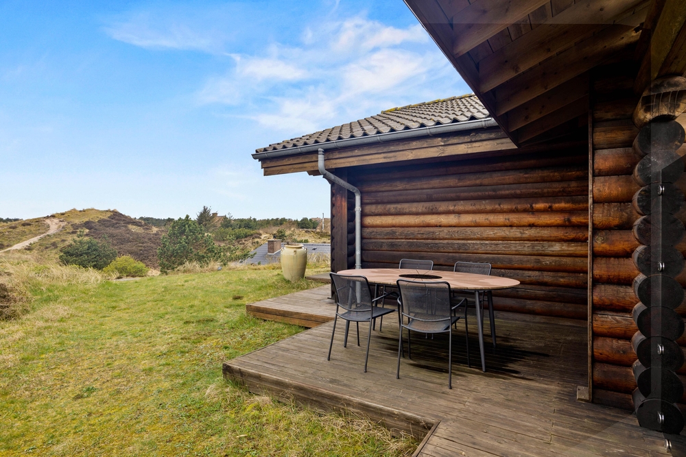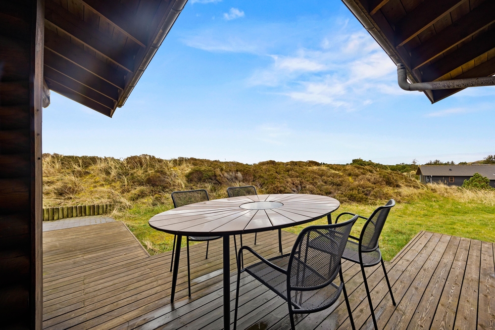 Fra stuen har I adgang til den fine træterrasse, der omkredser feriehuset i midten. På den måde kan I nemt rykke jer og finde et behageligt sted, hvor I kan nyde vejret. Her er plads til afslapning med solbadning, og børnene kan udforske den store naturgrund. Til de yngste finder I desuden også gynger og en sandkasse. Mens der leges, kan der tændes op i grillen. Tilbered en ægte sommermenu og dæk op under terrassens overdækning, hvor I kan nyde maden og den friske luft.
