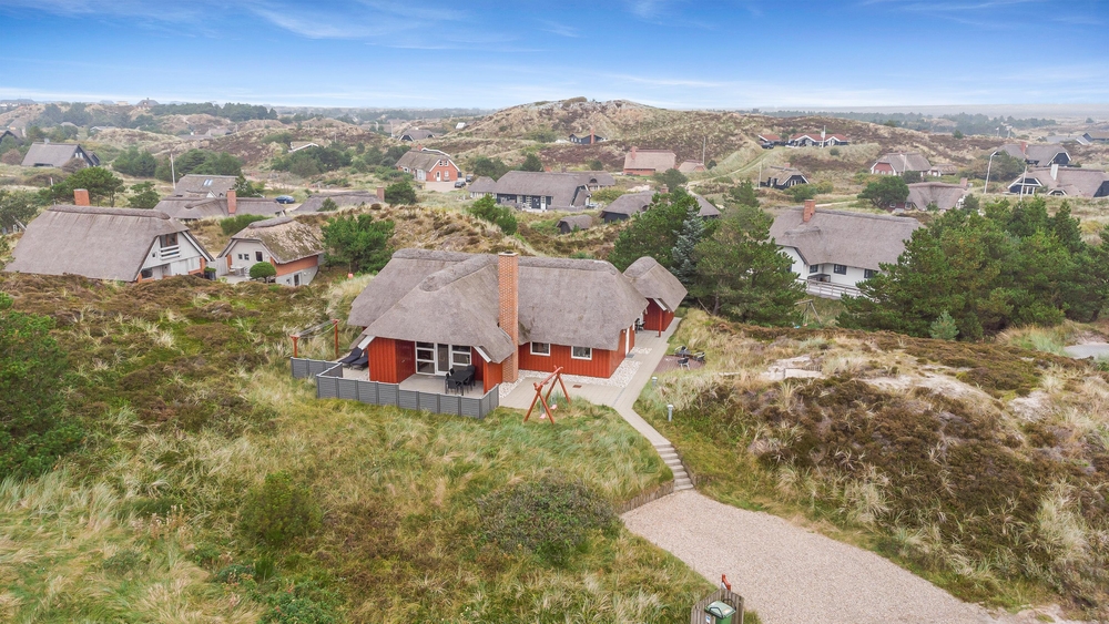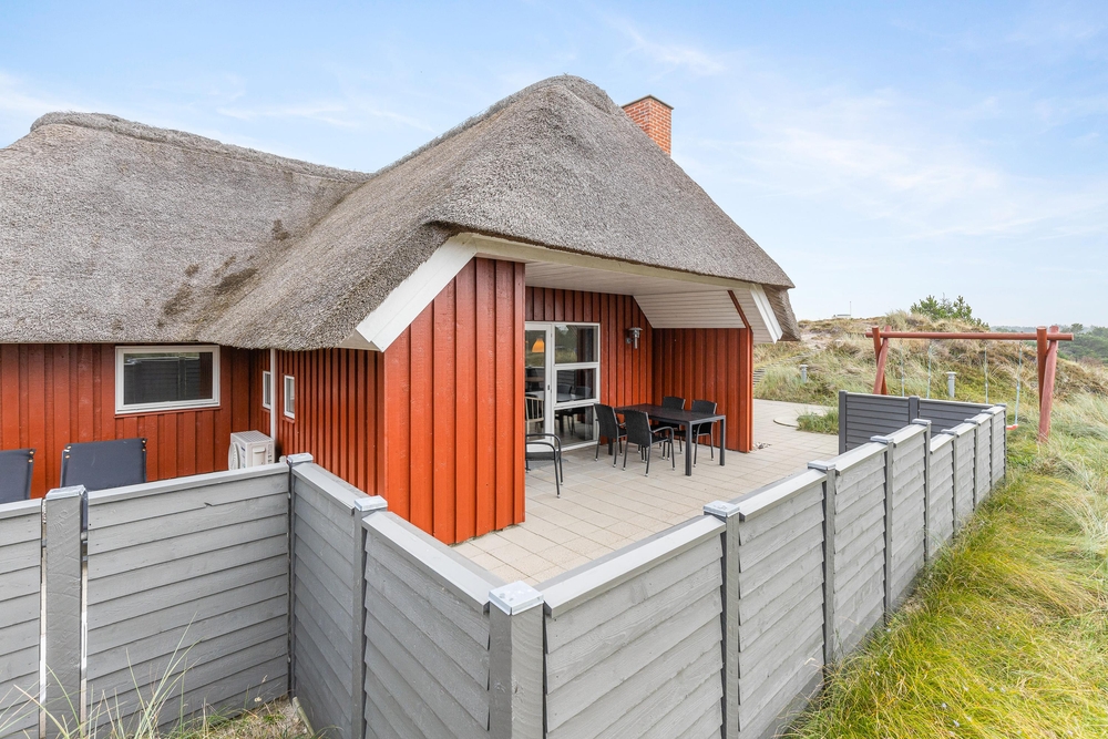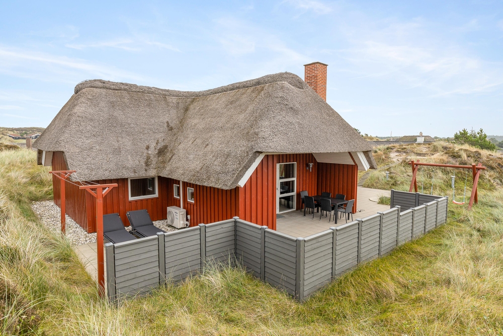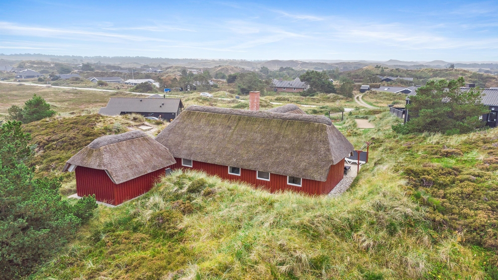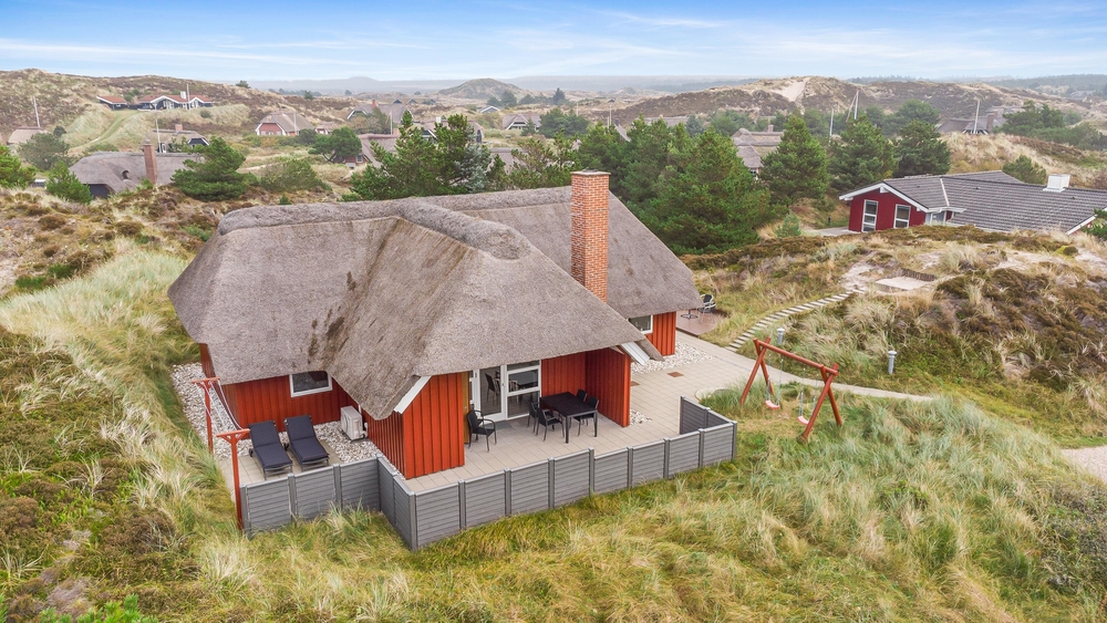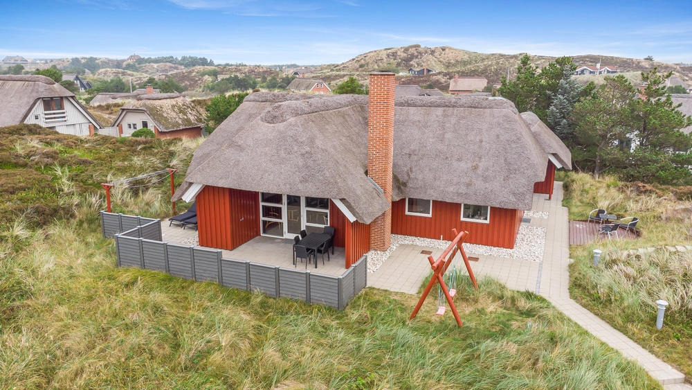Det smukke røde stråtækte sommerhus ligger dejligt centralt med gåafstand til både strand og købmand. Samtidigt er der kælet om hele udearealet. Rundt om sommerhuset er der gode solterrasser, fine hyggekroge og en stor sandkasse samt gynger til børnene. Her i klitterne bliver feriestemningen forstærket med duften af hav, lyng og marehalm.