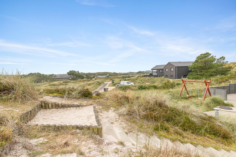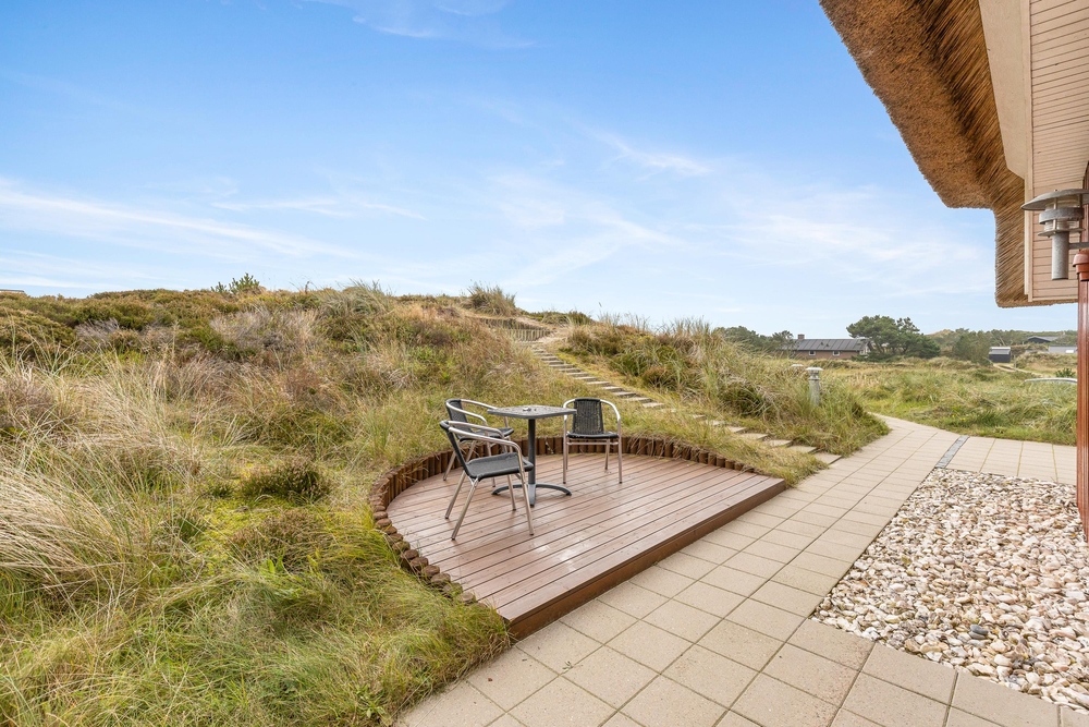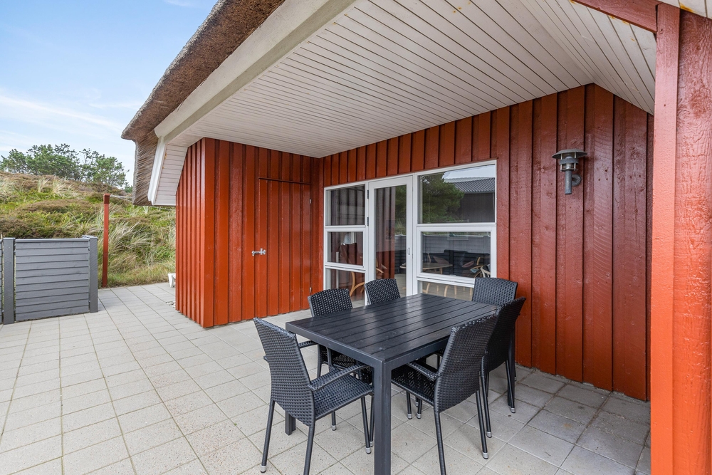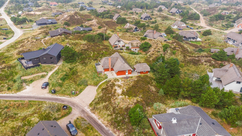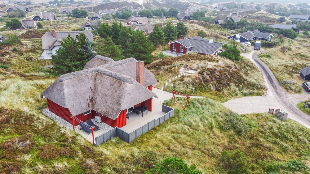 Det smukke røde stråtækte sommerhus ligger dejligt centralt med gåafstand til både strand og købmand. Samtidigt er der kælet om hele udearealet. Rundt om sommerhuset er der gode solterrasser, fine hyggekroge og en stor sandkasse samt gynger til børnene. Her i klitterne bliver feriestemningen forstærket med duften af hav, lyng og marehalm.