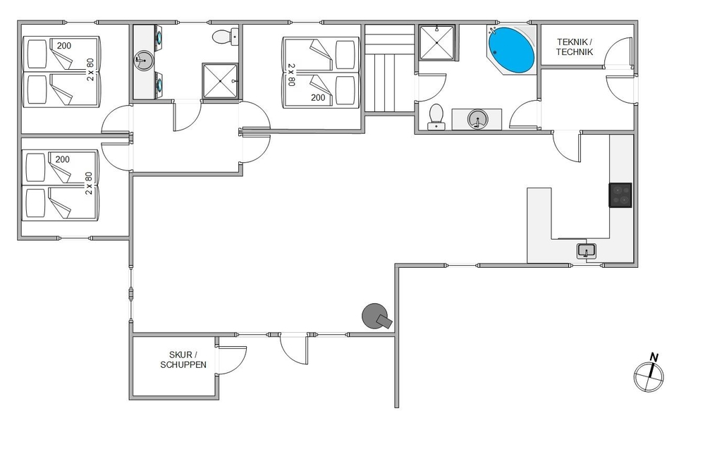 Med 6 gode sovepladser fordelt på 3 soverum med dobbeltsenge er der god plads, også til ferie med et vennepar. Dertil har sommerhuset 2 badeværelser, det ene med vaskemaskine og tørretumbler for det praktiske og det andet med wellnessfaktor med både sauna og spa.