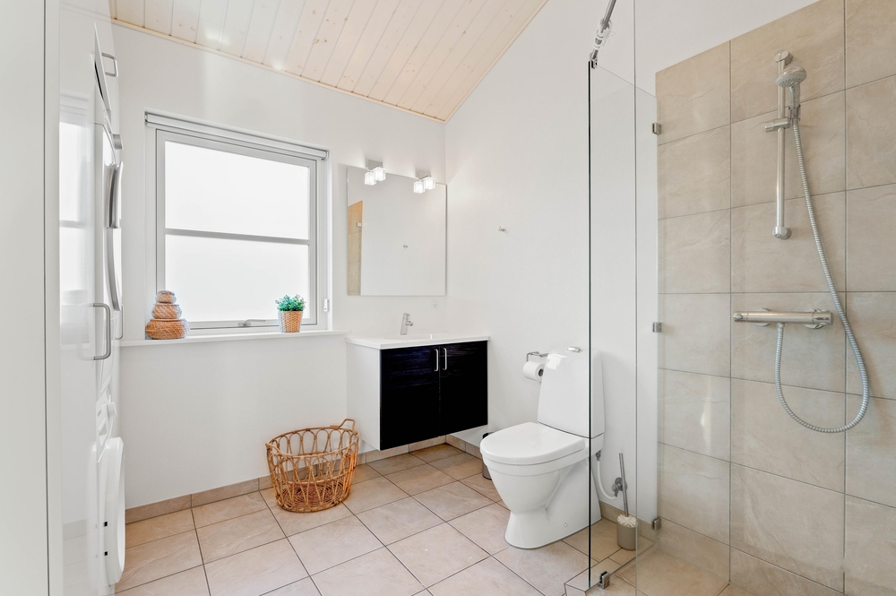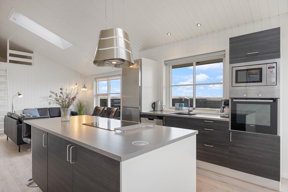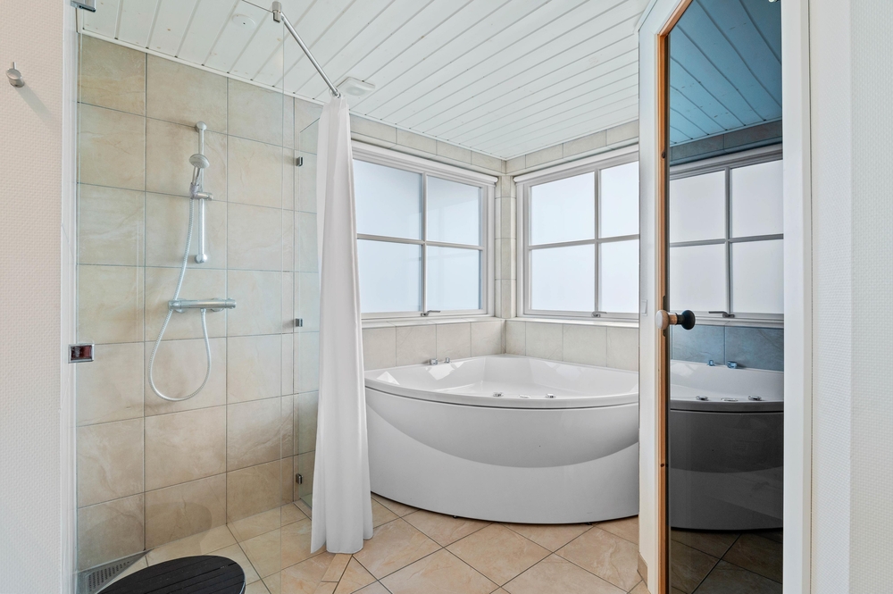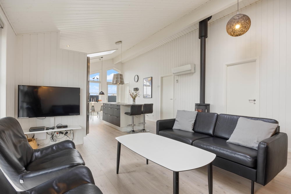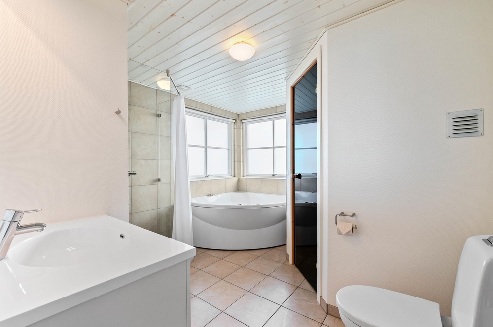 Der er to lækre badeværelser i huset, begge har gulvvarme og en bruseniche. På det mindre badeværelse er der en vaskemaskine og en tørretumbler. På det store badeværelse er der en to personers hjørnespa og en sauna. Køkkenet er placeret mod vest, mellem spiseafdelingen og selve stuen. Her er der en fryser på 225 L, en mikroovn og en opvaskemaskine. Stuen er møbleret med praktiske lædermøbler, et stort fladskærms-TV, en DVD, radio m/CD-afspiller, en brændeovn, gratis trådløst internet og en energibesparende varmepumpe. Det er tilladt at medbringe en enkelt hund i dette sommerhus.