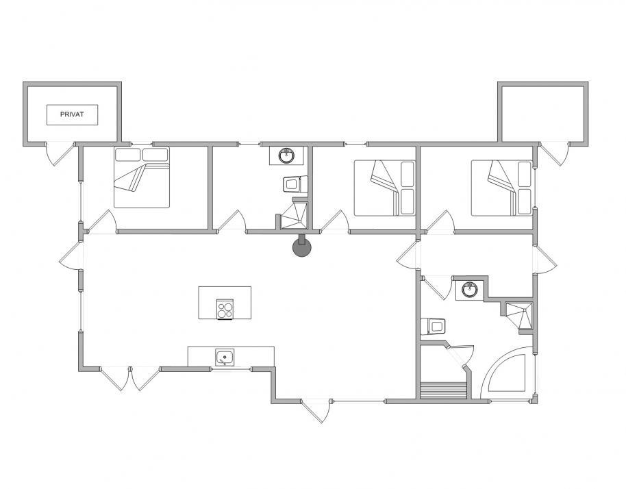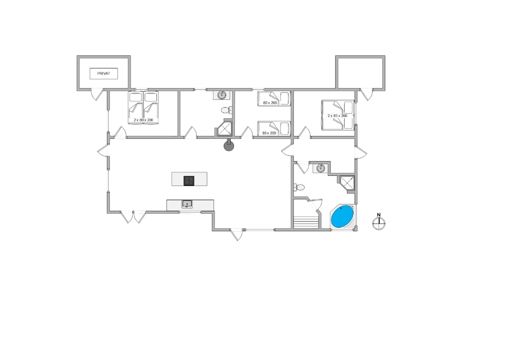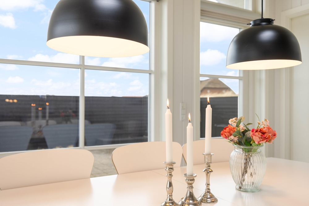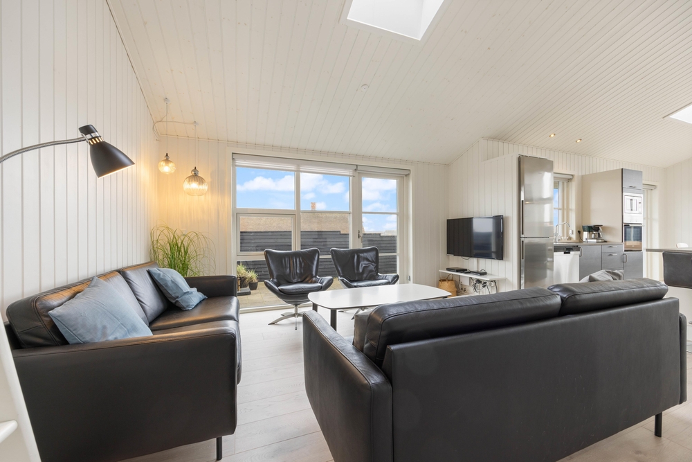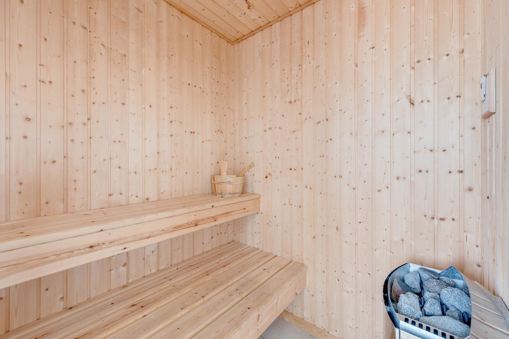 Der er to lækre badeværelser i huset, begge har gulvvarme og en bruseniche. På det mindre badeværelse er der en vaskemaskine og en tørretumbler. På det store badeværelse er der en to personers hjørnespa og en sauna. Køkkenet er placeret mod vest, mellem spiseafdelingen og selve stuen. Her er der en fryser på 225 L, en mikroovn og en opvaskemaskine. Stuen er møbleret med praktiske lædermøbler, et stort fladskærms-TV, en DVD, radio m/CD-afspiller, en brændeovn, gratis trådløst internet og en energibesparende varmepumpe. Det er tilladt at medbringe en enkelt hund i dette sommerhus.