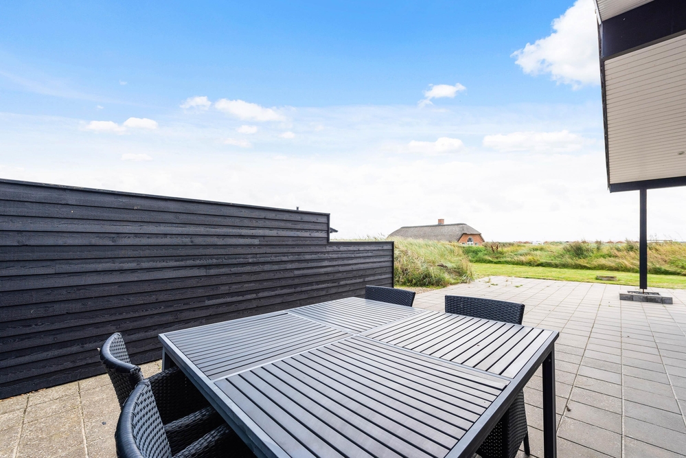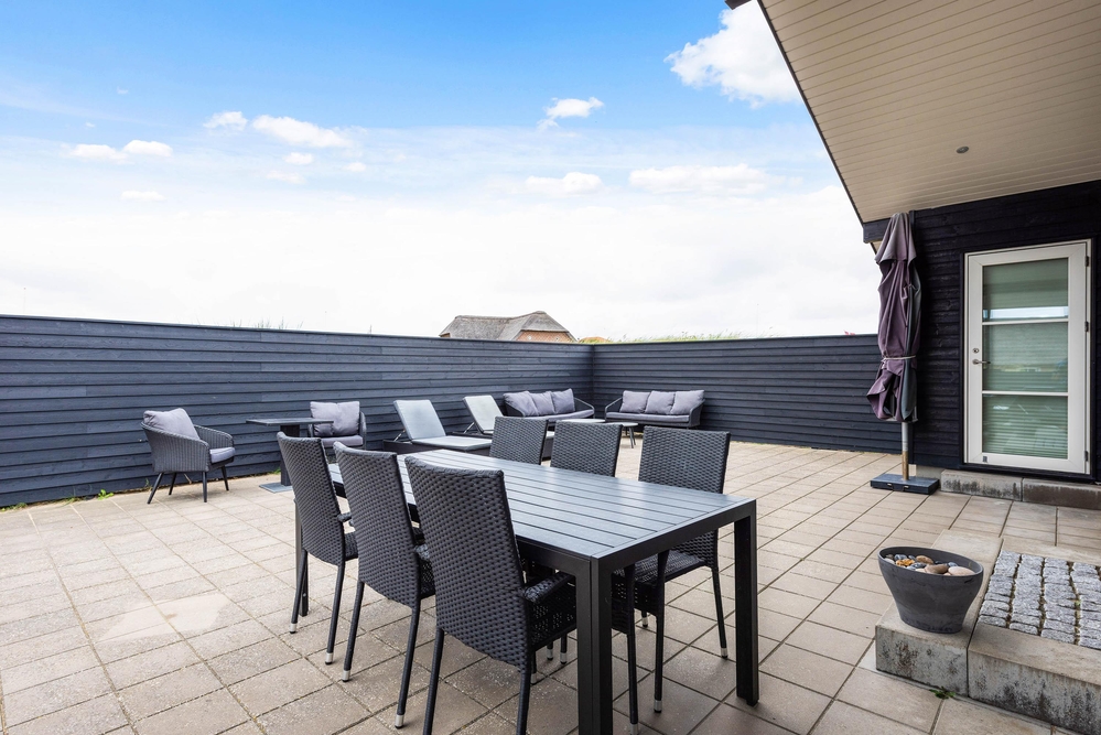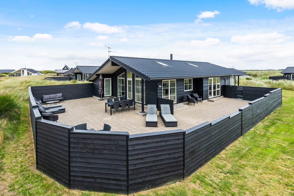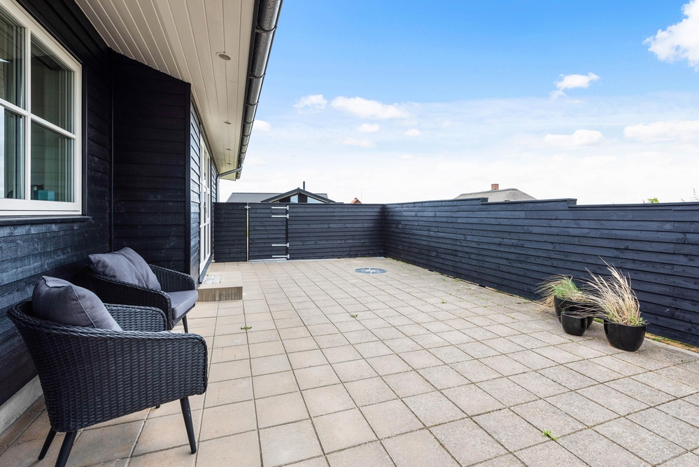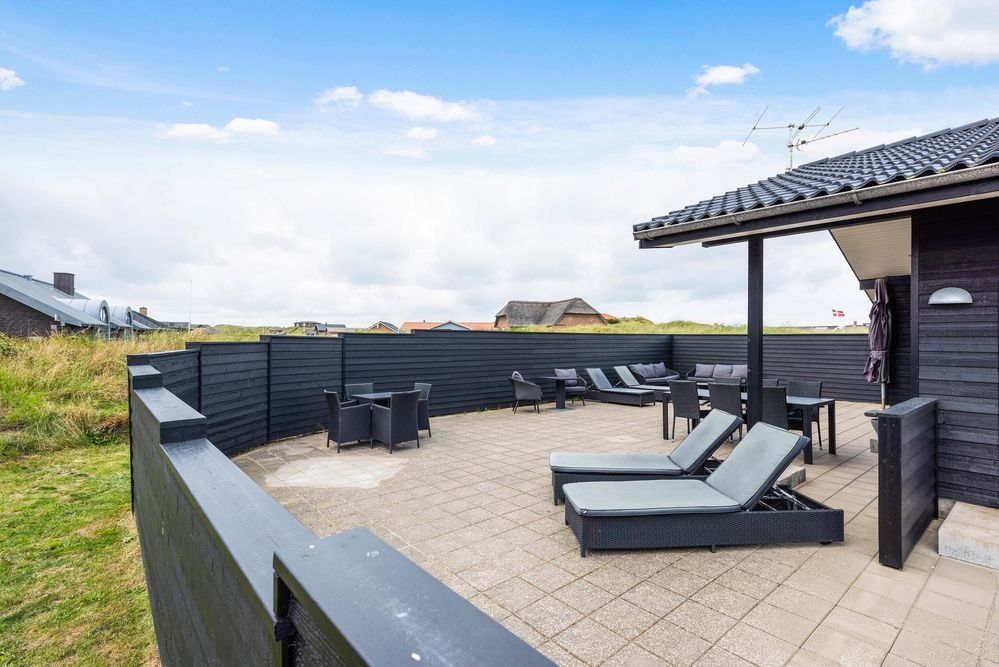 Mod vest er der en skøn og stor og helt lukket terrasse, mod syd er terrassen åben og mod øst er den delvist afskærmet og delvist overdækket. Der er en jordvold omkring grunden mod syd, mod vest og mod nord, uden at det ødelægger udsigten mod golfbanen eller udsigten over klitlandskabet mod vest. Søndervig centrum er kun ca. 1500 m fra sommerhuset, og Vesterhavet kun 300 m væk. Og er man golfspiller, ligger der en skøn 18-hullers golfbane 100 m fra huset.