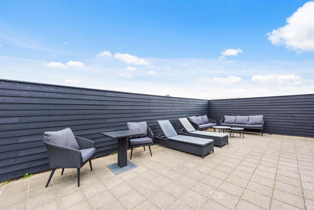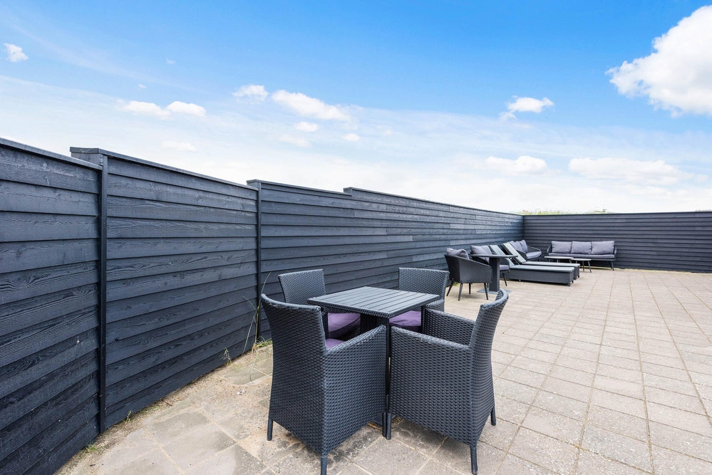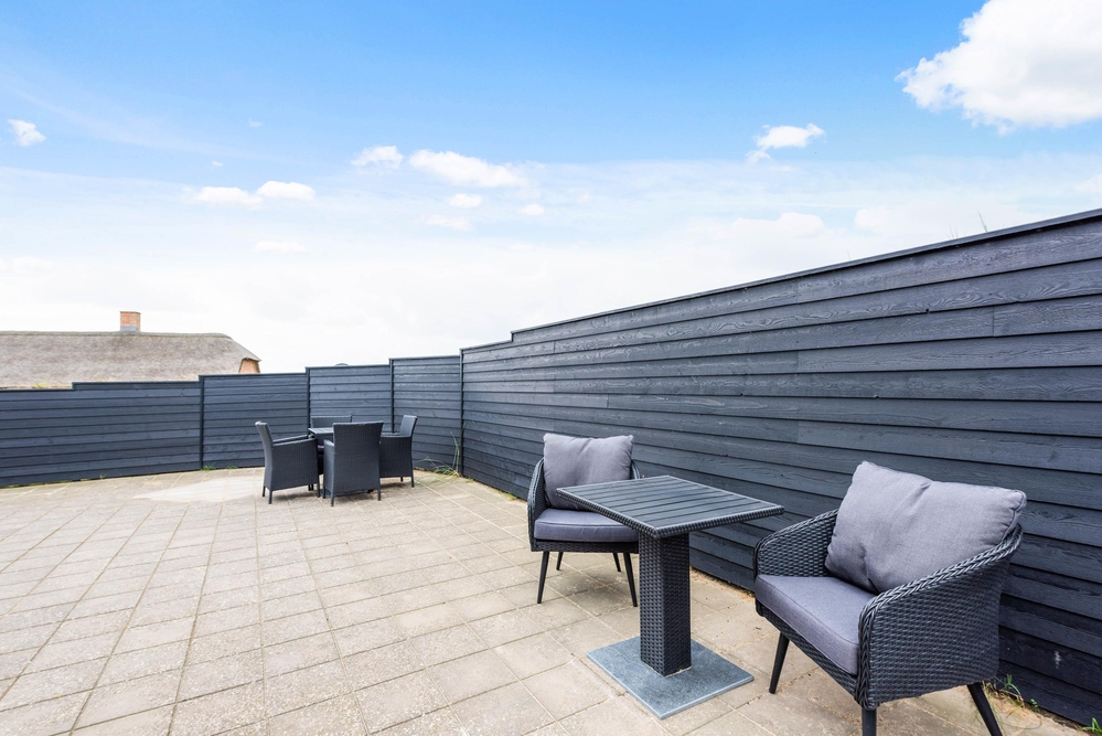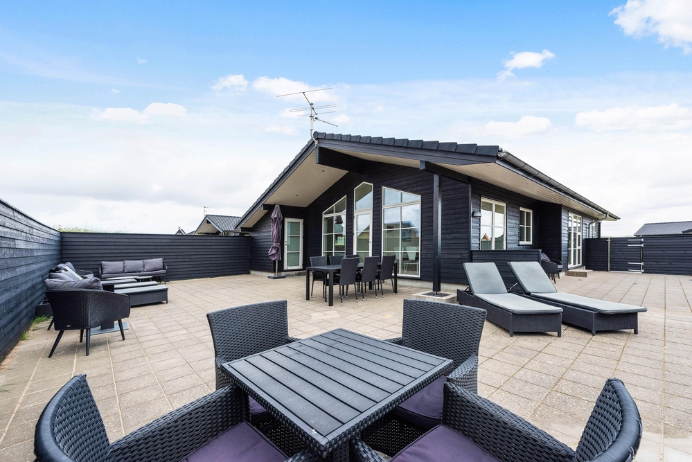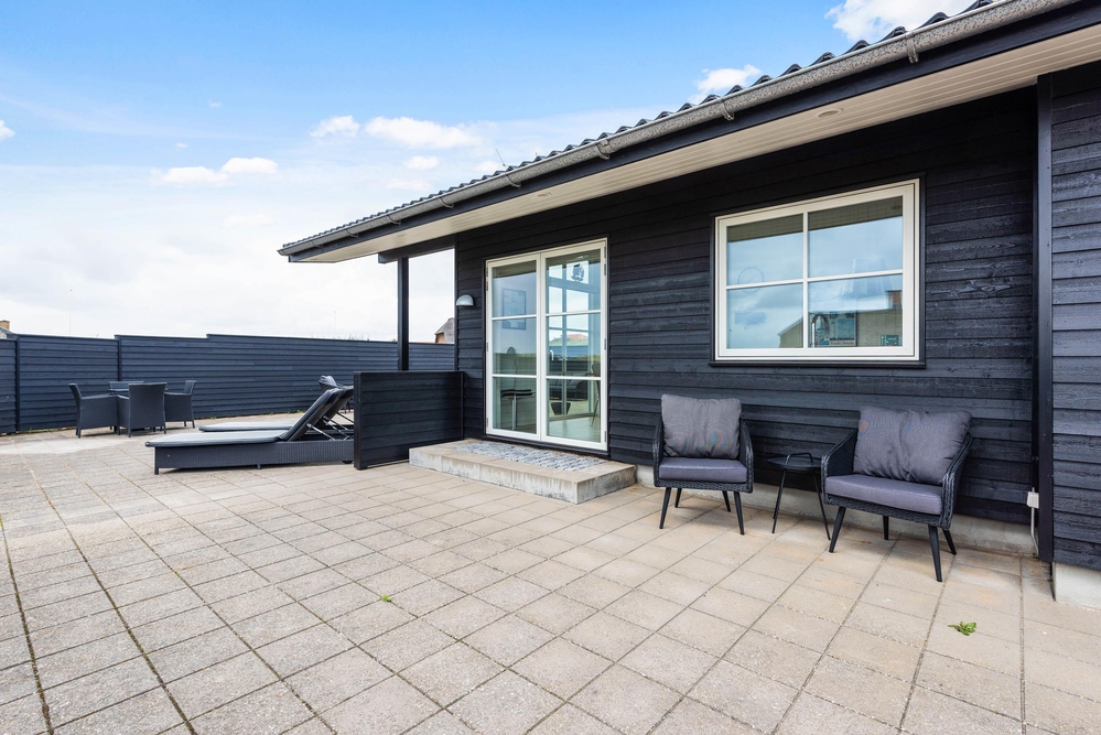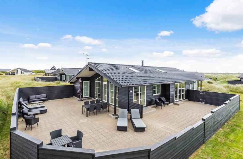 Mod vest er der en skøn og stor og helt lukket terrasse, mod syd er terrassen åben og mod øst er den delvist afskærmet og delvist overdækket. Der er en jordvold omkring grunden mod syd, mod vest og mod nord, uden at det ødelægger udsigten mod golfbanen eller udsigten over klitlandskabet mod vest. Søndervig centrum er kun ca. 1500 m fra sommerhuset, og Vesterhavet kun 300 m væk. Og er man golfspiller, ligger der en skøn 18-hullers golfbane 100 m fra huset.