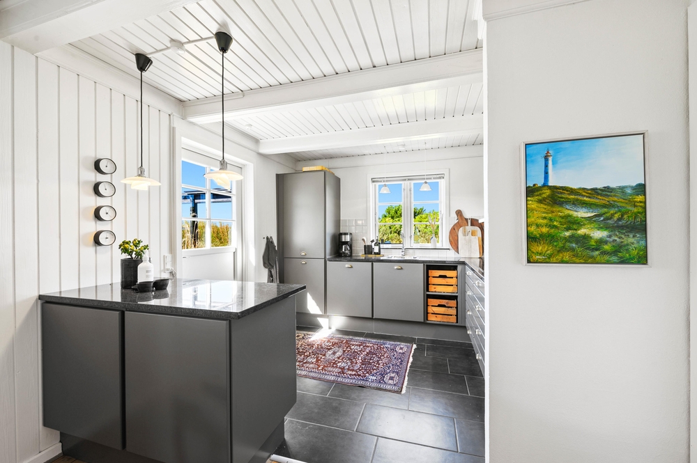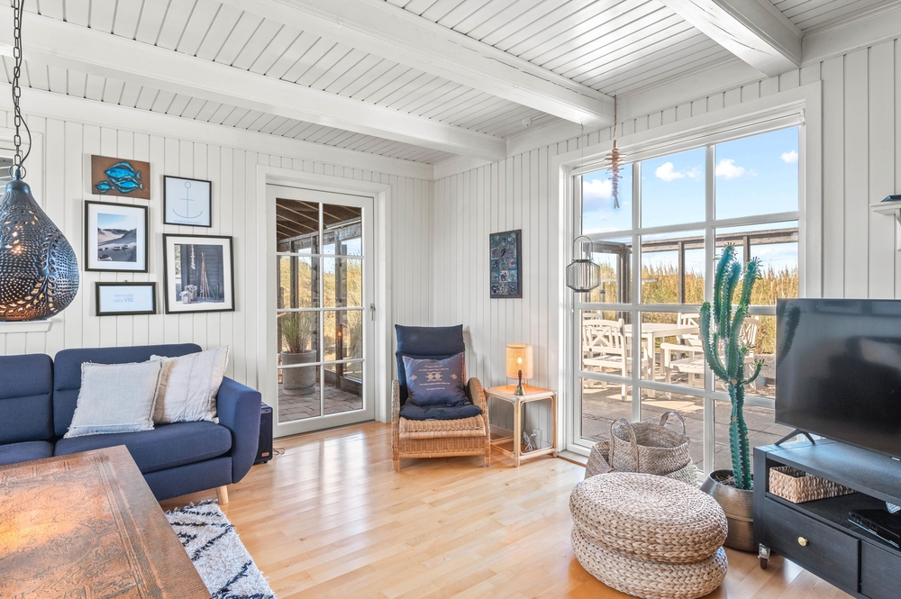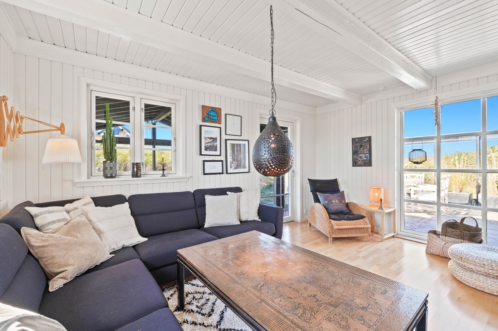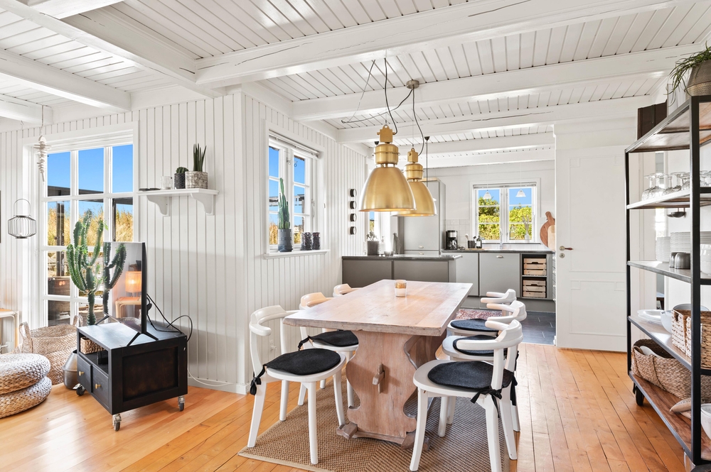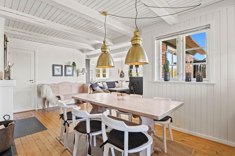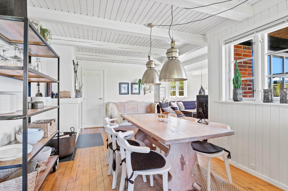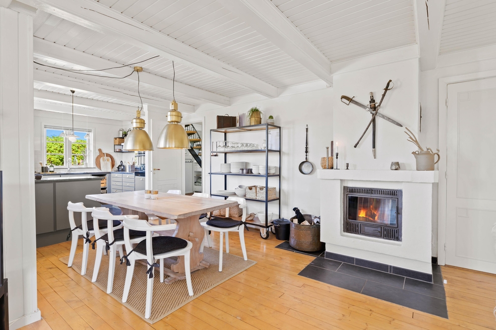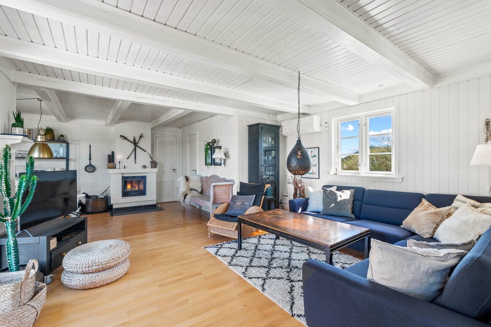 Med 129m2 har I god plads i dette bindingsværkshus. Huset er smukt indrettet med en fin blanding af romantisk nostalgi og moderne med hvidmalede lofter og vægge og lyse møbler. En smuk indbygget kamin afrunder billedet og skaber en dejlig varm stemning. Foruden den herlige udestue med stengulv og udsigt til klitterne.