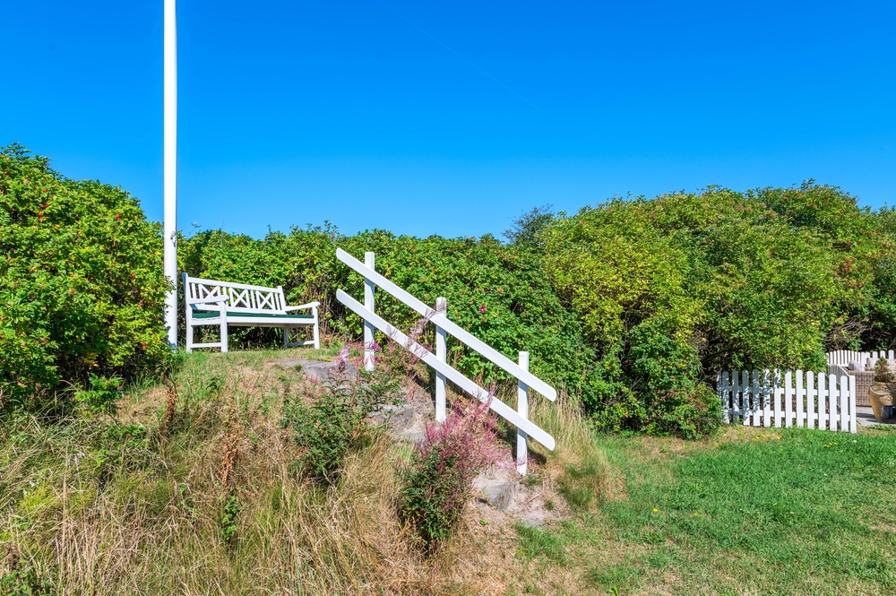 Rund om feriehuset har I en skøn grund med masser af plads og blandt andet et stort separat redskabsrum. Helt fantastisk er husets syd-vest-terrasse. Da terrassen er omgivet af glasvægge, der åbner for et fint udsyn og lukker sol og lys ind, har I her altid dejlig læ for vinden, der af og til godt kan bide lidt herude ved Vesterhavet. I den skønne udestue finder I også en terrassevarmer, der hjælper jer med at holde varmen i de kolde årstider.